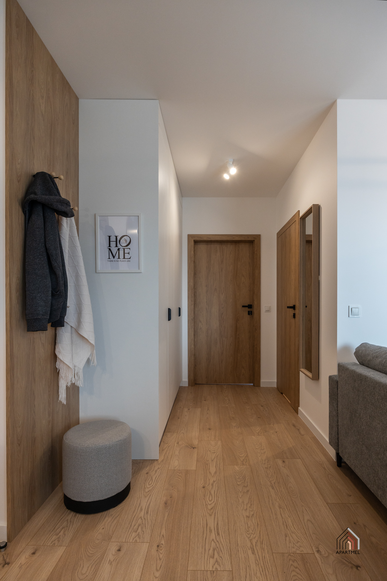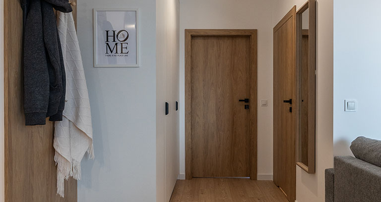 Strefa wejściowa z szafą ubraniową z wieszakami oraz gospodarczą, wyposażoną w odkurzacz, rozkładaną suszarkę, deskę do prasowania, żelazko oraz mop. Na podłogach położone są dobrej jakości panele o podwyższonej odporności.