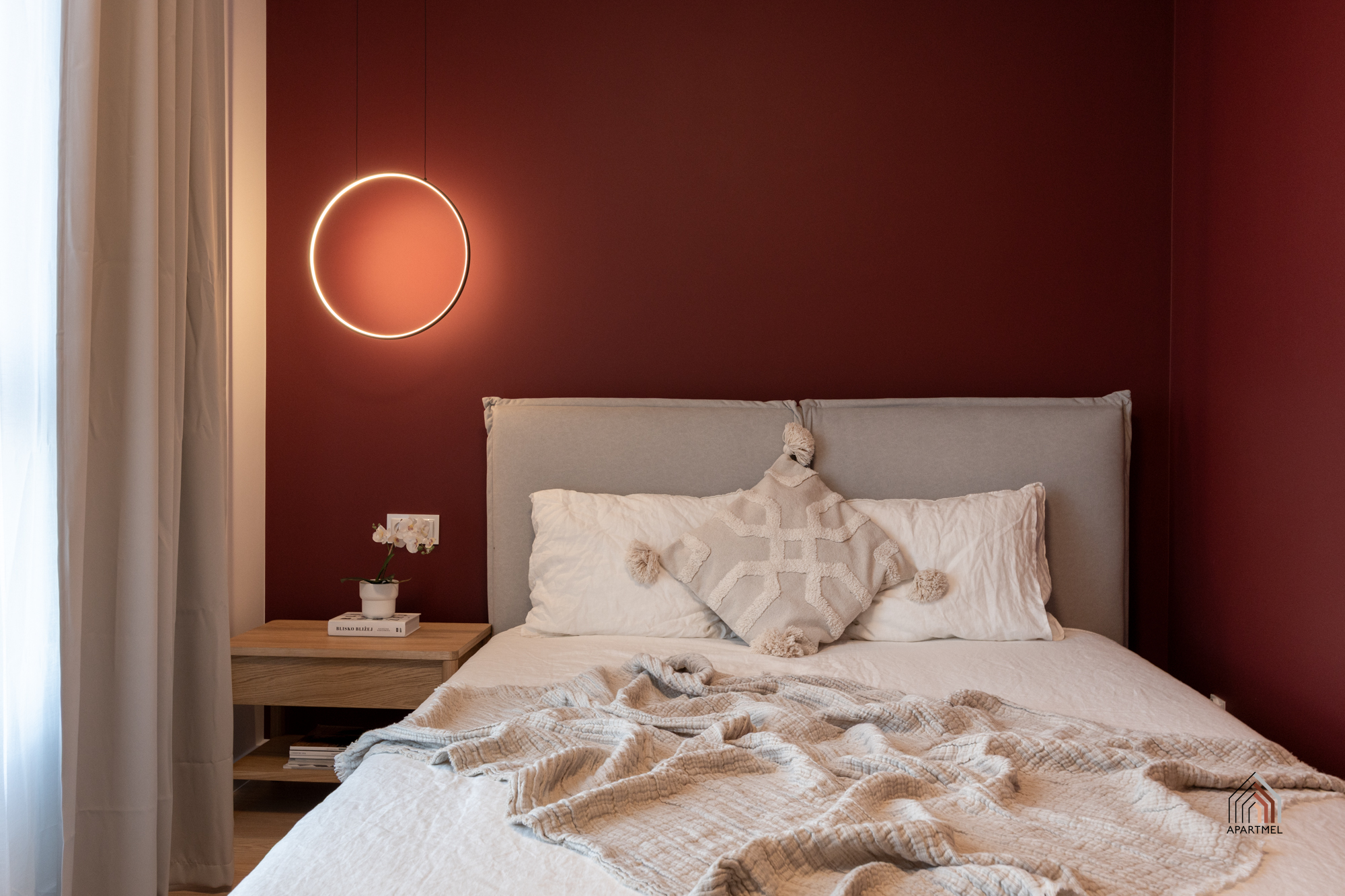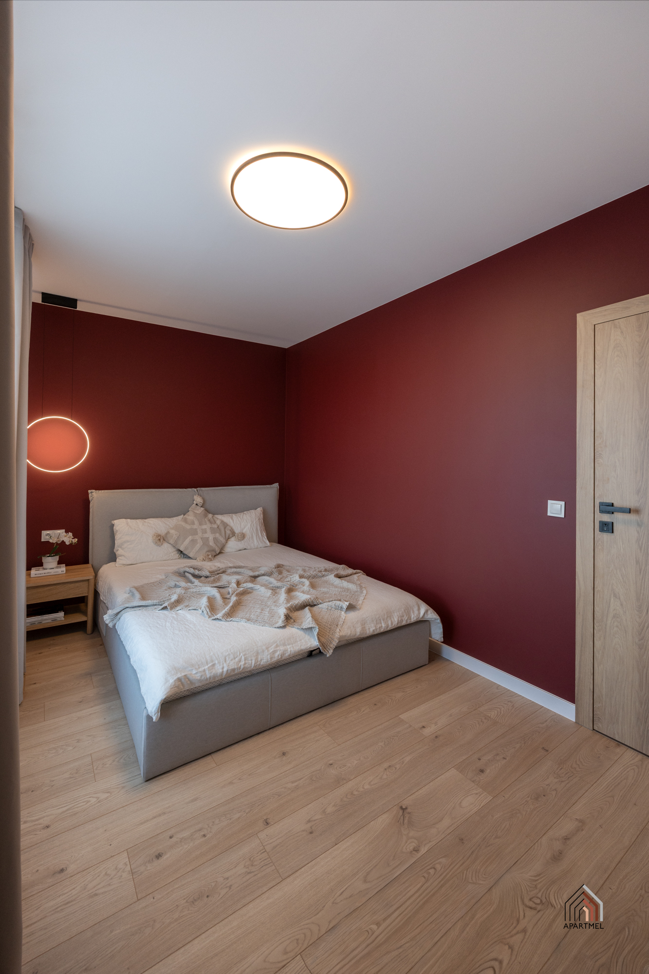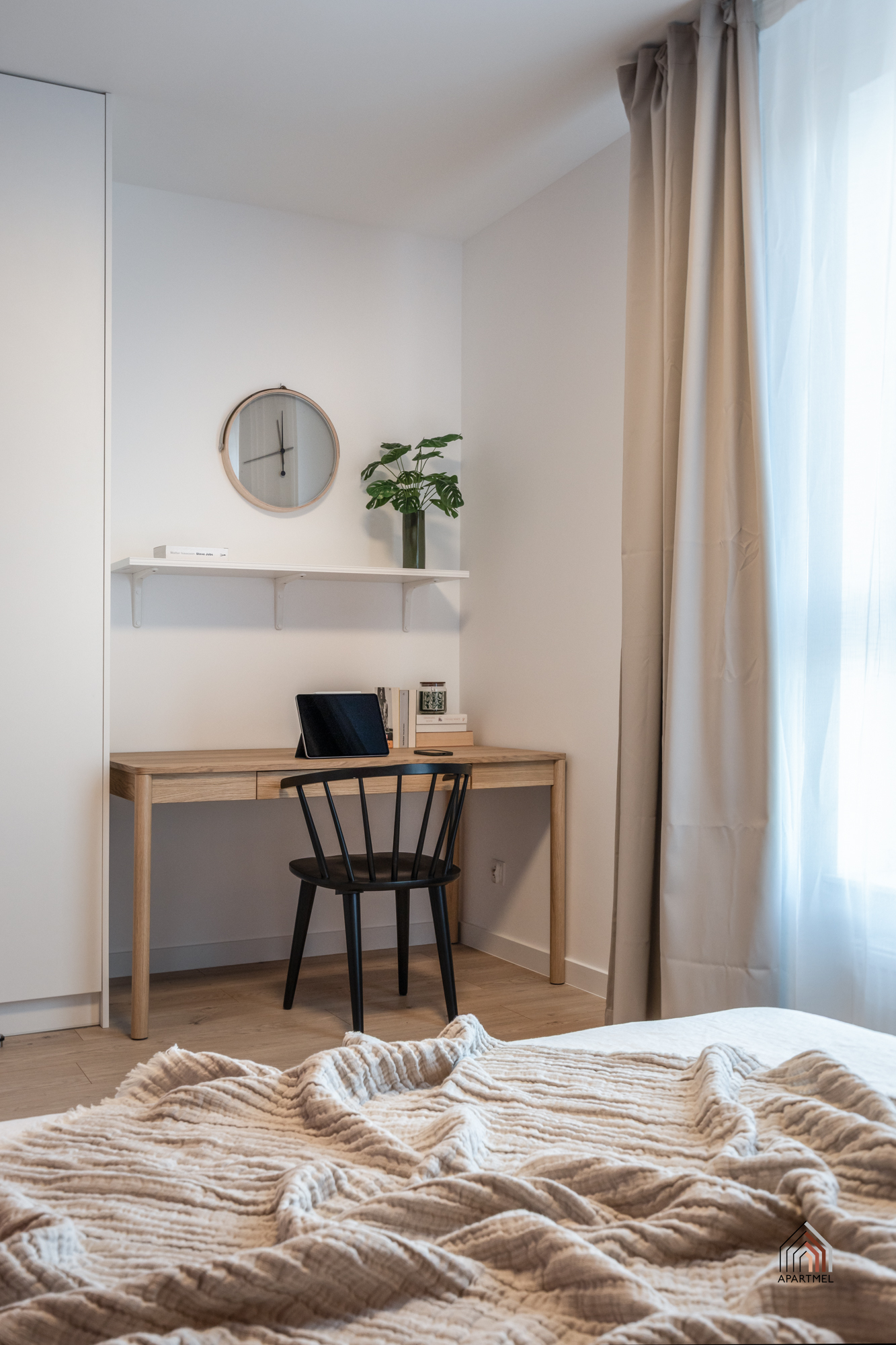 Sypialnia w stylu boho posiada wygodne łóżko kontynentalne z zagłówkiem i dużą skrzynią na pościel, a także wsad pościelowy tj. kołdra i dwie poduszki, bardzo pojemną szafę z regałem, biurko z krzesłem. Obok łóżka szafki nocne, lampki oraz gniazdka, w oknach firanki i zasłony.