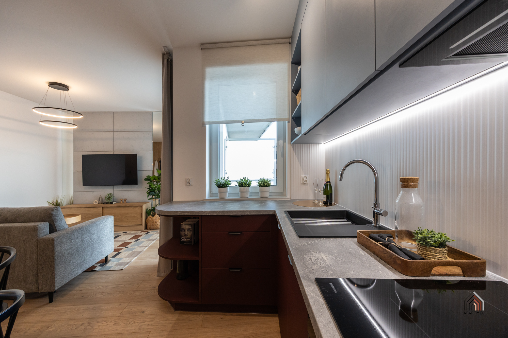 W salonie znajduje się rozkładana sofa narożna, stolik kawowy, szafka RTV i podwieszany telewizor 55" Samsung 4K Smart TV, stół i 4 krzesła. W dużych oknach balkonowych delikatne firanki i lekkie zasłony.