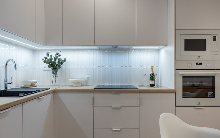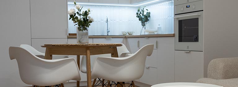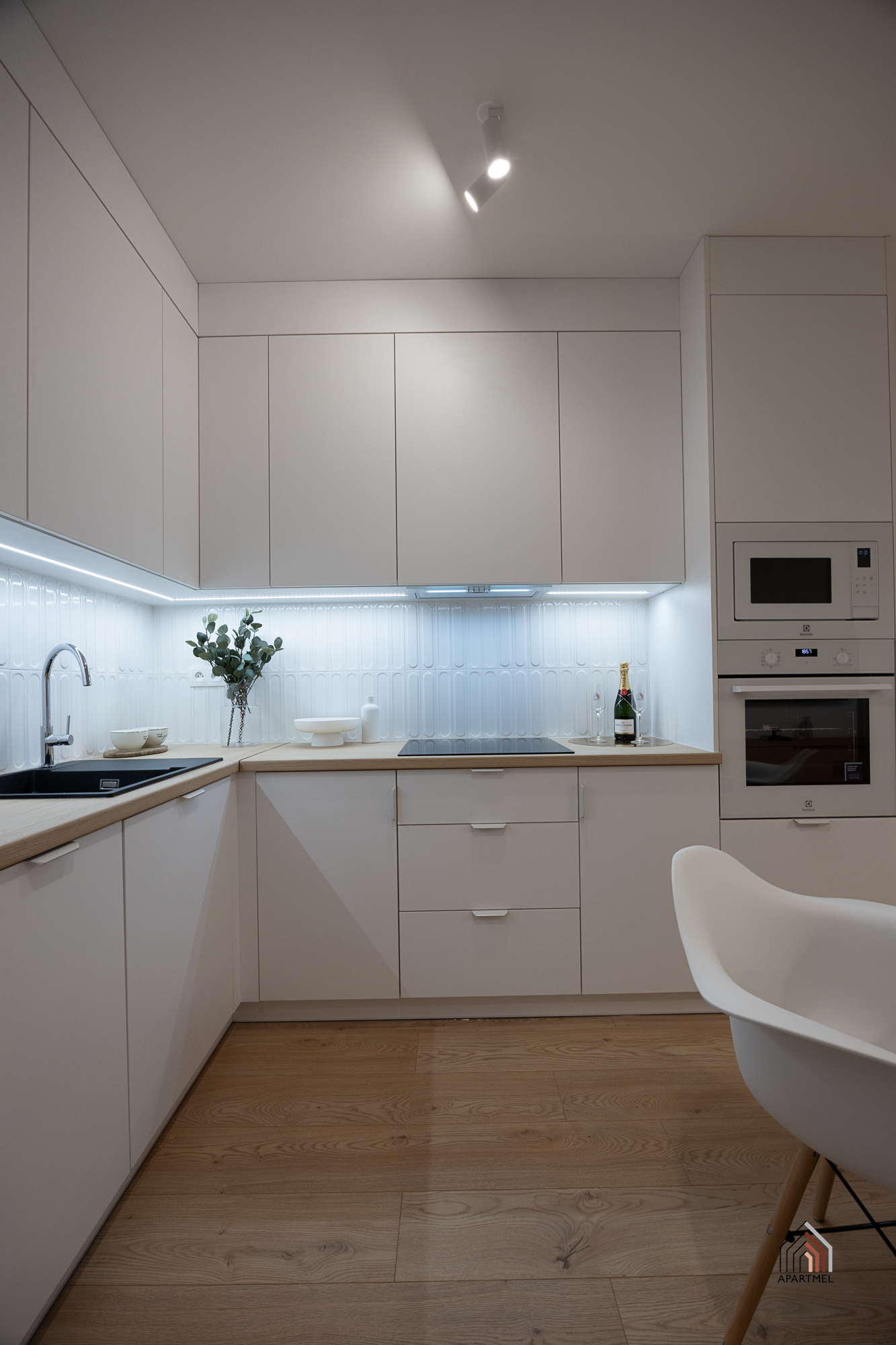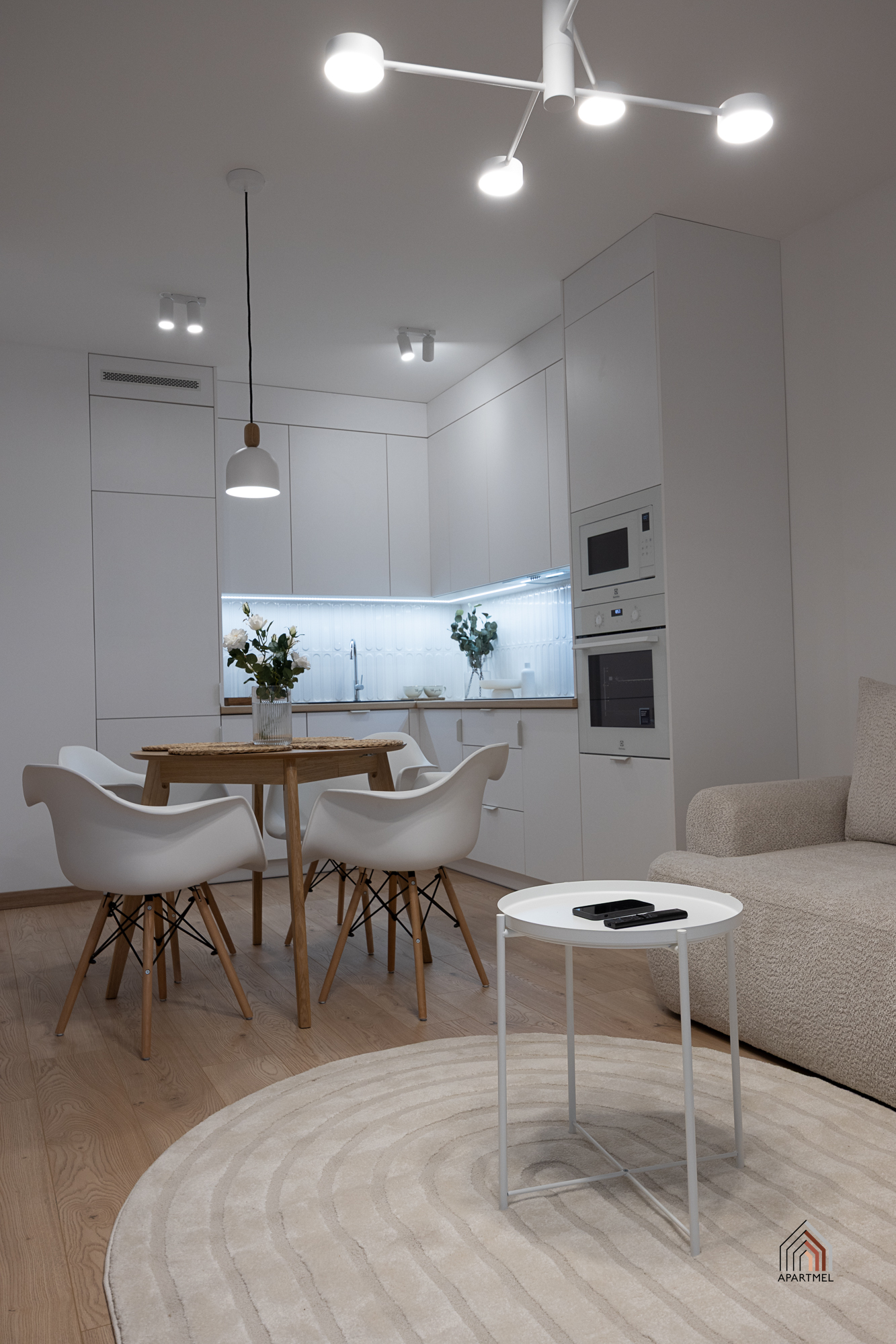 W kuchni ergonomiczna zabudowa meblowa, lodówka z zamrażarką, piekarnik, płyta indukcyjna, okap i zmywarka. Dodatkowo podkładki, sztućce, talerze, miski, szklanki, filiżanki do herbaty, deski do krojenia, zestaw noży kuchennych, komplet garnków, komplet patelni, przybory do gotowania. Wszystkie sprzęty renomowanych marek, na gwarancji.