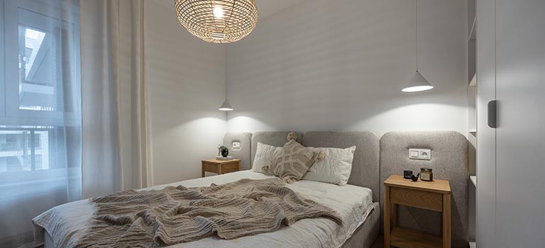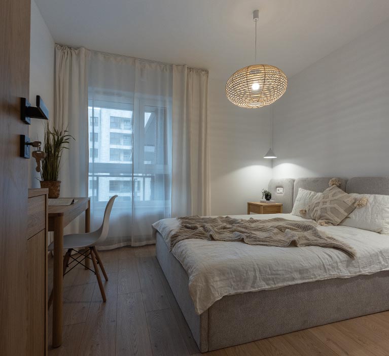 Sypialnia w stylu boho posiada wygodne łóżko kontynentalne z zagłówkiem i dużą skrzynią na pościel, a także wsad pościelowy tj. kołdra i dwie poduszki, bardzo pojemną szafę z regałem, biurko z krzesłem. Obok łóżka szafki nocne, lampki oraz gniazdka, w oknach firanki i zasłony.