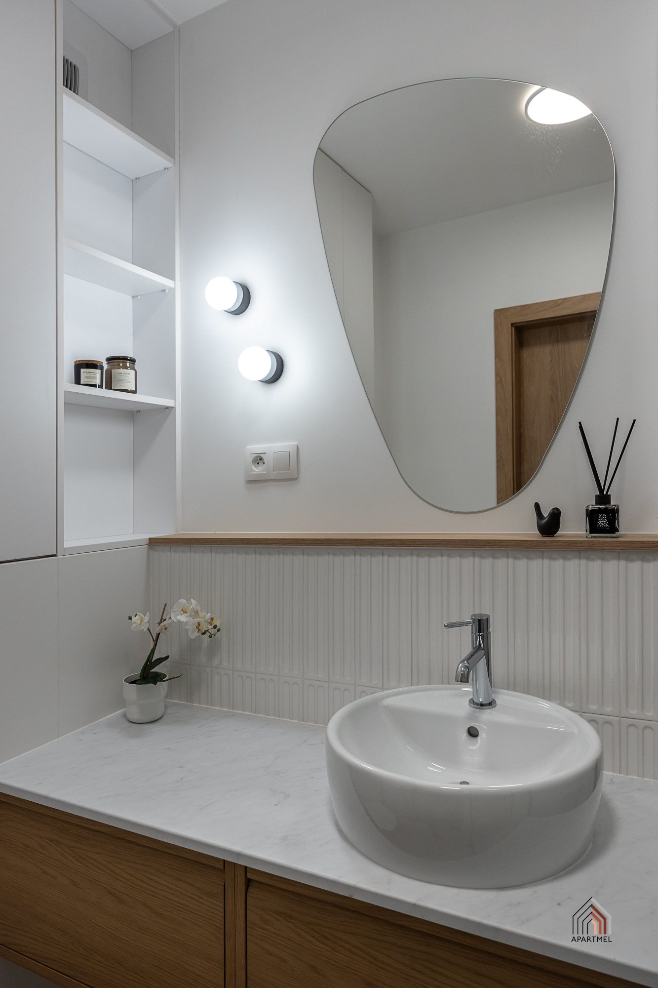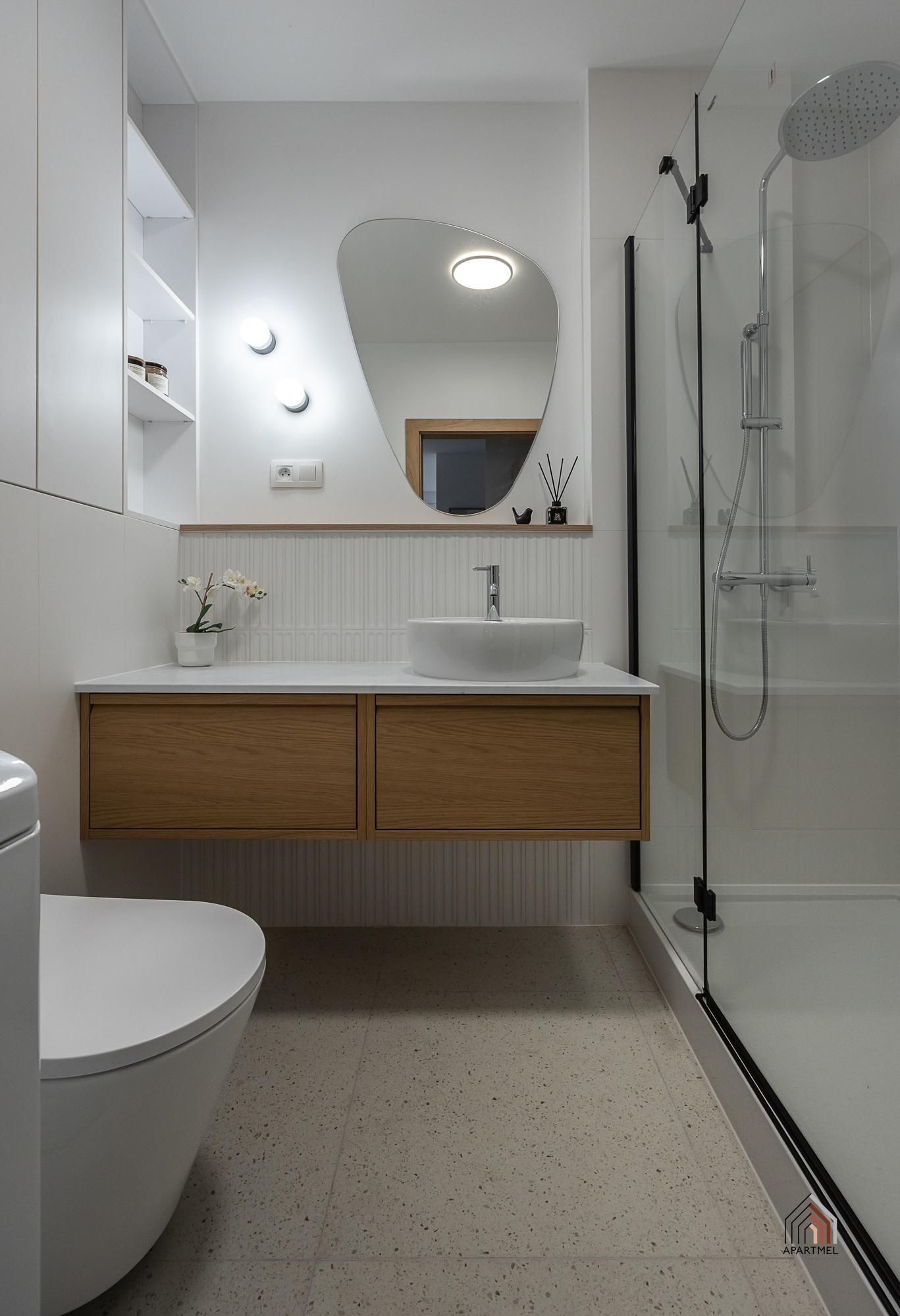 Jasna łazienka wykończona jest w stylu nowoczesnym z czarnymi dodatkami, które nadają charakteru całemu pomieszczeniu. Na wyposażeniu jest prysznic z deszczownicą oraz półką na kosmetyki, umywalka na szafce z dwiema szufladami, pralkę Electrolux, miskę ustępową wiszącą z baterią bidetową w jej sąsiedztwie, bardzo duże lustro oraz kinkiety, a także wieszaki na ręczniki, uchwyt na papier toaletowy, szczotkę do wc i kosz na śmieci.