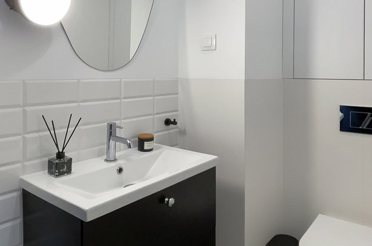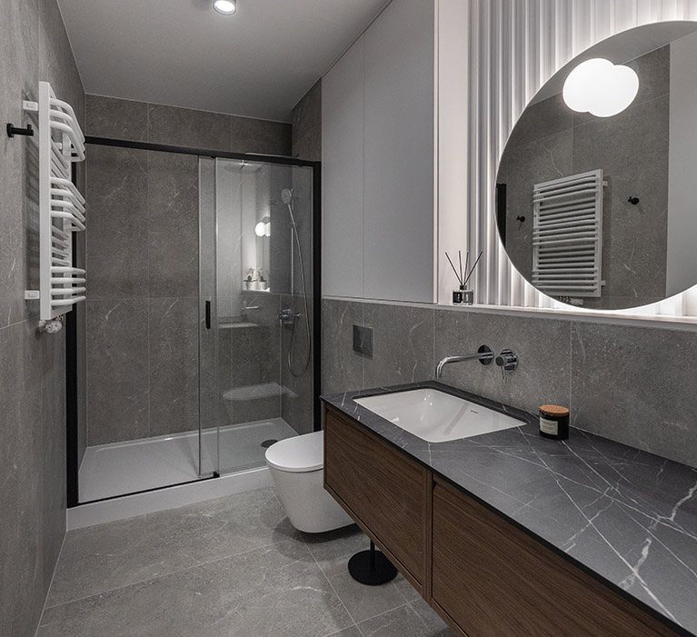 Łazienka jest elegancka i jasna, wyposażona w stylową armaturę oraz wysokiej jakości ceramikę. Znajduje się w niej obszerny prysznic praktyczną półką na kosmetyki, duża umywalka osadzona na szafce, wisząca miska ustępowa z baterią bidetową w sąsiedztwie, a także szafka wisząca, lustro oraz oświetlenie. Dodatkowo przestrzeń uzupełniają funkcjonalne akcesoria, takie jak wieszaki na ręczniki, uchwyt na papier toaletowy, kosz na śmieci i szczotka do WC.