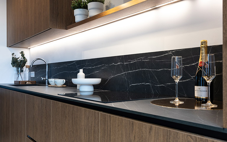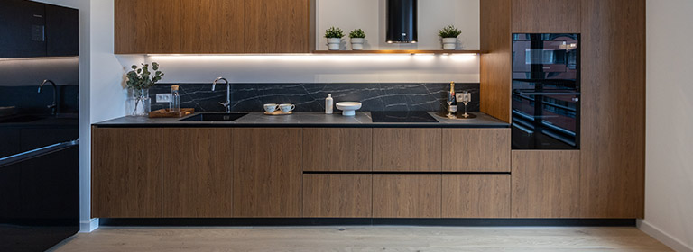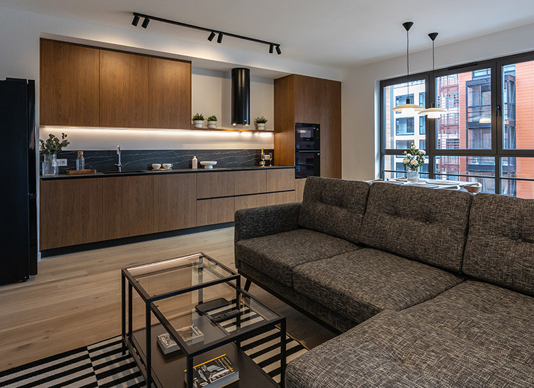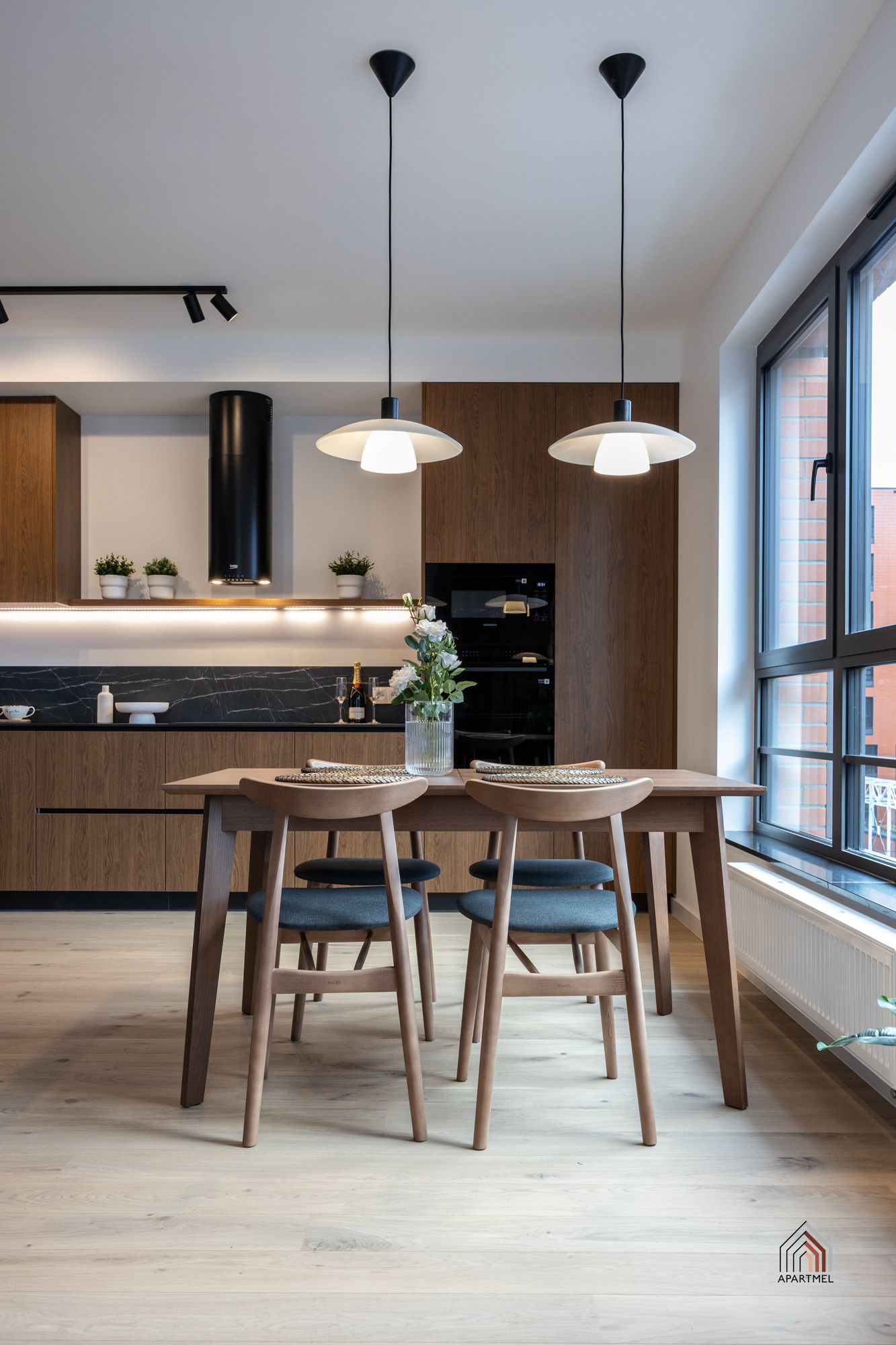 W otwartej na salon kuchni znajduje się ergonomiczna zabudowa meblowa, w której wkomponowano lodówkę z zamrażarką, piekarnik, płytę indukcyjną, okap oraz zmywarkę, co zapewnia pełną funkcjonalność i wygodę codziennego użytkowania. Całość uzupełnia praktyczny, funkcjonalny stół, który doskonale sprawdza się zarówno jako miejsce wspólnych posiłków, jak i przestrzeń do pracy czy spotkań towarzyskich.