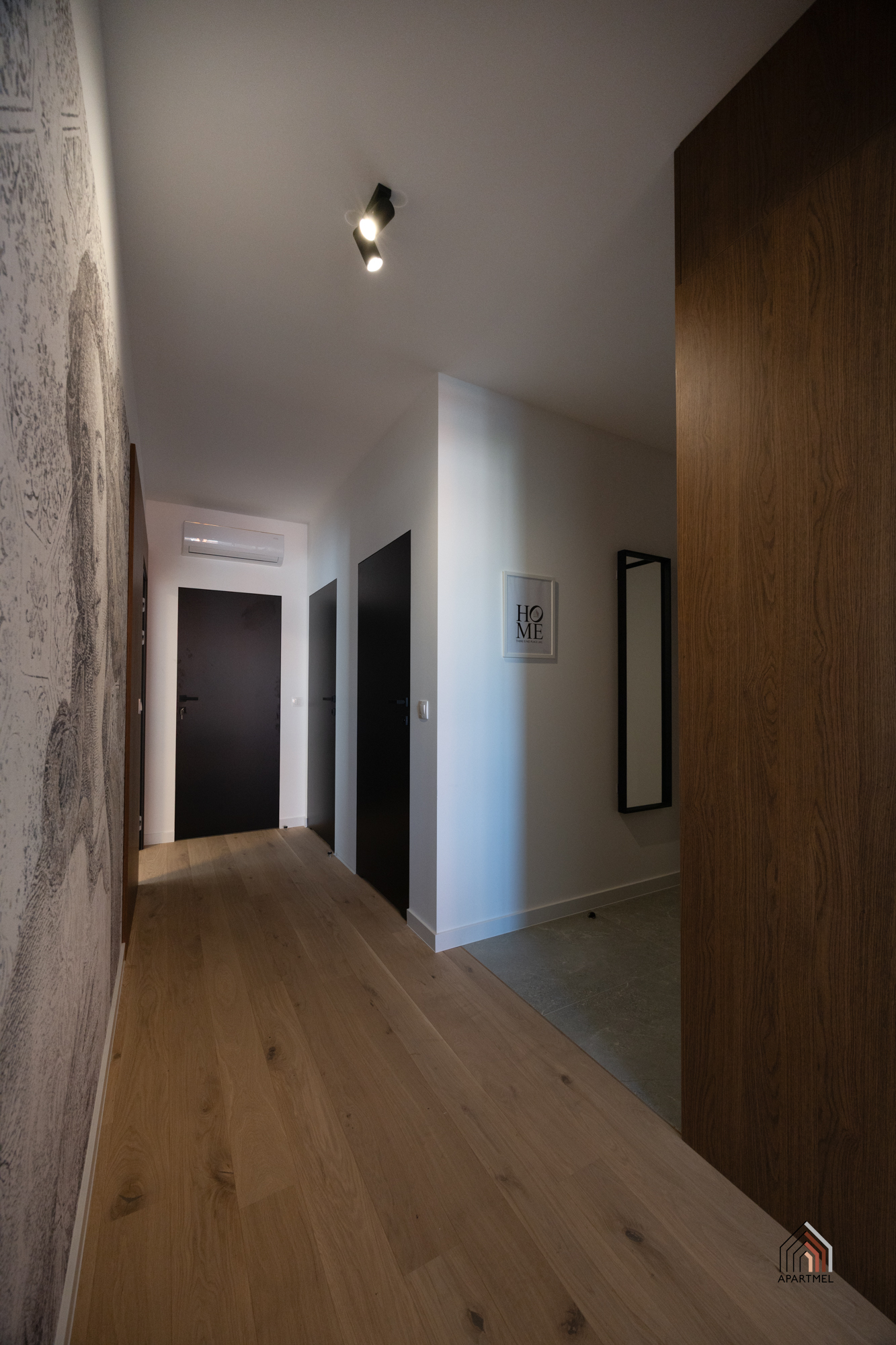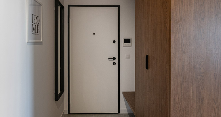 Strefa wejściowa z dużą, trójdzielną szafą ubraniową z wieszakami oraz gospodarczą. Dodatkowo puf, podręczny wieszak oraz lustro. Na podłogach położone są dobrej jakości płytki ceramiczne o podwyższonej odporności.