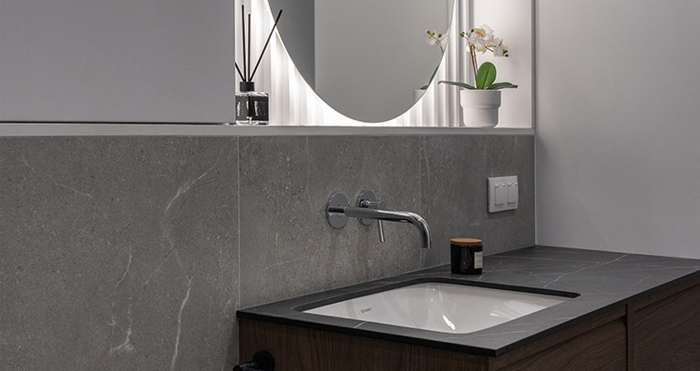 Osobne wc z umywalką i pojemnymi szafkami w eleganckiej zabudowie.
