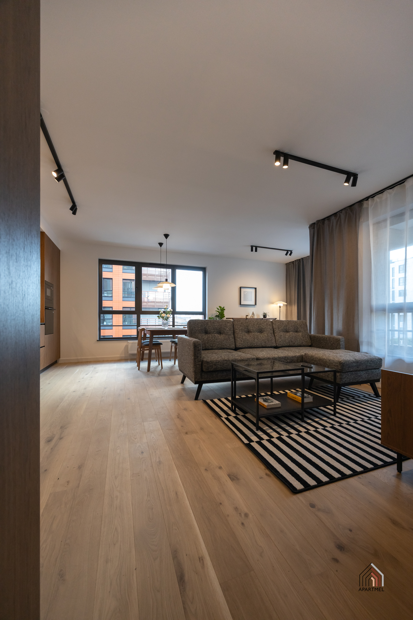 Apartament zlokalizowany jest na 3 piętrze, 8 piętrowego apartamentowca. Estetycznie przygotowane wnętrza części wspólnych nadają wyjątkowy charakter inwestycji. Garaże podziemne oraz tereny zielone okalające budynki dopełniają poczucie komfortu.