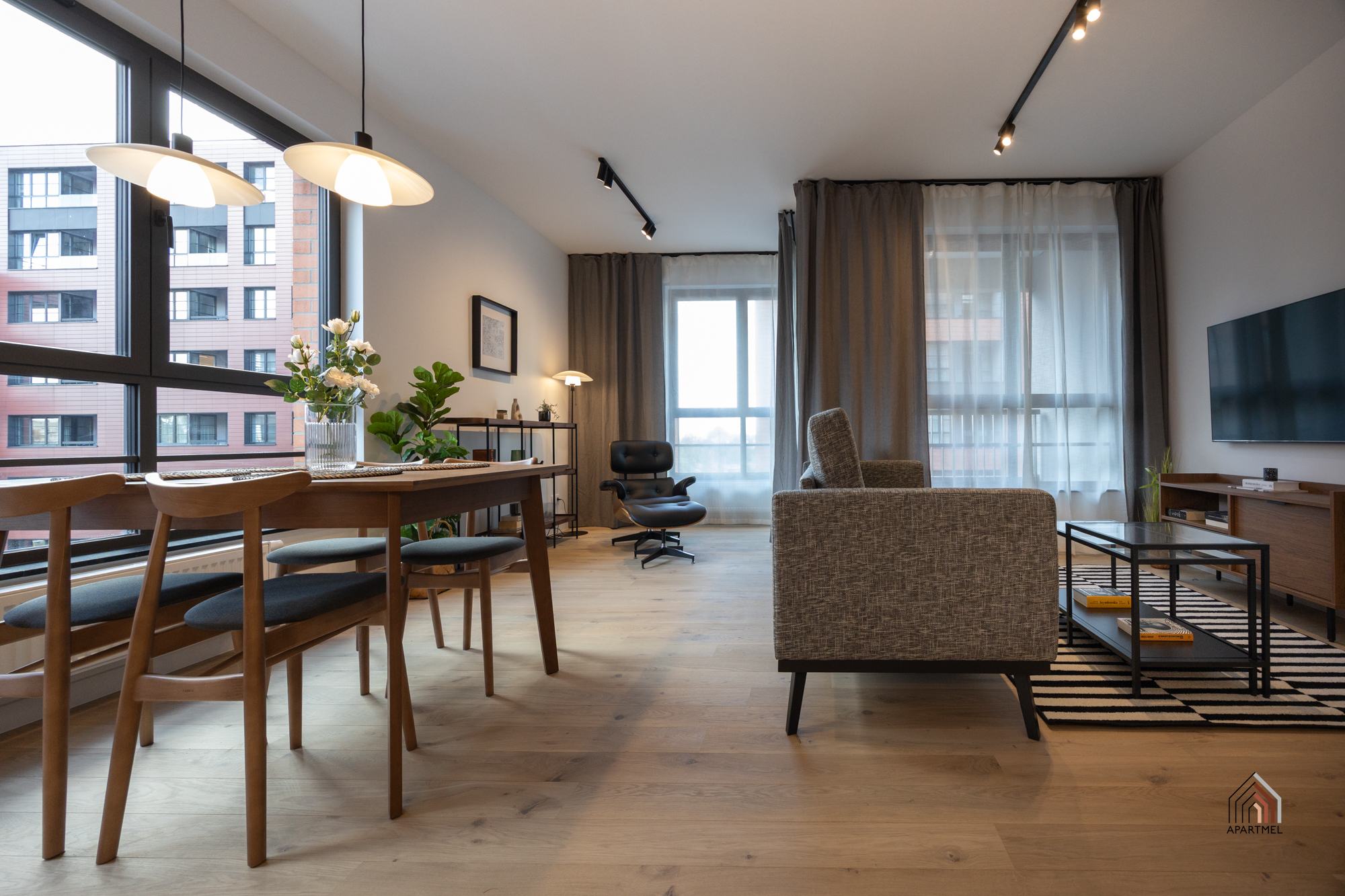 W salonie znajduje się rozkładana kanapa narożna, fotel, komoda , podwójny stolik kawowy, szafka RTV i podwieszany telewizor telewizor 55" Samsung 4K Smart TV, duży stół i 4 krzesła. W bardzo przestronnych oknach delikatne firanki i zaciemniające zasłony.