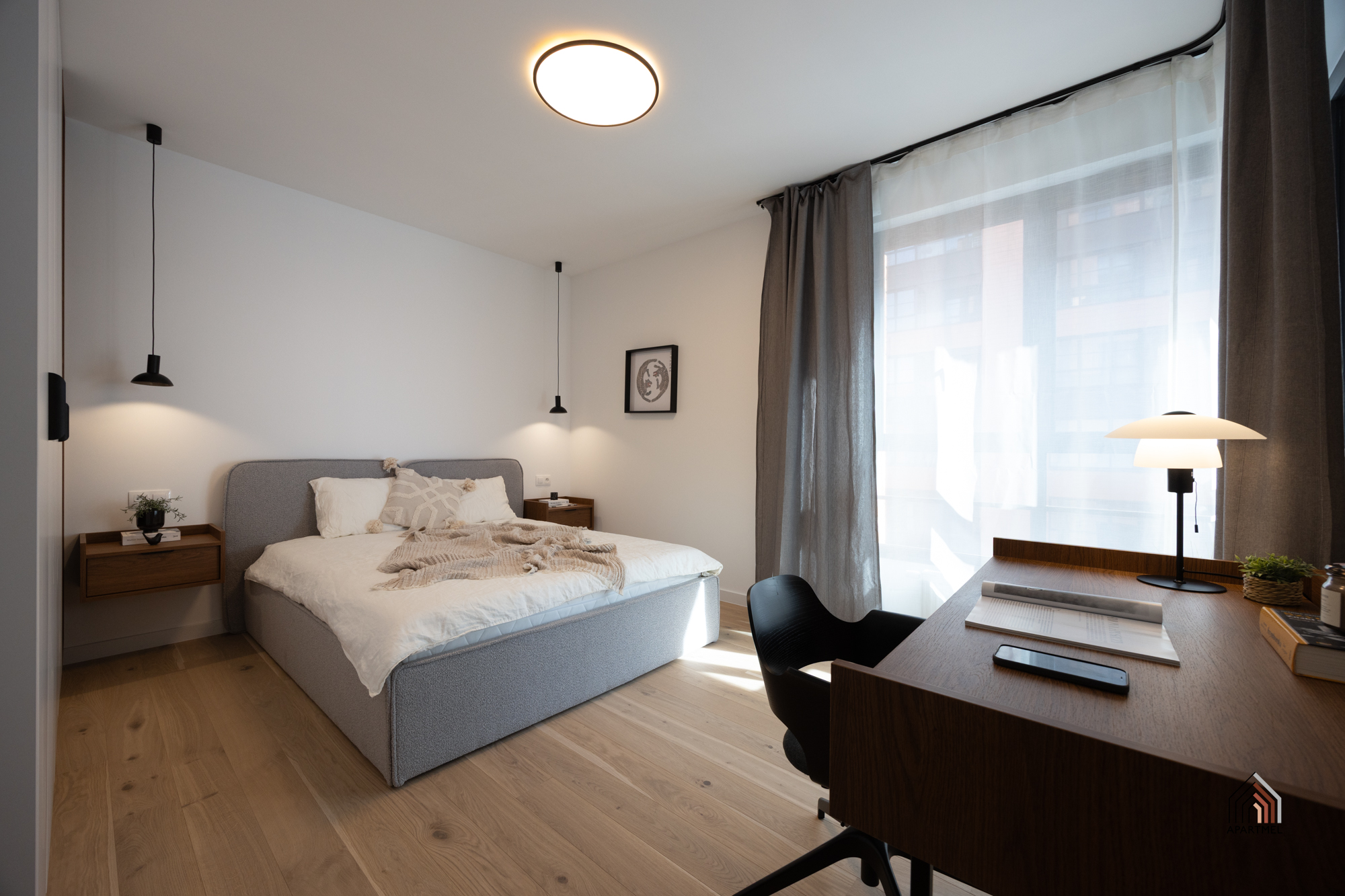 Sypialnia główna posiada duże, wygodne łóżko z zagłówkiem i pojemnikiem na pościel oraz pojemną szafę. Obok łóżka szafka nocna, lampka oraz gniazdka, w oknach firanki i zasłony.