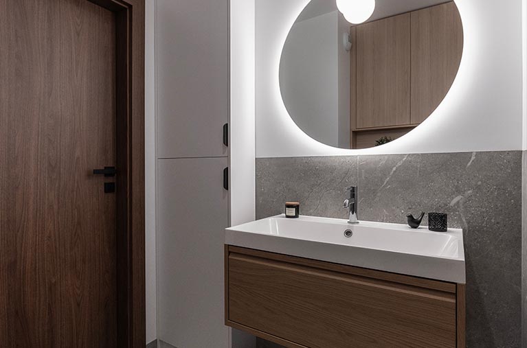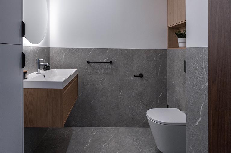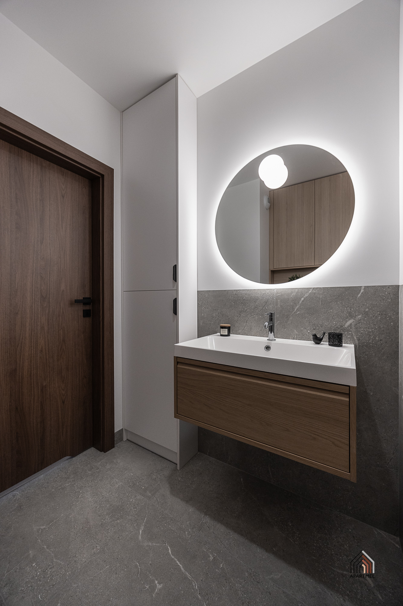 Osobne wc z umywalką i pojemnymi szafkami w eleganckiej zabudowie.