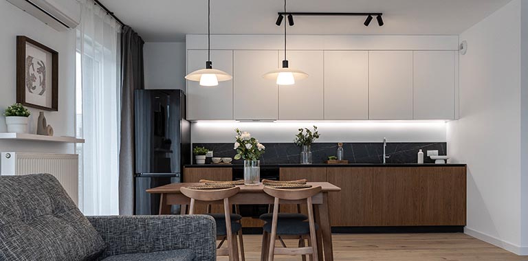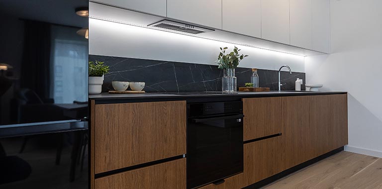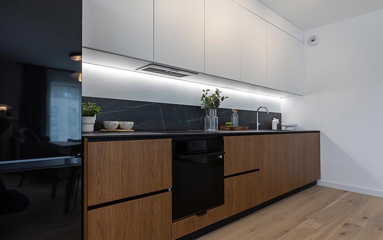 Nowoczesna kuchnia w wysokiej, modułowej zabudowie tworzy wraz z salonem atrakcyjną wizualnie przestrzeń. Jest tu wszystko, co niezbędne: sprzęt AGD marki Samsung tj. duża lodówko-zamrażarka, zabudowany piekarnik, płyta indukcyjna, kuchenka mikrofalowa, okap i zmywarka. Dodatkowo zlew konglomeratowy z dużą komorą i ociekaczem, kosze na śmieci z segregacją, czajnik elektryczny Phipilps, szuflady, cargo, praktyczne listwy LED.