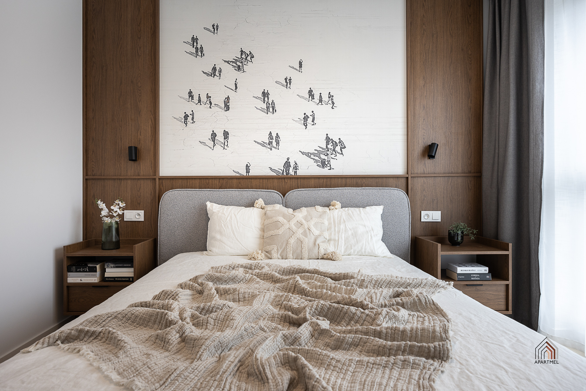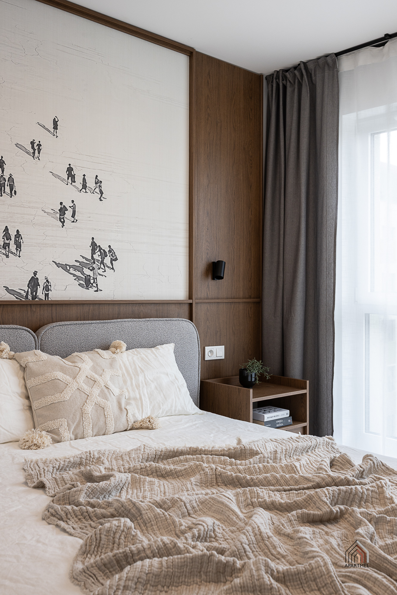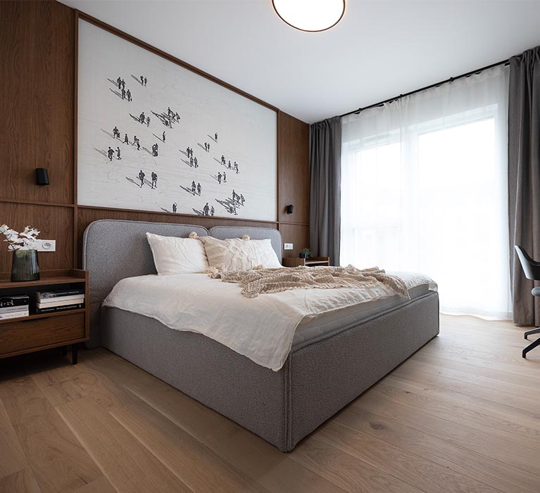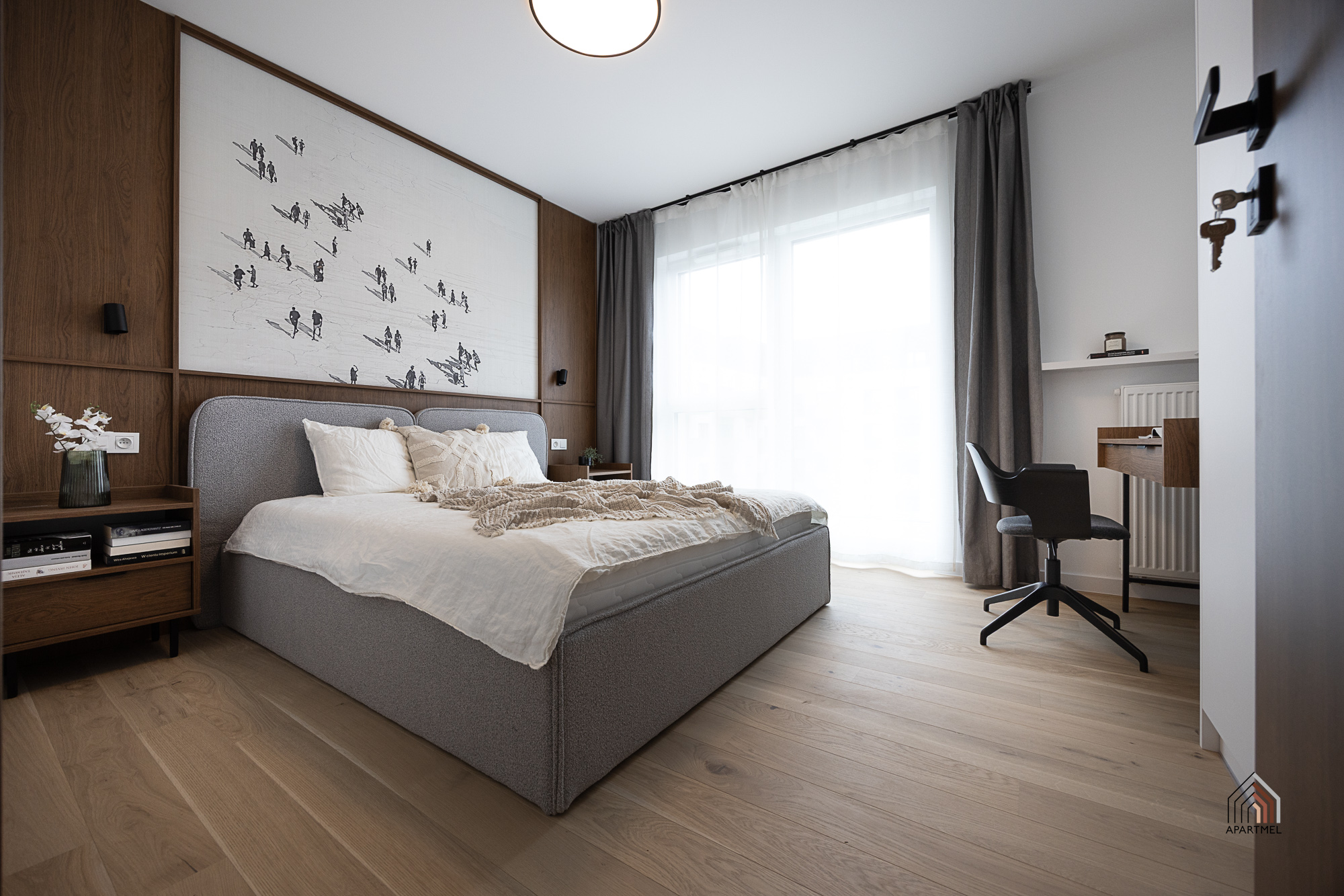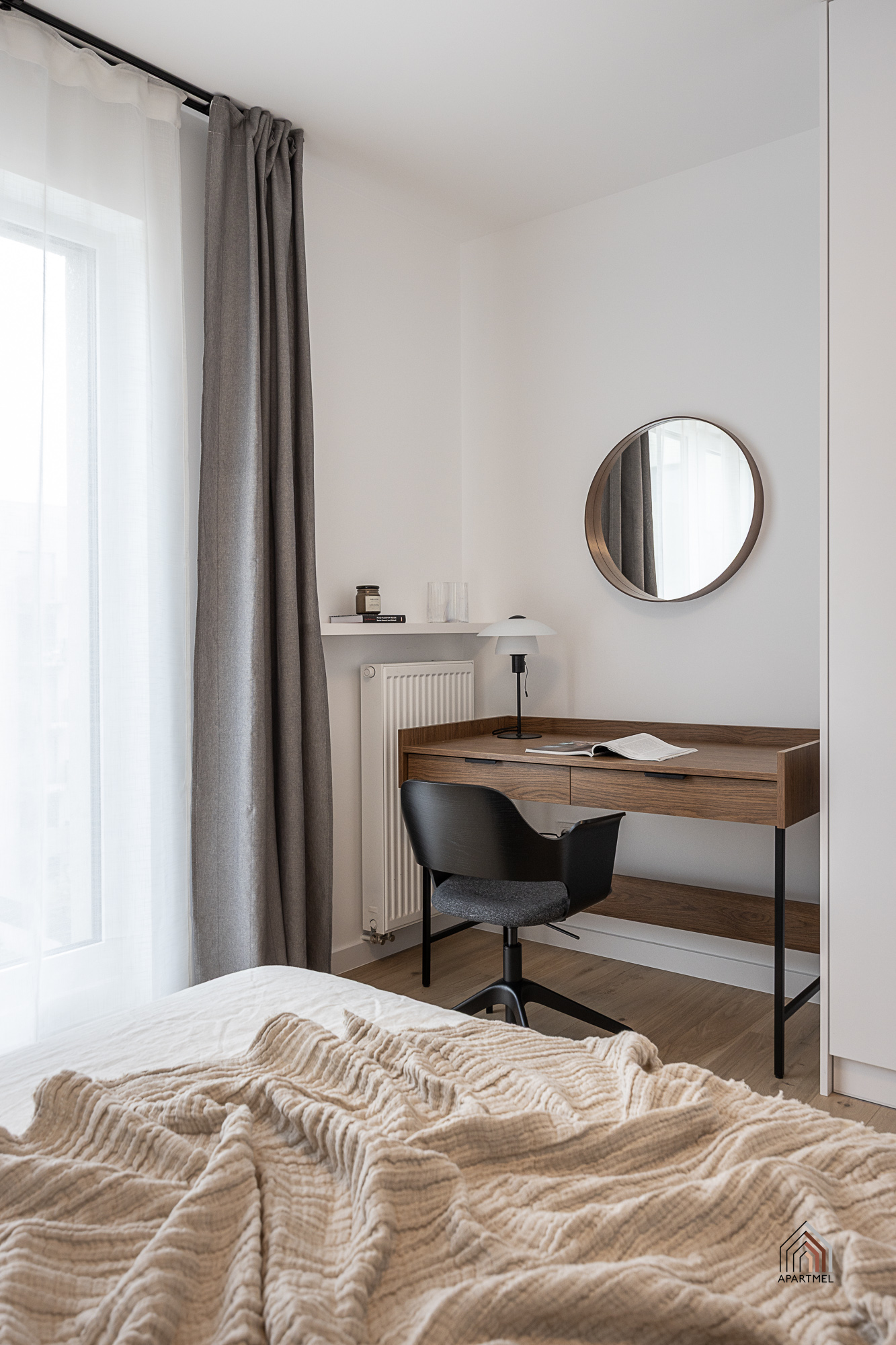 W sypialni znajduje się duże, kontynentalne łóżko z modnym zagłówkiem i obszernym pojemnikiem na pościel. Na wyposażeniu jest szafa z wieszakami i półkami, biurko z szufladami, krzesło, półka, gniazdka, szafki nocne i kinkiety po obu stronach łóżka, w oknie delikatne firanki i zasłony.