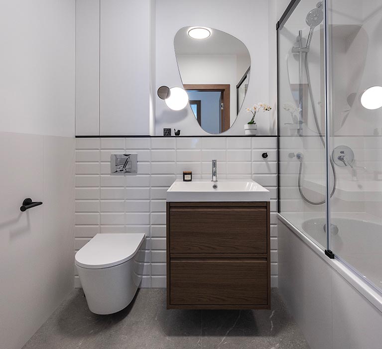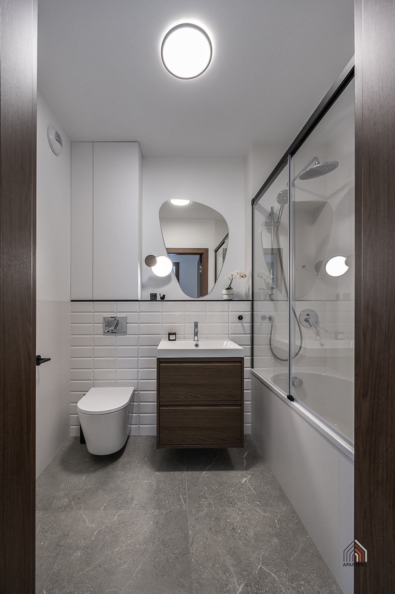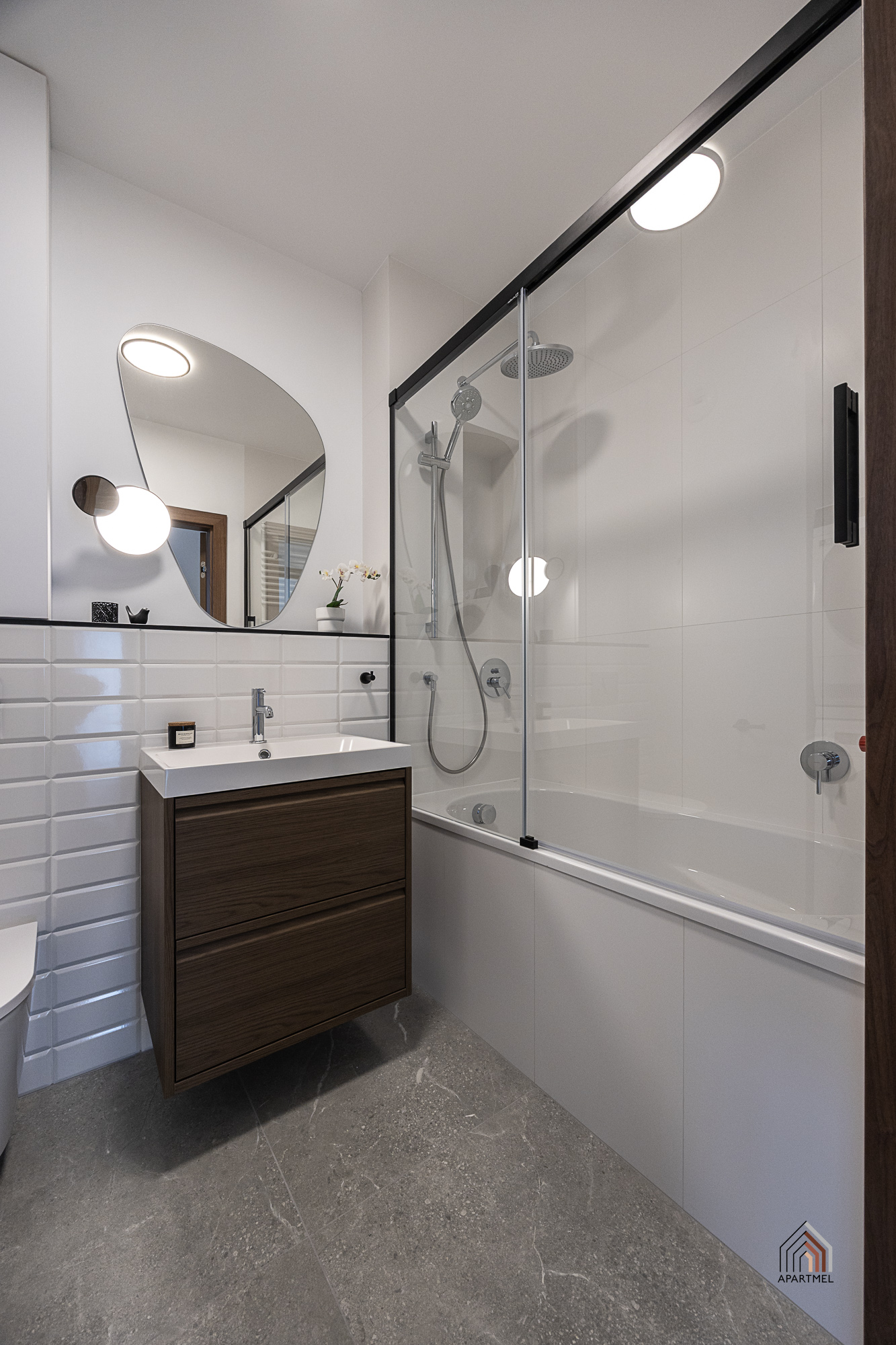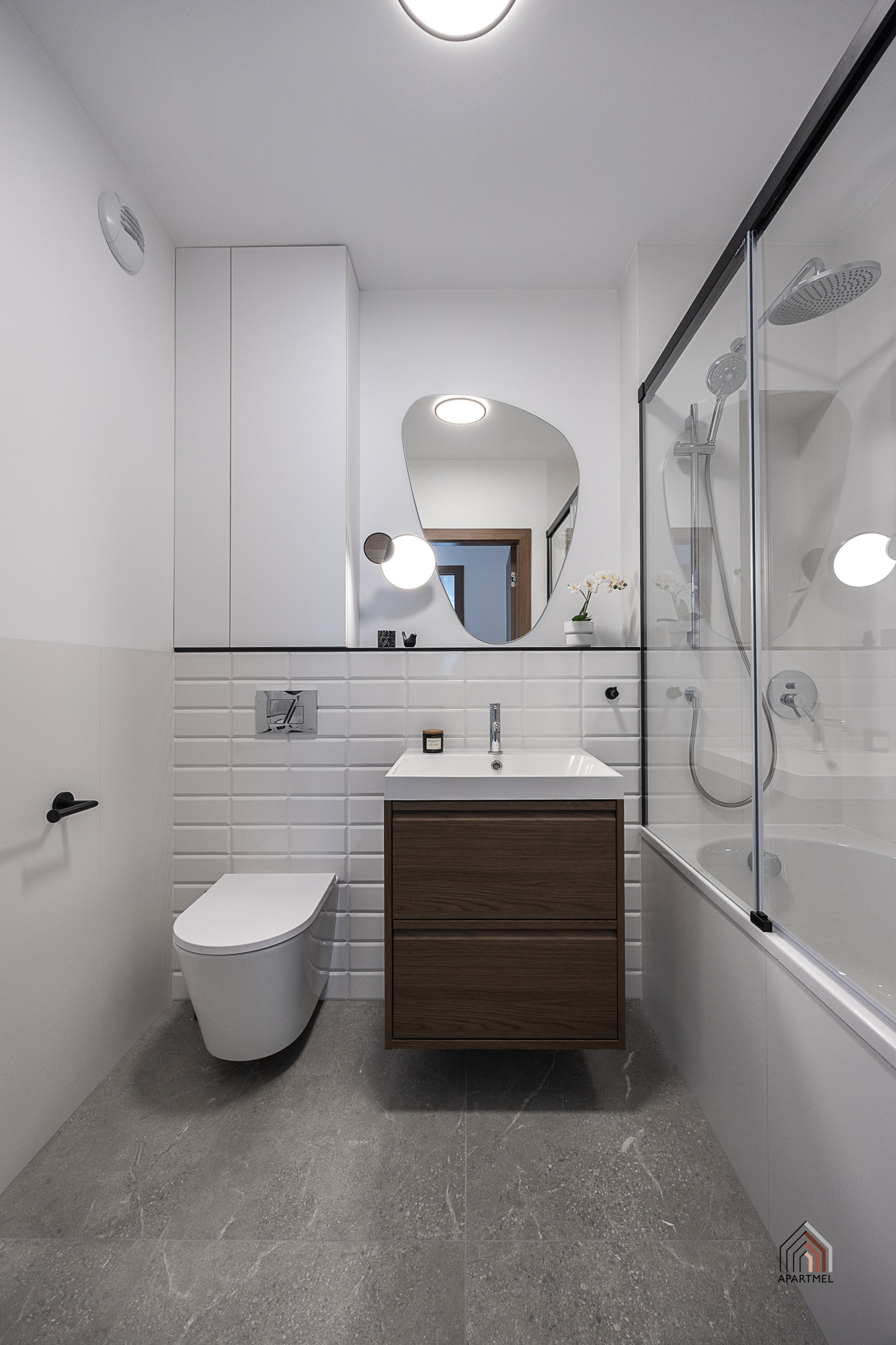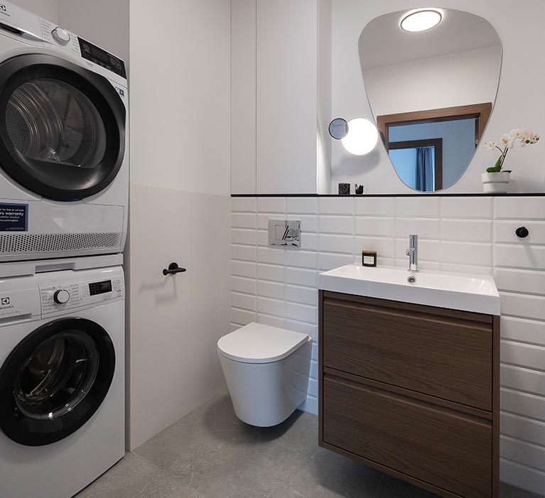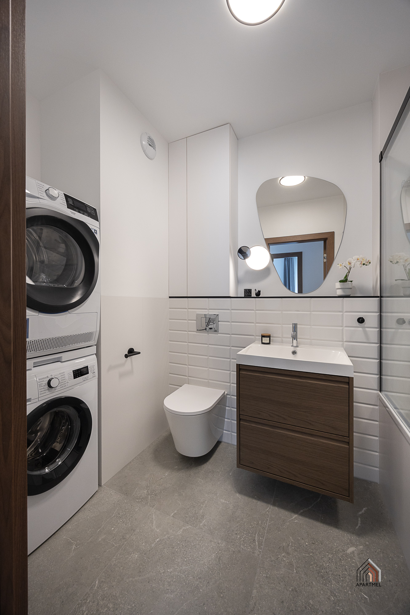 Praktyczna i wygodna łazienka posiada zabudowę ścienną z miejscem do przechowywania. Na wyposażeniu znajdują się: wanna z prysznicem i z deszczownicą, umywalka na szafce z głębokimi szufladami, pralka i suszarka Electrolux, miska ustępowa, uchwyt na papier toaletowy, szczotka do wc i kosz na śmieci.