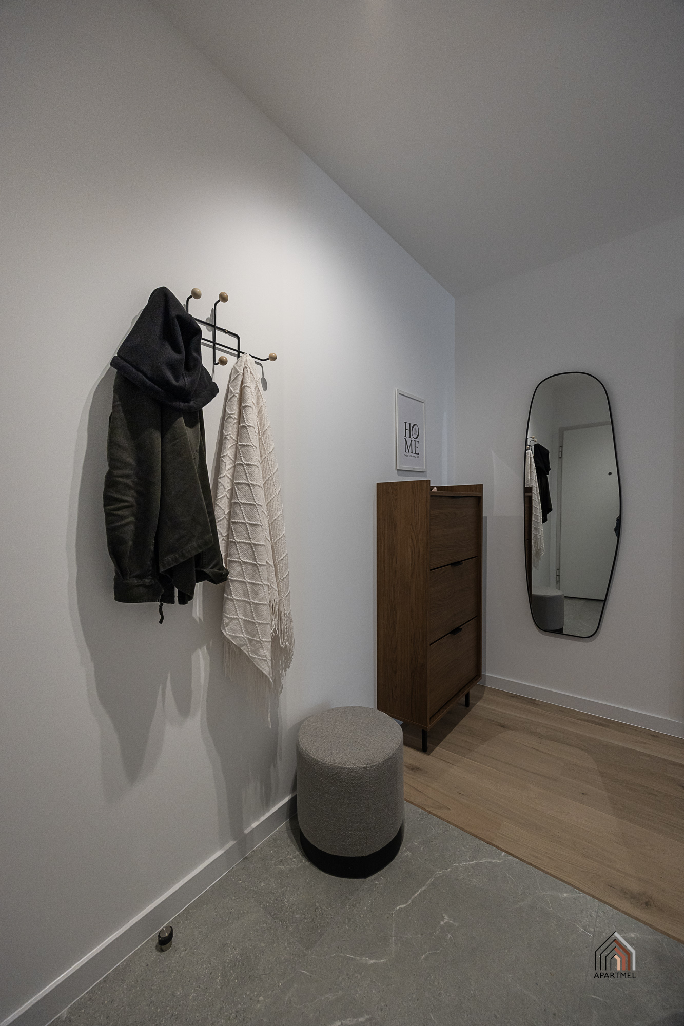 W eleganckim holu znajduje się m.in. duża szafa z modułem gospodarczym - z odkurzaczem Electrolux, rozkładaną suszarką, deską do prasowania, żelazkiem Philips oraz mopem. Lustro, wieszak podręczny przy wejściu, pufa i komoda. Na podłogach położone są dobrej jakości panele o podwyższonej odporności na wilgoć oraz płytki ceramiczne.