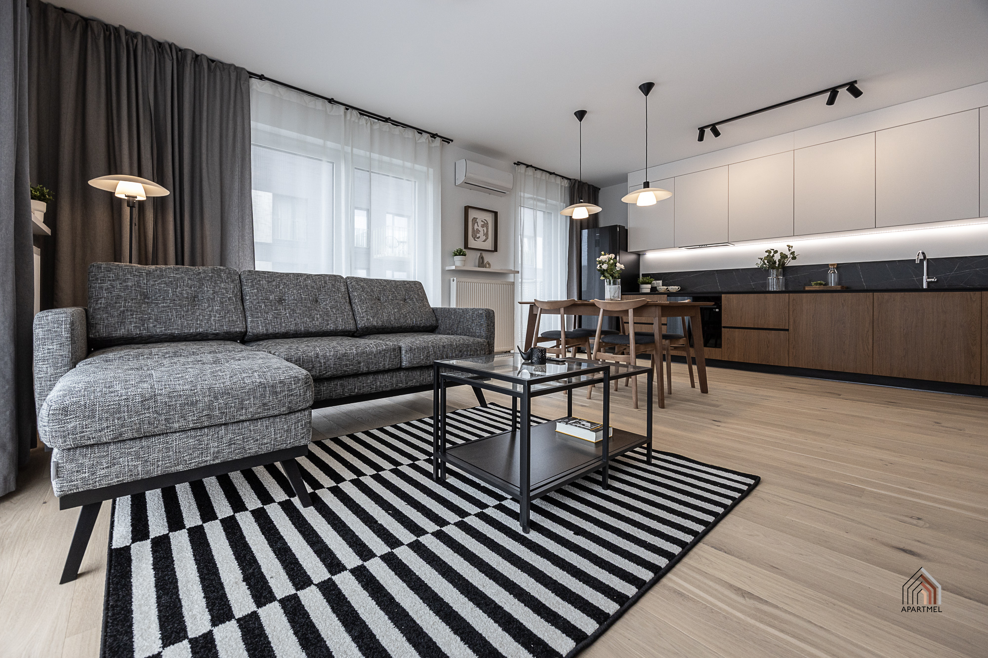 Przestronny, przytulny salon połączony jest z otwartą kuchnią, co daje więcej przestrzeni i światła. W pokoju znajduje się wygodna, rozkładana do spania kanapa narożna, duża komoda RTV, telewizor 55" Samsung 4K Smart TV, stolik kawowy 2 w 1, dywan, zasłony, stół oraz 4 krzesła. Na suficie znajduje się designerskie oświetlenie, a w oknach zasłony i delikatne firanki.
