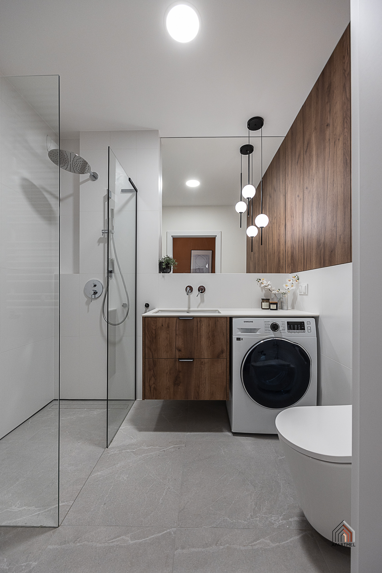 Łazienka jest elegancka, jasna, ze stylową armaturą i ceramiką dobrej jakości. Posiada obszerny prysznic z niskim brodzikiem i deszczownicą oraz półką na kosmetyki, dużą umywalkę na szafce, pralkę Electrolux, miskę ustępową wiszącą z baterią bidetową w jej sąsiedztwie, szafkę wiszącą, lustro oraz lampy, a także wieszaki na ręczniki, uchwyt na papier toaletowy, kosz na śmieci, szczotkę do wc.
