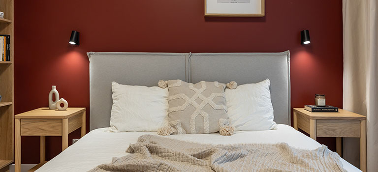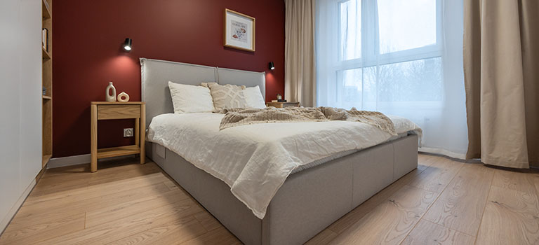 Sypialnia w stylu boho posiada wygodne łóżko kontynentalne z zagłówkiem i dużą skrzynią na pościel, a także wsad pościelowy tj. kołdra i dwie poduszki, bardzo pojemną szafę z regałem, biurko z krzesłem. Obok łóżka szafki nocne, lampki oraz gniazdka, w oknach firanki i zasłony.