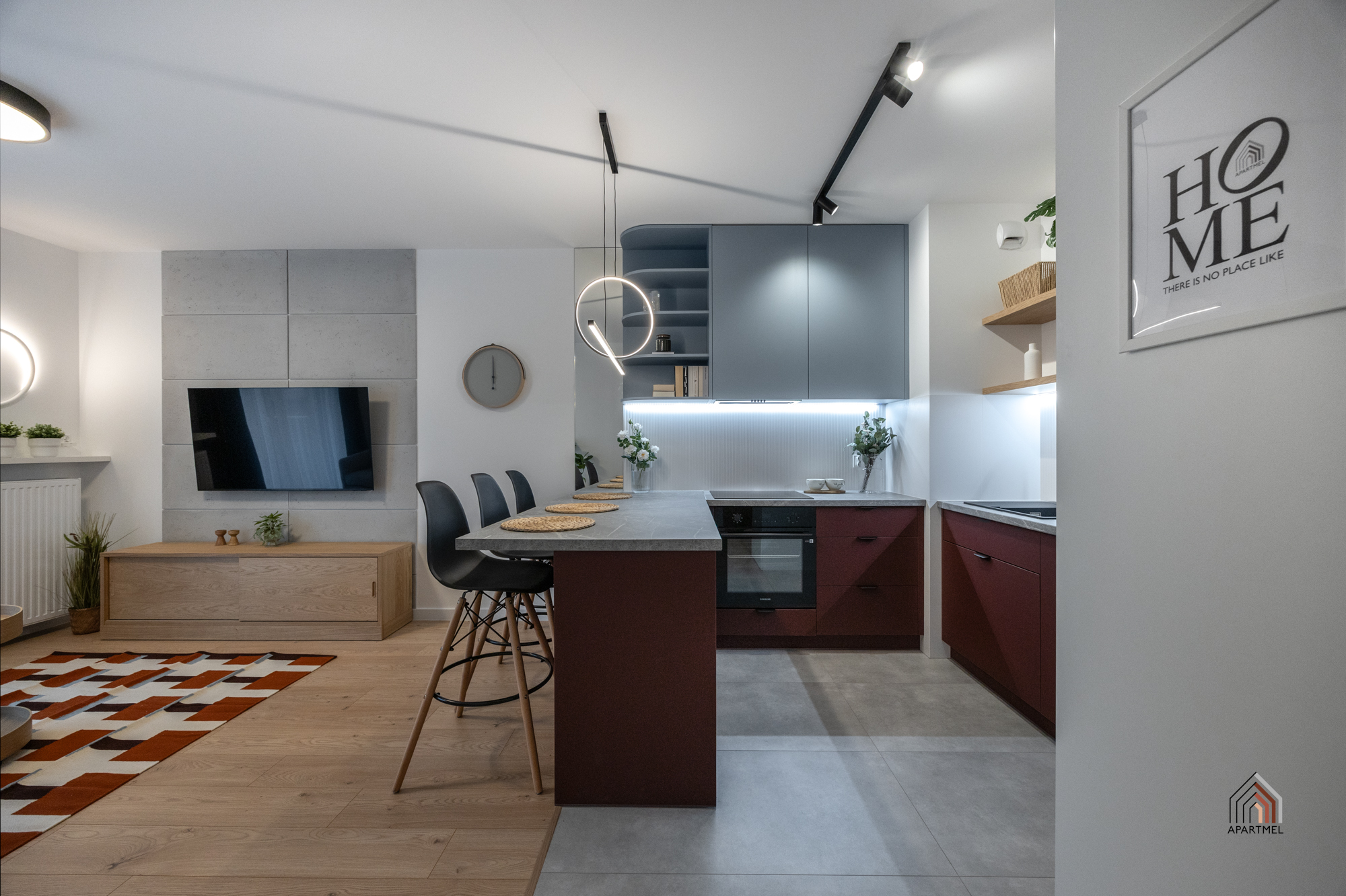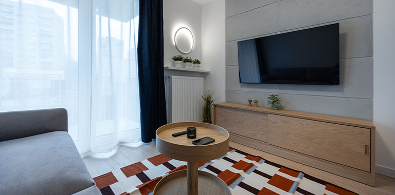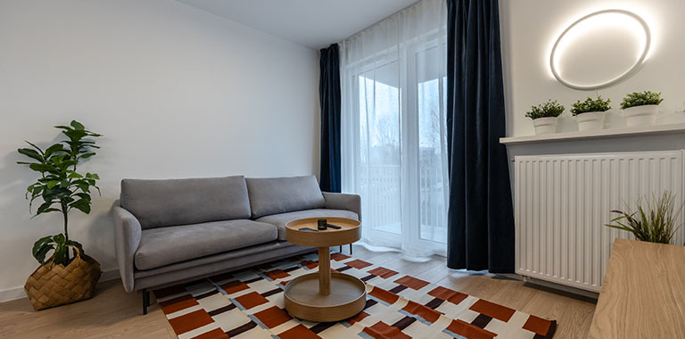 W salonie znajduje się rozkładana sofa narożna, stolik kawowy, szafka RTV i podwieszany telewizor 55" Samsung 4K Smart TV, stół i 4 krzesła. W dużych oknach balkonowych delikatne firanki i lekkie zasłony.