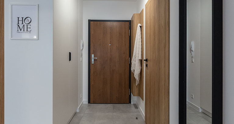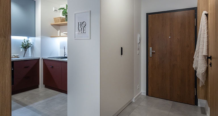 Strefa wejściowa z szafą ubraniową z wieszakami oraz gospodarczą, wyposażoną w odkurzacz, rozkładaną suszarkę, deskę do prasowania, żelazko oraz mop. Na podłogach położone są dobrej jakości płytki ceramiczne.