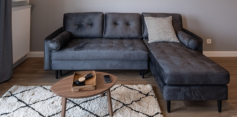 Przestronny salon połączony jest z otwartą kuchnią i holem, co daje więcej przestrzeni i światła. W pokoju znajduje się wygodna, rozkładana do spania kanapa, duża szafka RTV, telewizor 55" Samsung 4K Smart TV, stolik kawowy, dywan, zasłony, fotel, okrągły stół oraz 4 krzesła. Na suficie znajdują się designerskie, ruchome kinkiety, a w oknach zasłony zaciemniające.