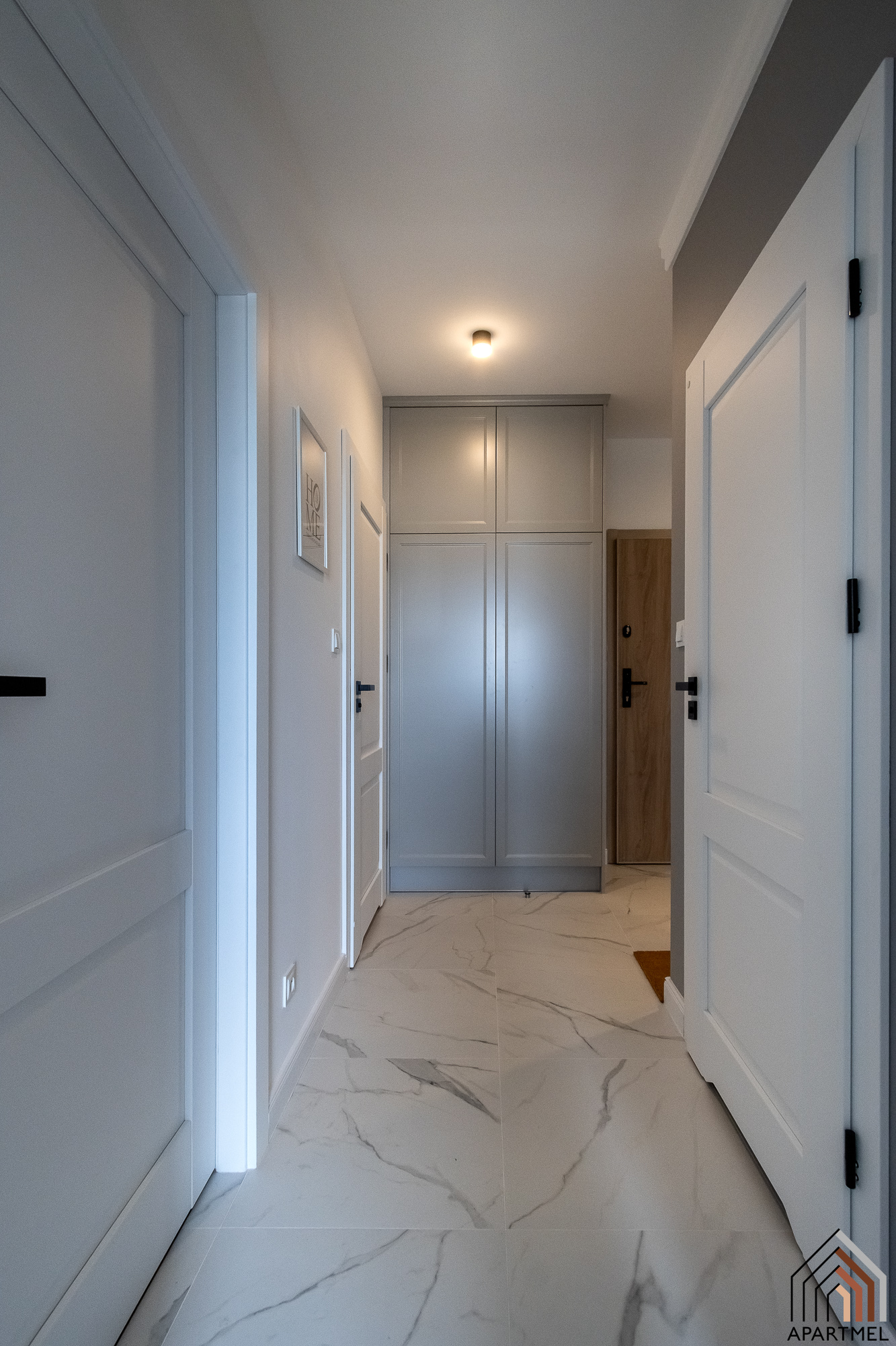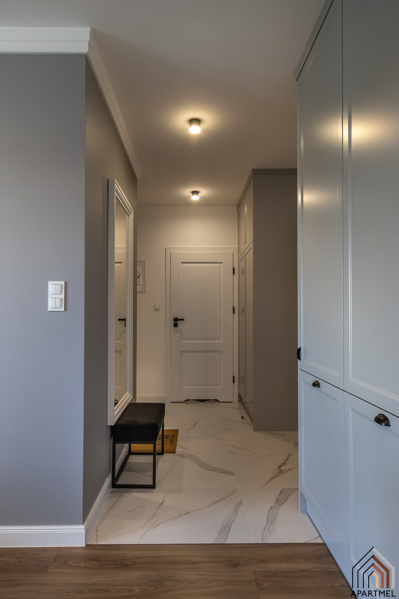 W eleganckim holu gospodarcza szafa z odkurzaczem, rozkładaną suszarką, deską do prasowania, żelazkiem oraz mopem. Bezpośrednio przy wejściu, zamontowany jest podręczny wieszak na ubrania, miedzy szafami stoi wygodny, tapicerowane siedzisko oraz lustro.