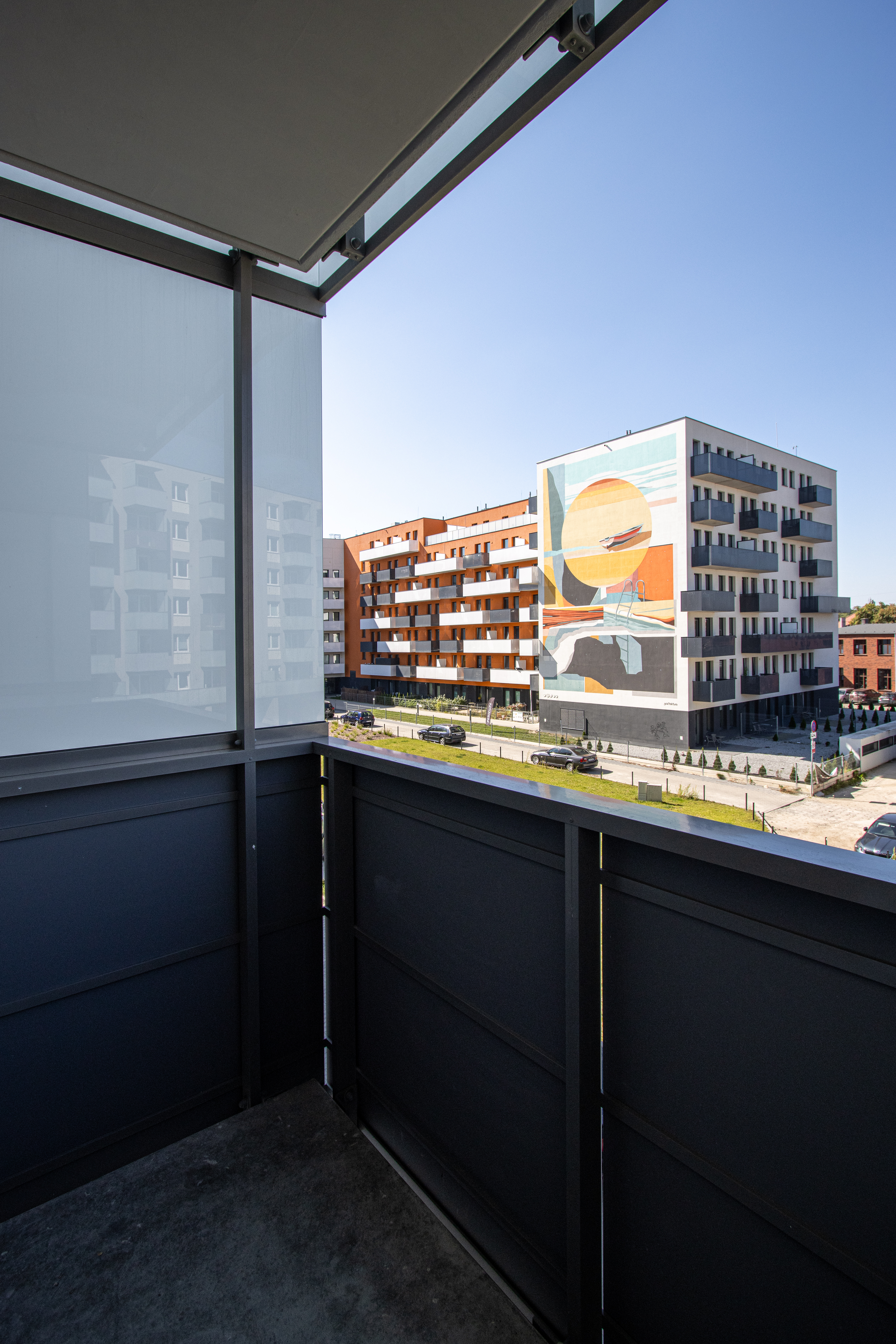 Balkon na podłodze ma kompozytową deską tarasową, która jest odporna na warunki klimatyczne i nie wymaga żadnej konserwacji. Z pewnością balkon będzie idealnym miejscem do codziennego relaksu czy wypicia porannej kawy.