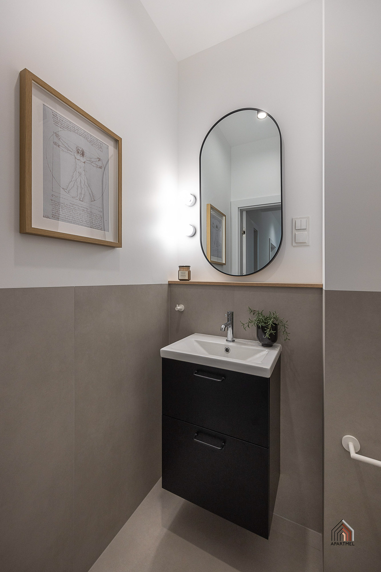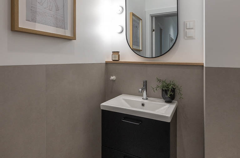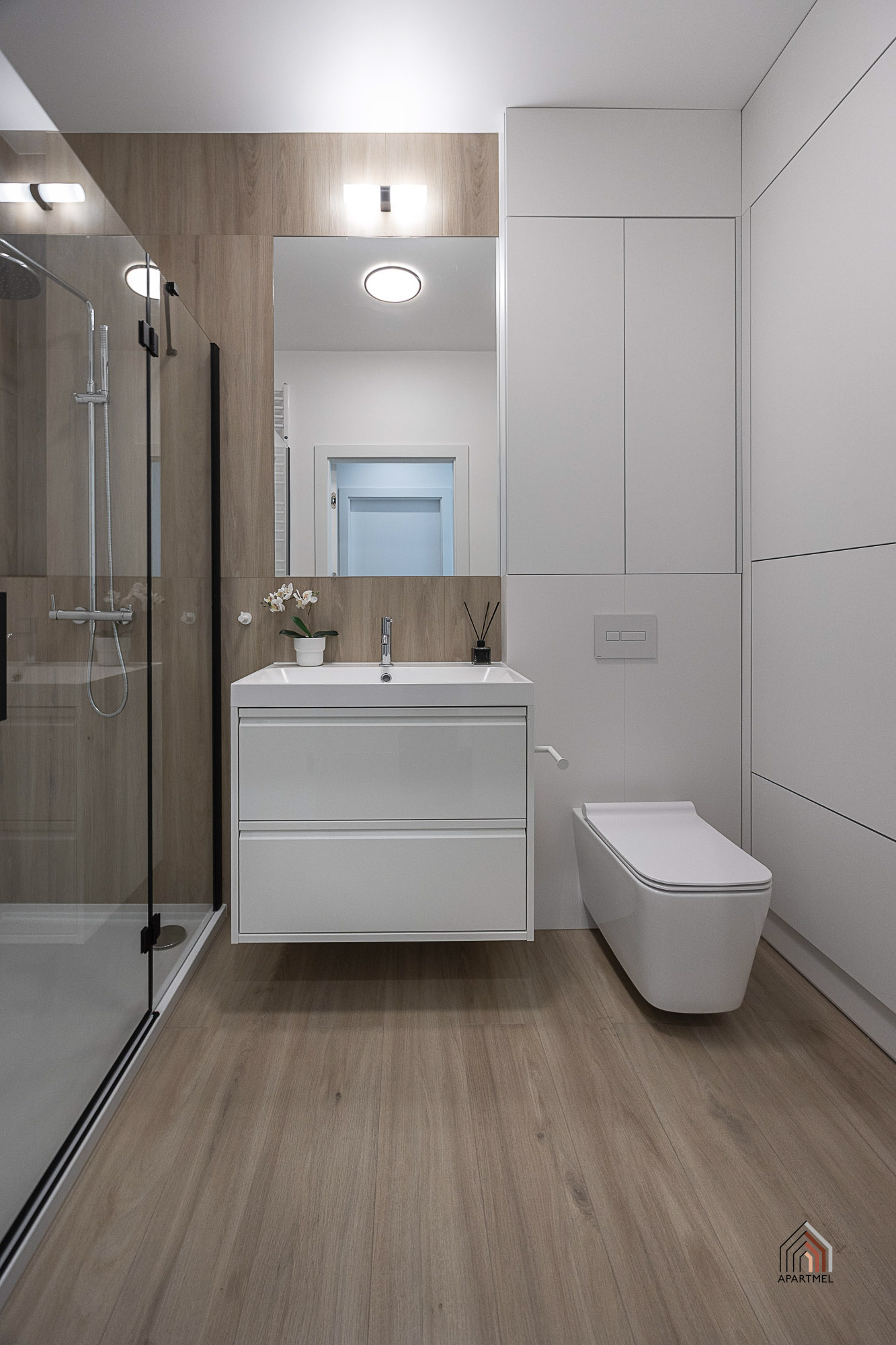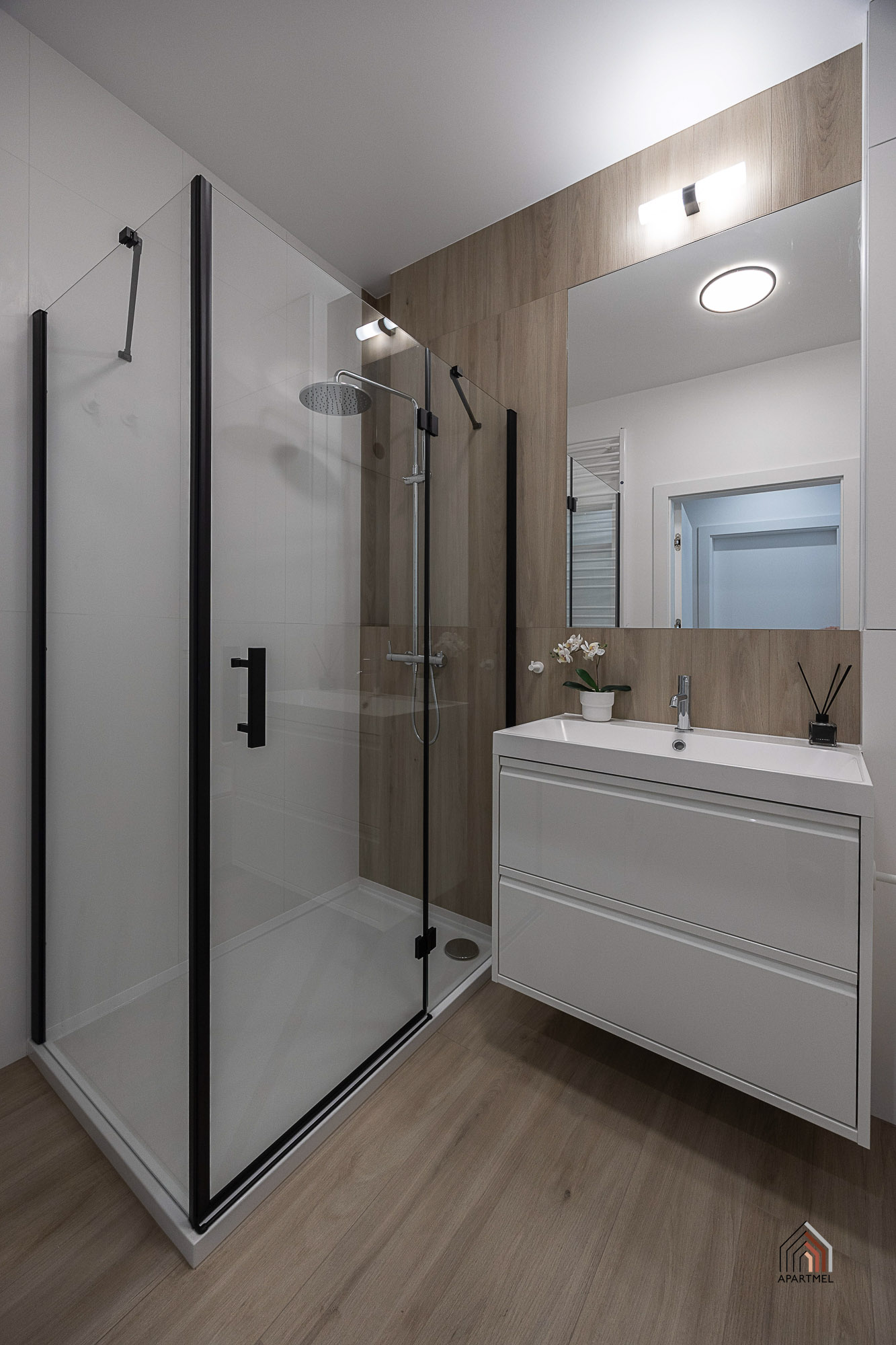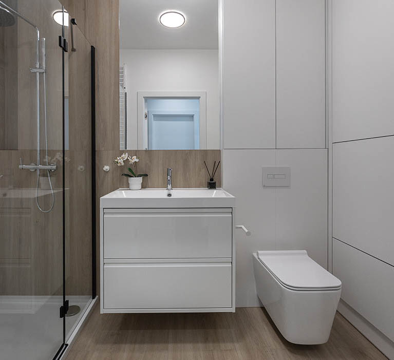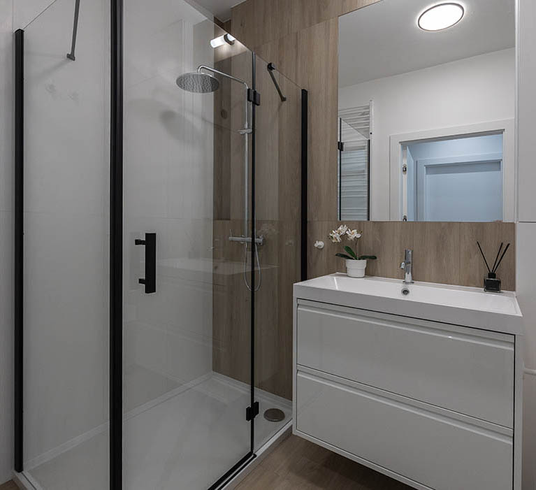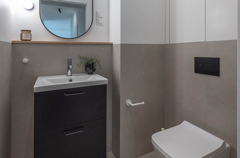 Łazienka jest elegancka, jasna, ze stylową armaturą i ceramiką dobrej jakości. Posiada obszerny prysznic z niskim brodzikiem i deszczownicą oraz półką na kosmetyki, dużą umywalkę na szafce, miskę ustępową wiszącą z baterią bidetową w jej sąsiedztwie, szafkę wiszącą, lustro oraz lampy, a także wieszaki na ręczniki, uchwyt na papier toaletowy, kosz na śmieci, szczotkę do wc.