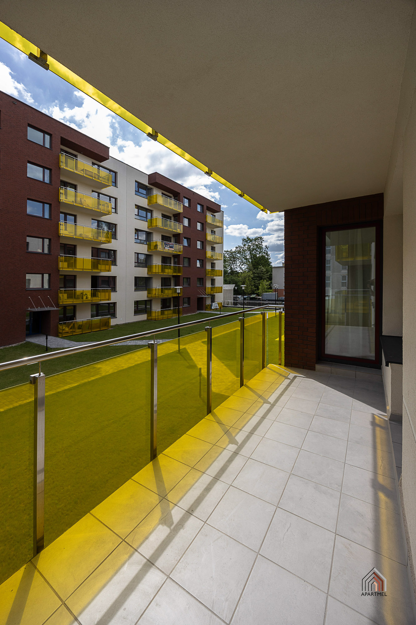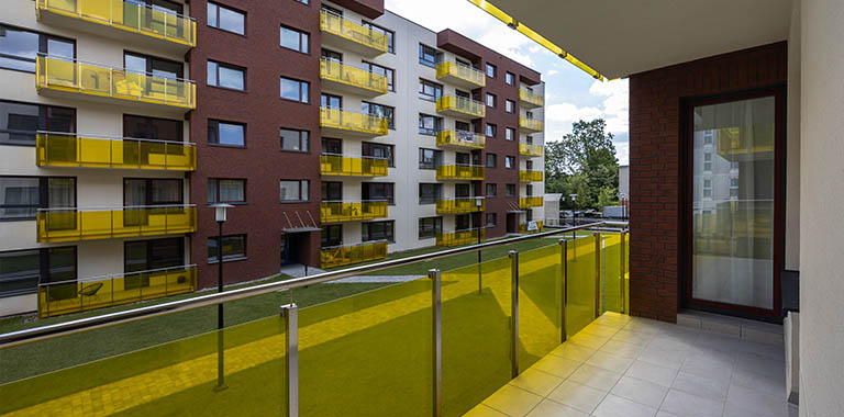 Na balkonach deska tarasowa / na ścianach tynk strukturalny / balustrada barierka + szkło