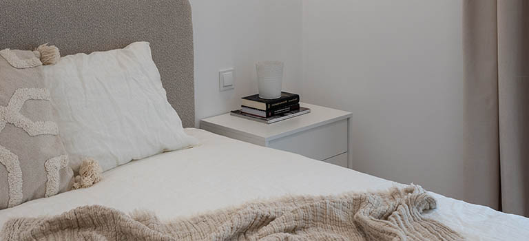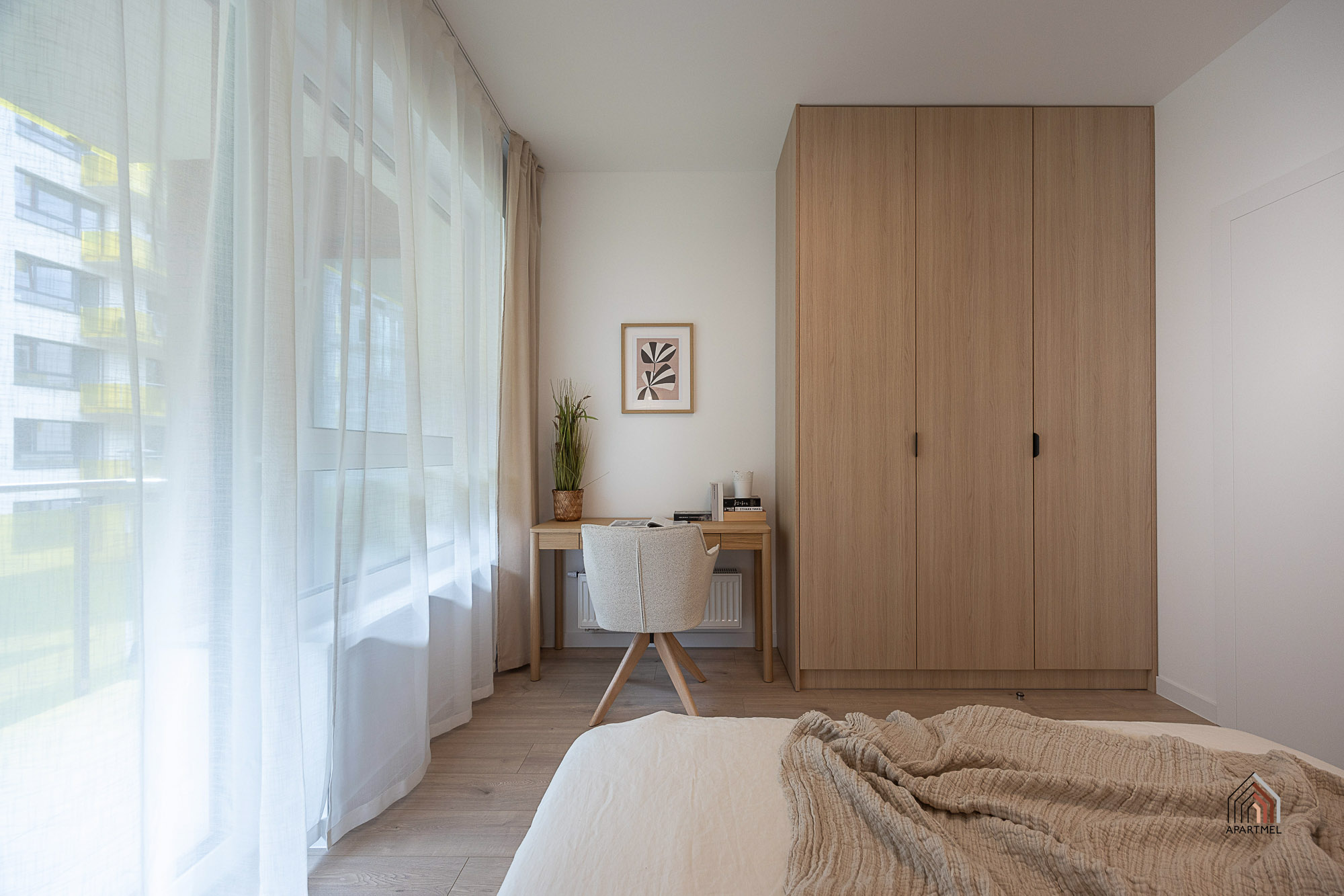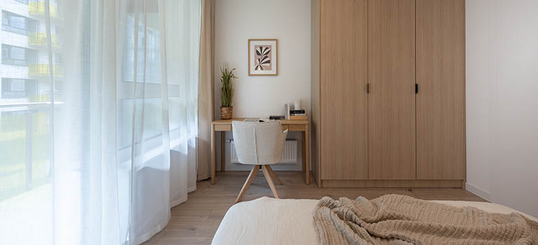 Druga sypialnia posiada łózko z szufladami, pościel, szafa, biurko z krzesłem.