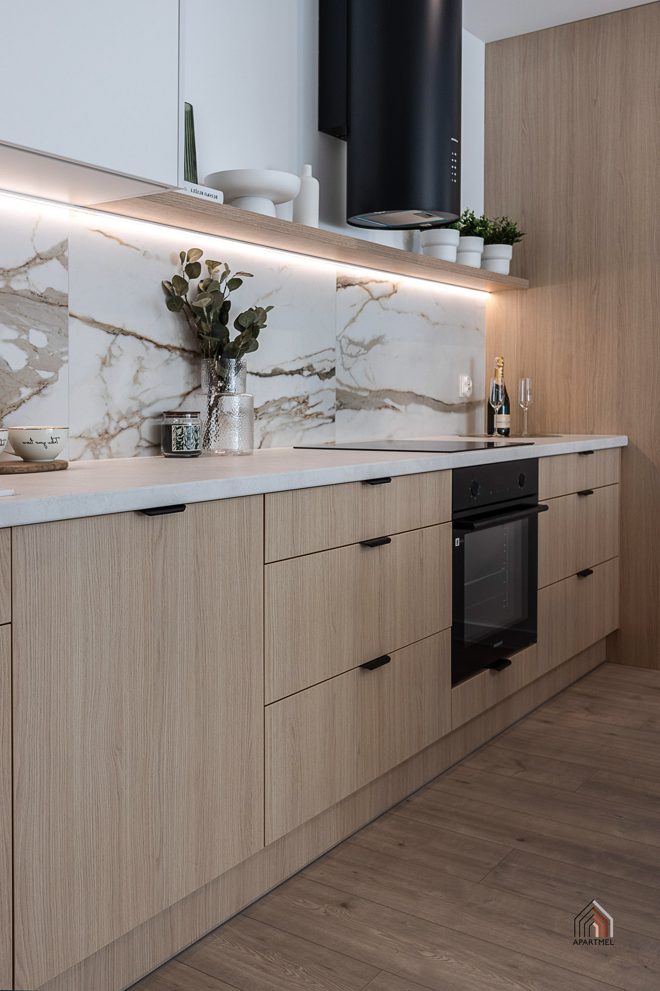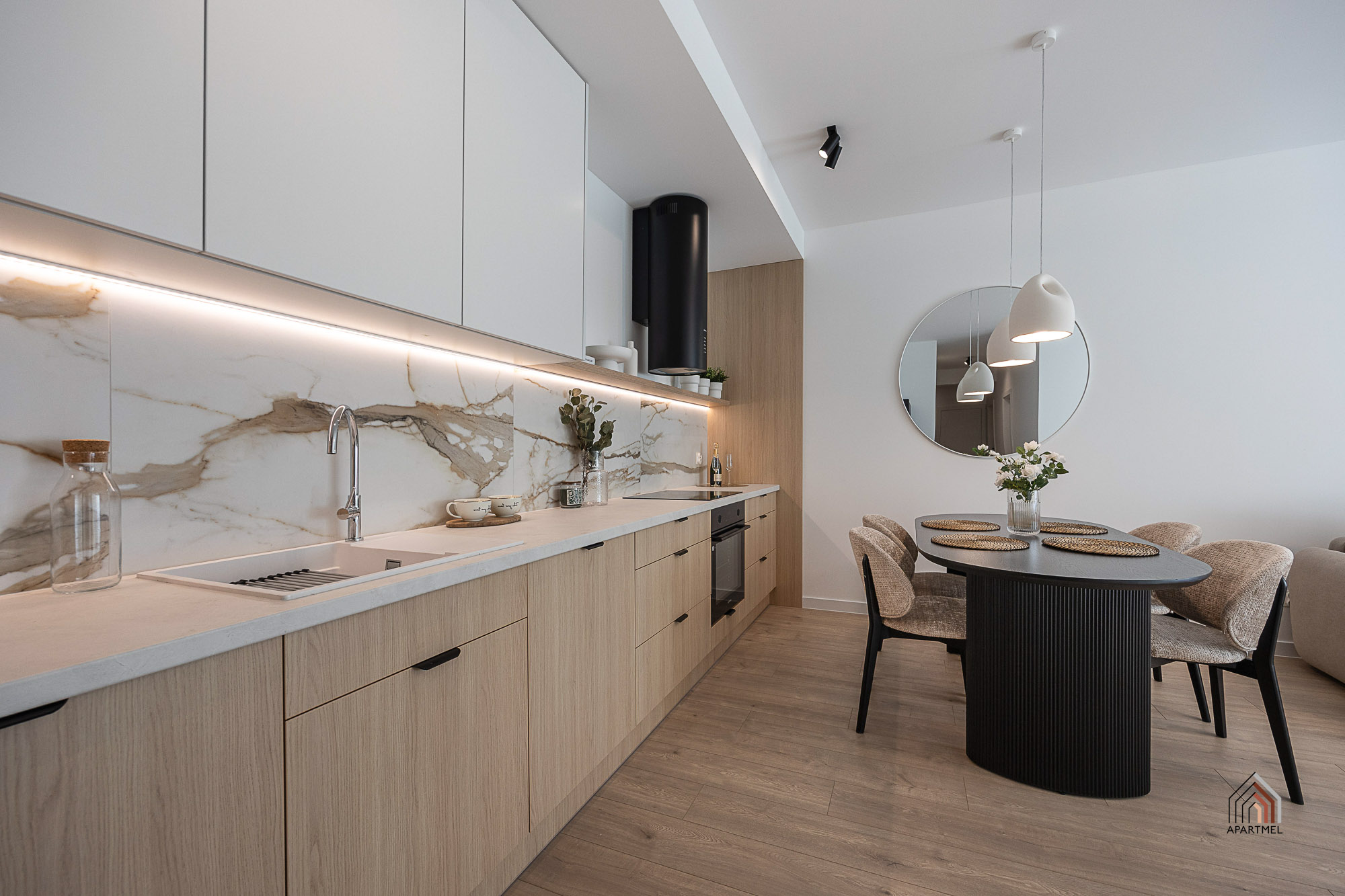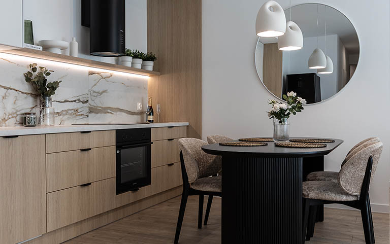 W otwartej na salon kuchni ergonomiczna zabudowa meblowa, lodówka z zamrażarką, piekarnik, płyta indukcyjna, okap i zmywarka. Dodatkowo podkładki, sztućce, talerze, miski, szklanki, filiżanki do herbaty, deski do krojenia, zestaw noży kuchennych, komplet garnków, komplet patelni, przybory do gotowania.