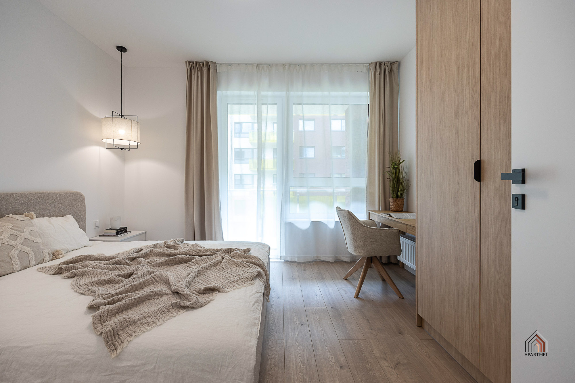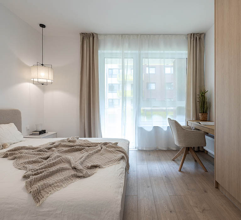 Sypialnia posiada wygodne łóżko, a także wsad pościelowy tj. kołdra i dwie poduszki, bardzo pojemną szafę i półkę wiszącą. Obok łóżka szafka nocna, biurko z krzesłem. lampki oraz gniazdka, w oknach firanki. Wyjście z sypialni bezpośrednio na balkon.