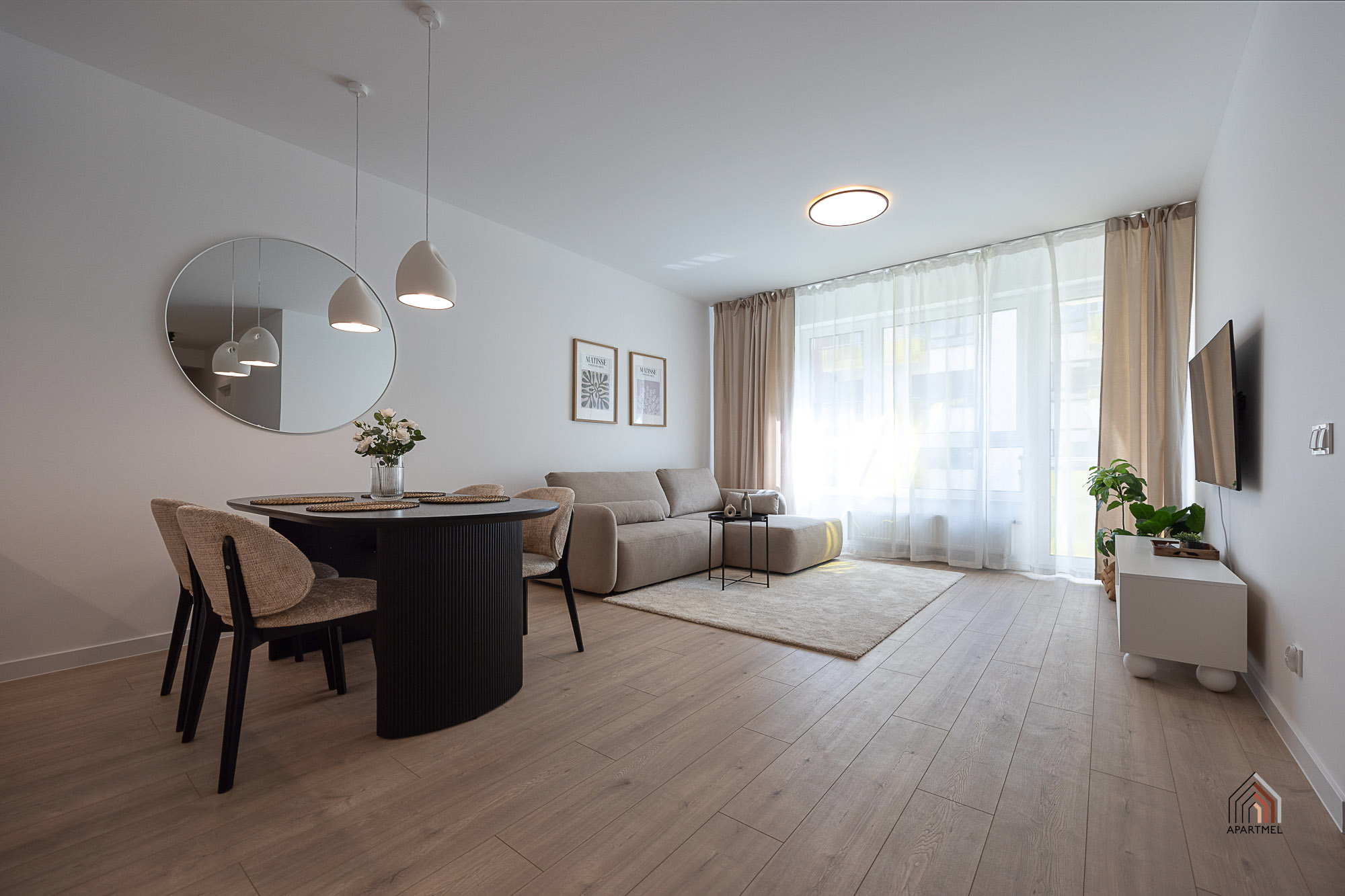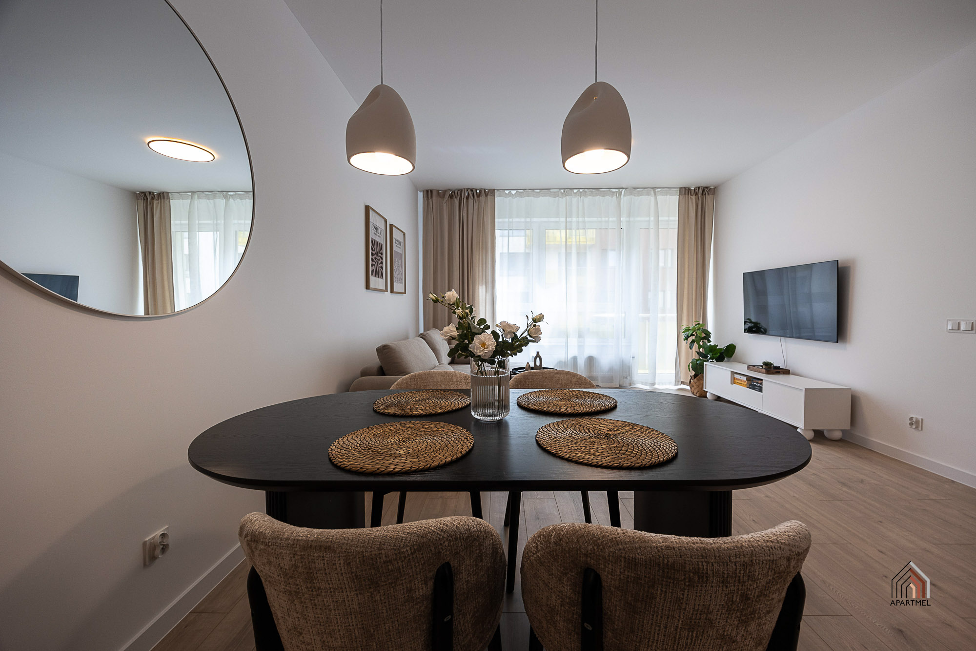 W salonie znajduje się rozkładana kanapa narożna, fotel, komoda z witryną szklaną, podwójny stolik kawowy, szafka RTV i podwieszany telewizor telewizor 55" Samsung 4K Smart TV, duży stół i 4 krzesła. W bardzo przestronnych oknach delikatne firanki i zaciemniające zasłony.