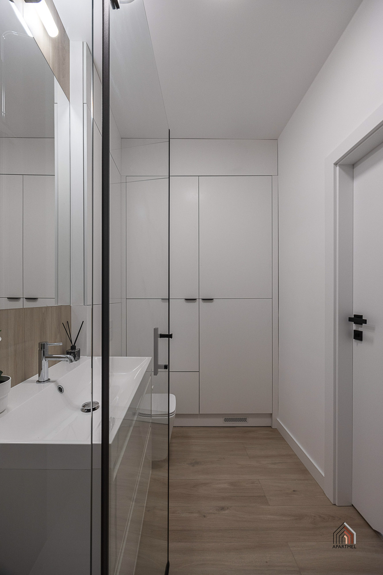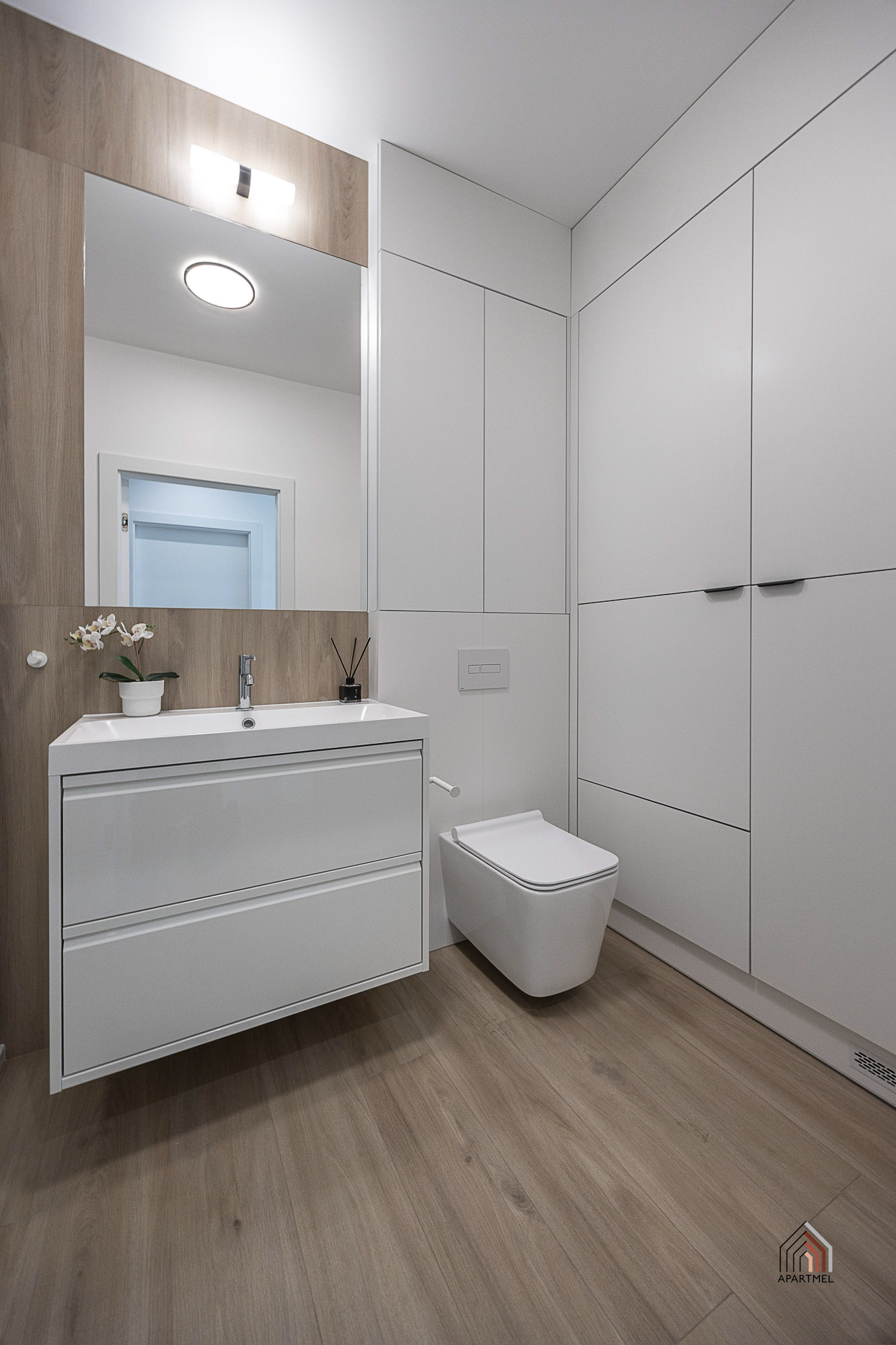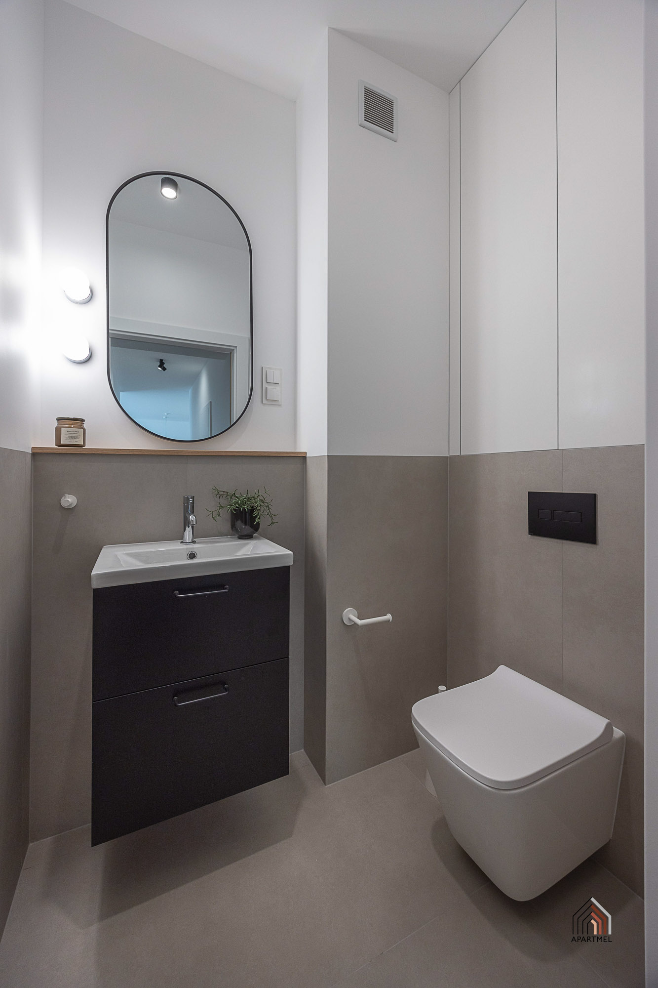 Osobne wc z umywalką i pojemnymi szafkami w eleganckiej zabudowie.