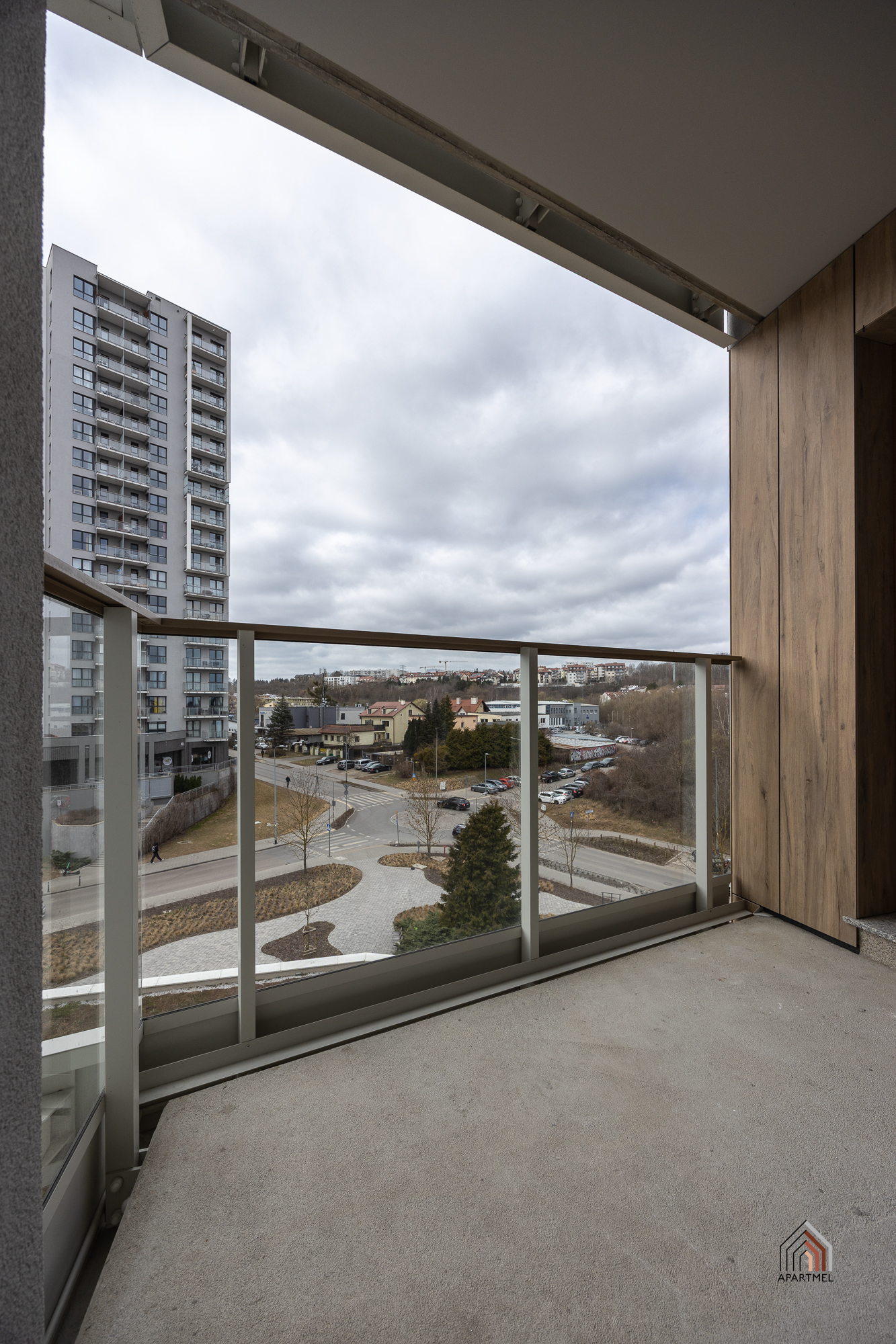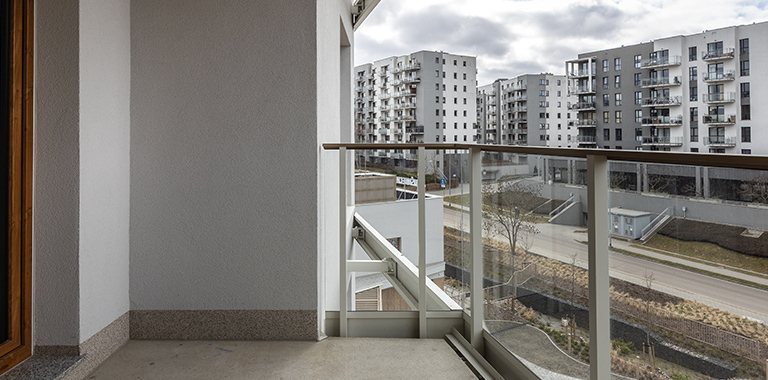 Na balkonie płytka gresowa, na ścianach tynk strukturalny, balustrada i szklana barierka.