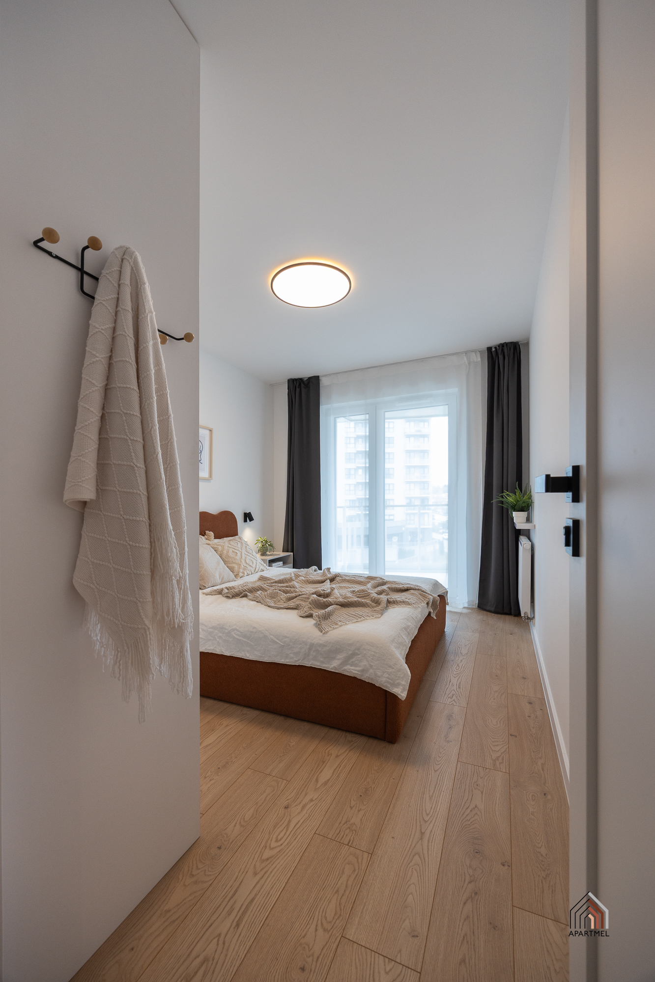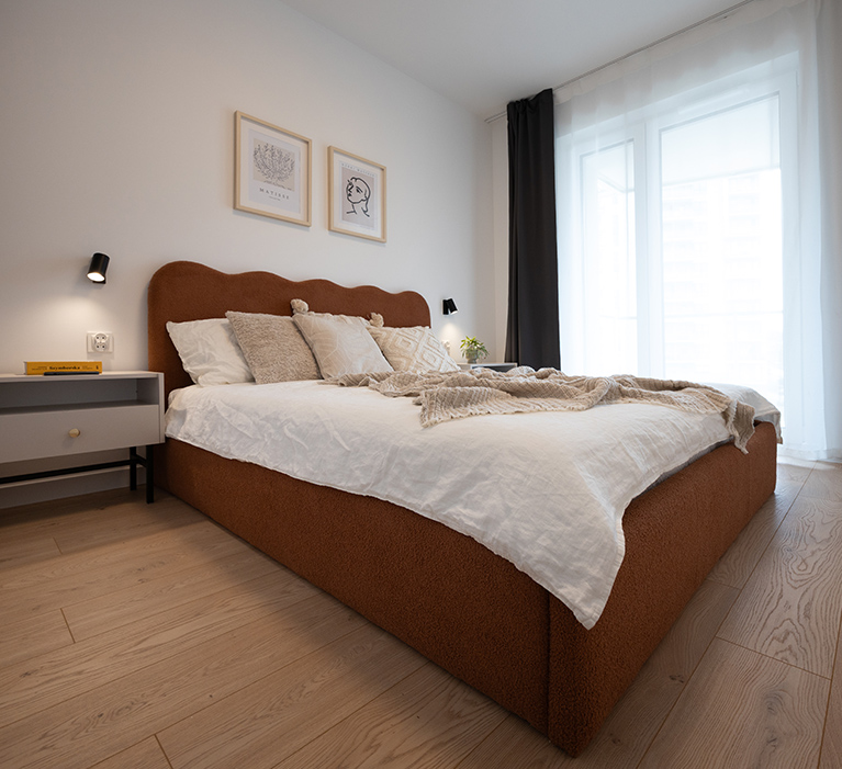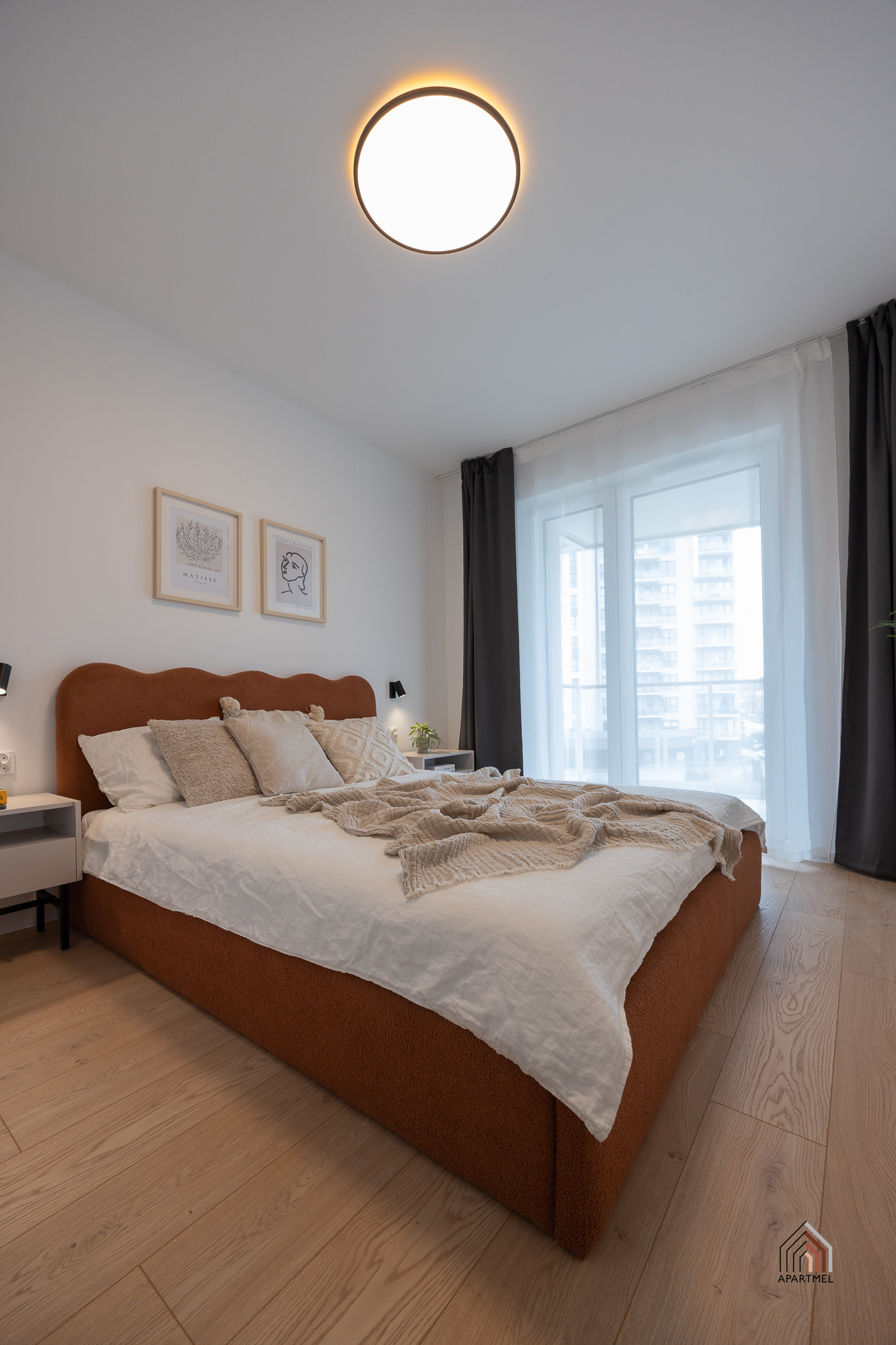 Sypialnia posiada wygodne łóżko z pojemnikiem na pościel, miękki, dekoracyjny zagłówek, pojemną szafę z regałem półkowym. Obok łóżka szafki nocne, lampki oraz gniazdka, w oknach firanki i zaciemniające zasłony.