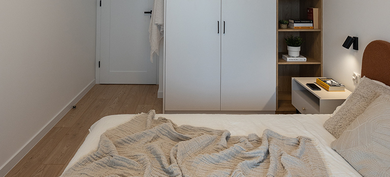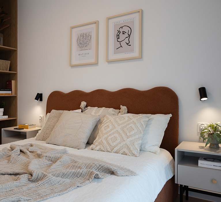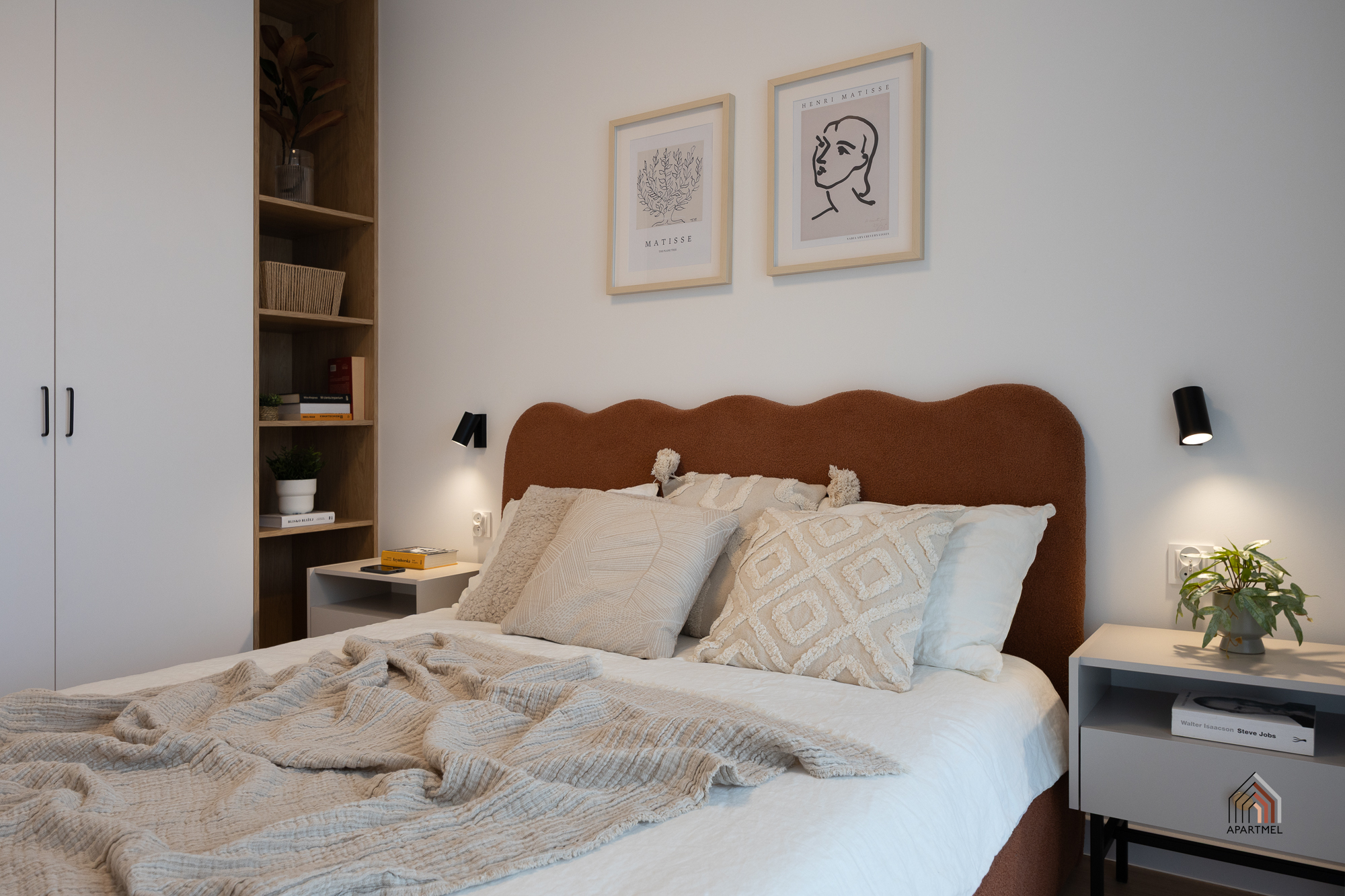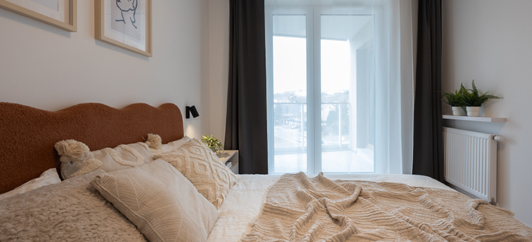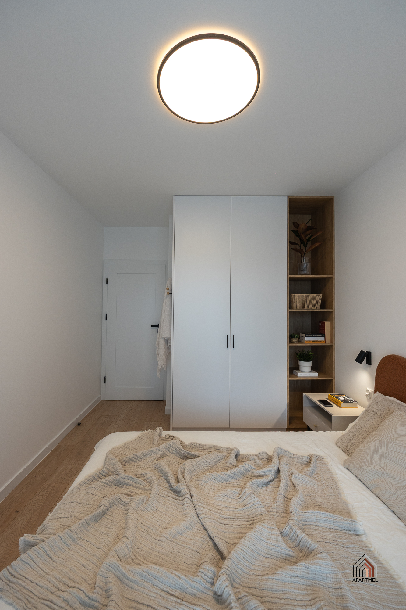 Sypialnia posiada wygodne łóżko z pojemnikiem na pościel, miękki, dekoracyjny zagłówek, pojemną szafę z regałem półkowym. Obok łóżka szafki nocne, lampki oraz gniazdka, w oknach firanki i zaciemniające zasłony.