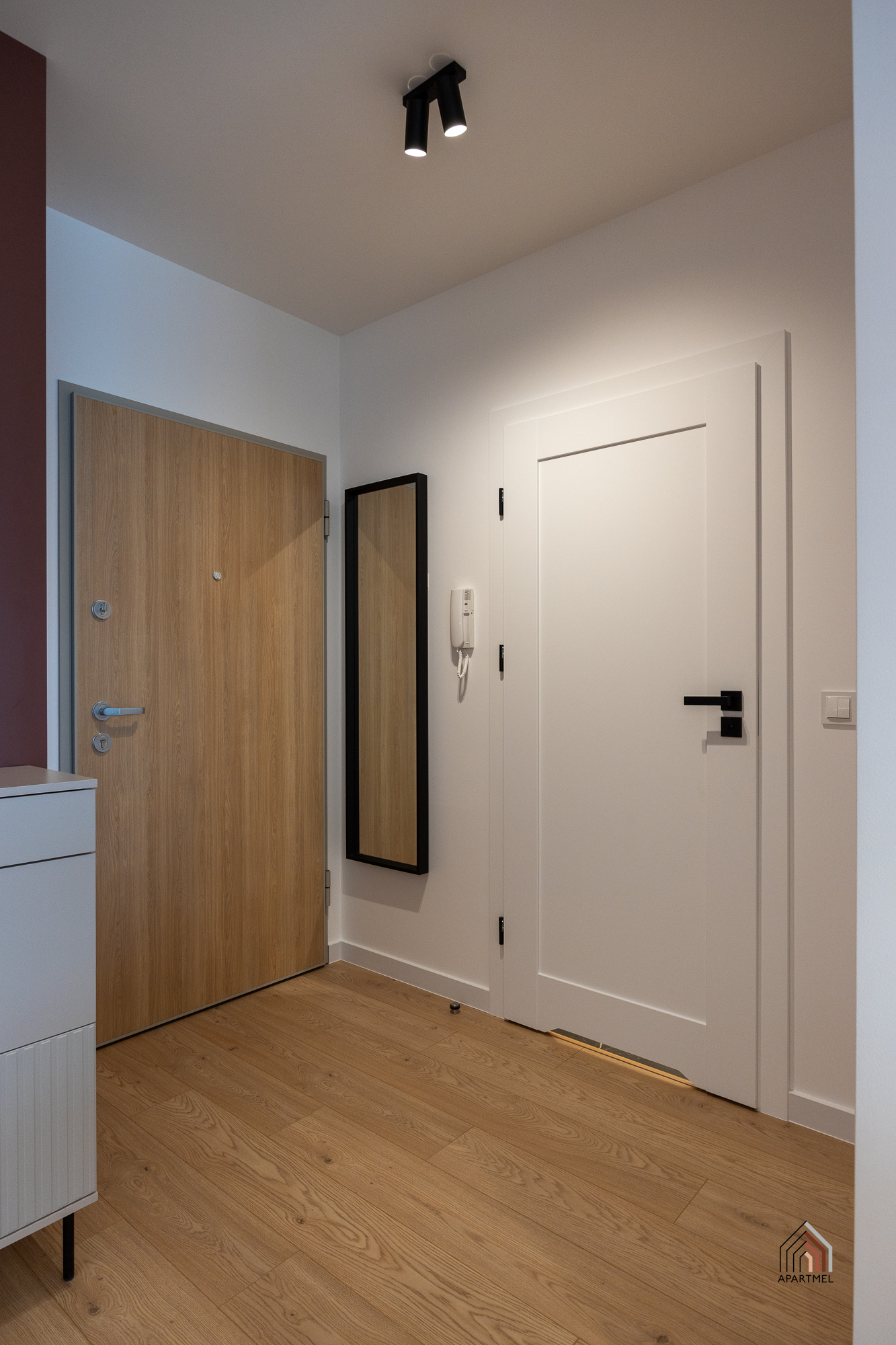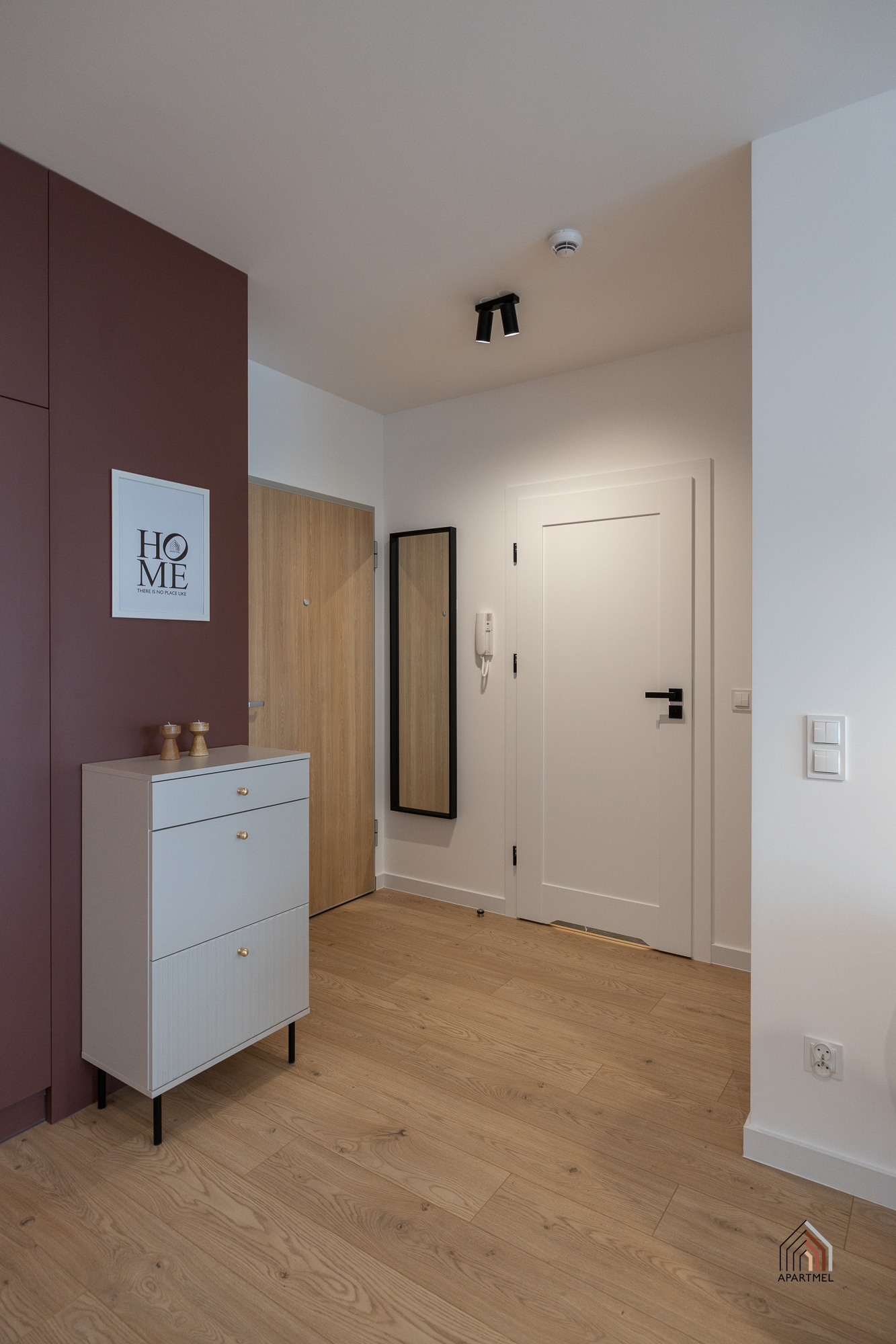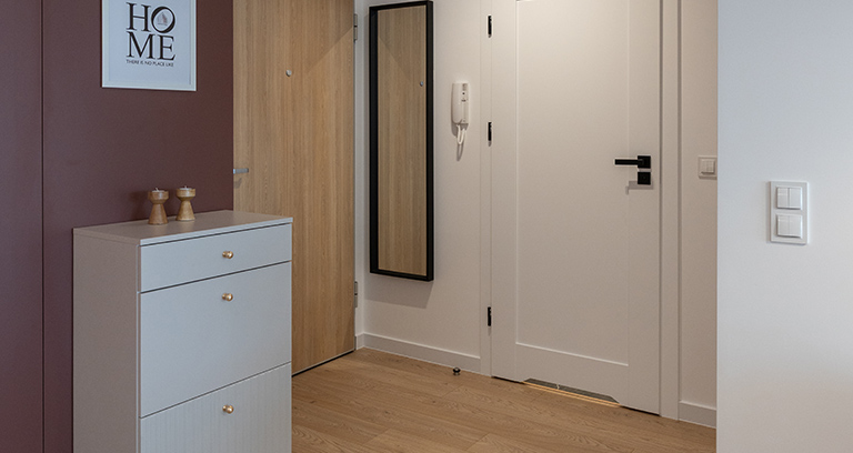 Strefa wejściowa z rozbudowaną szafą. Na podłogach położone są dobrej jakości panele o podwyższonej odporności na wilgoć oraz płytki ceramiczne.