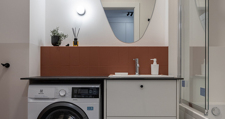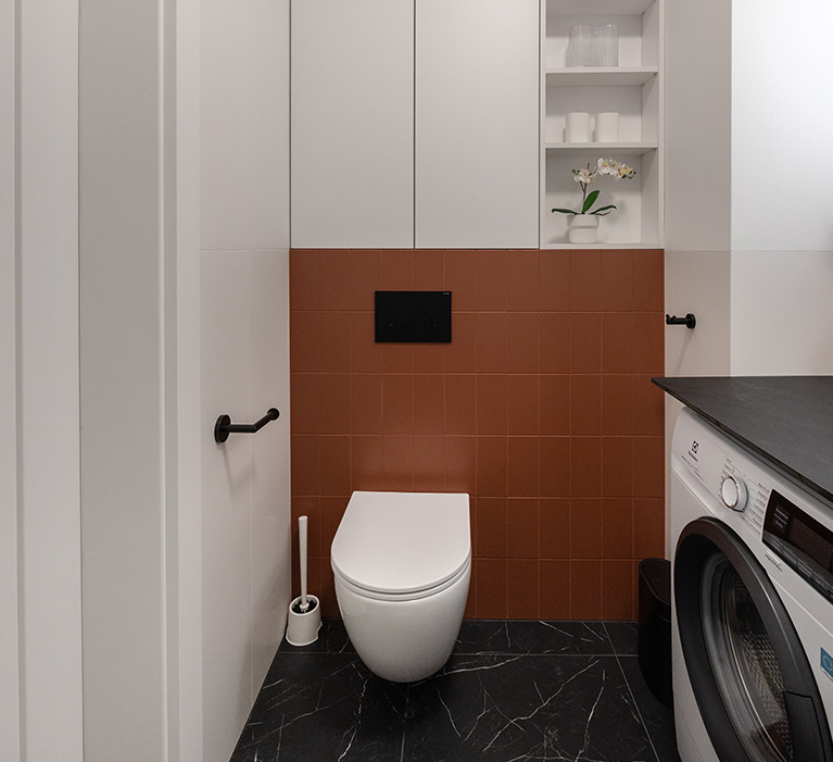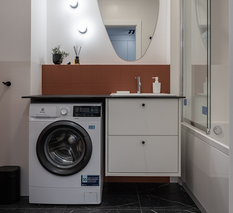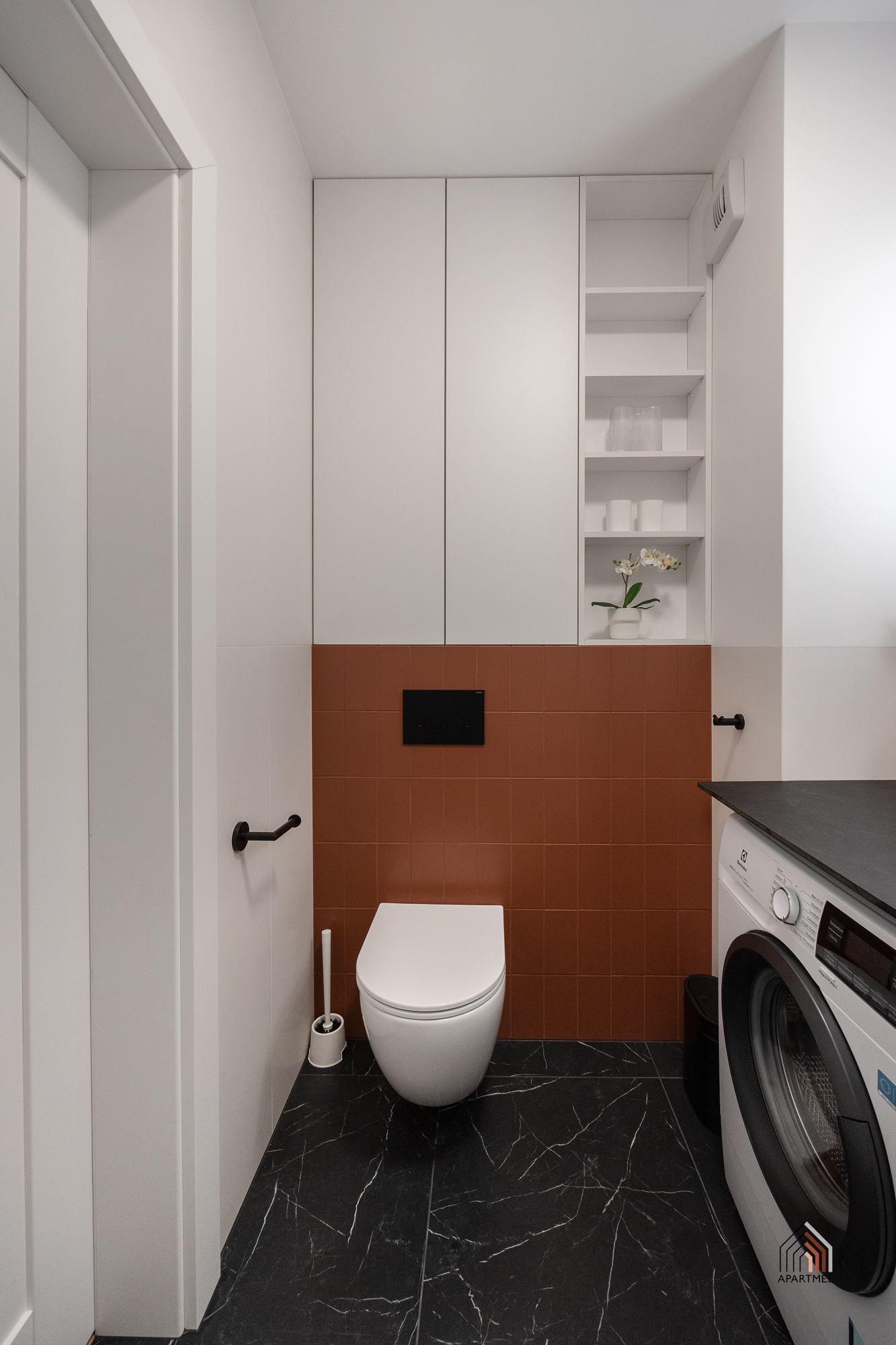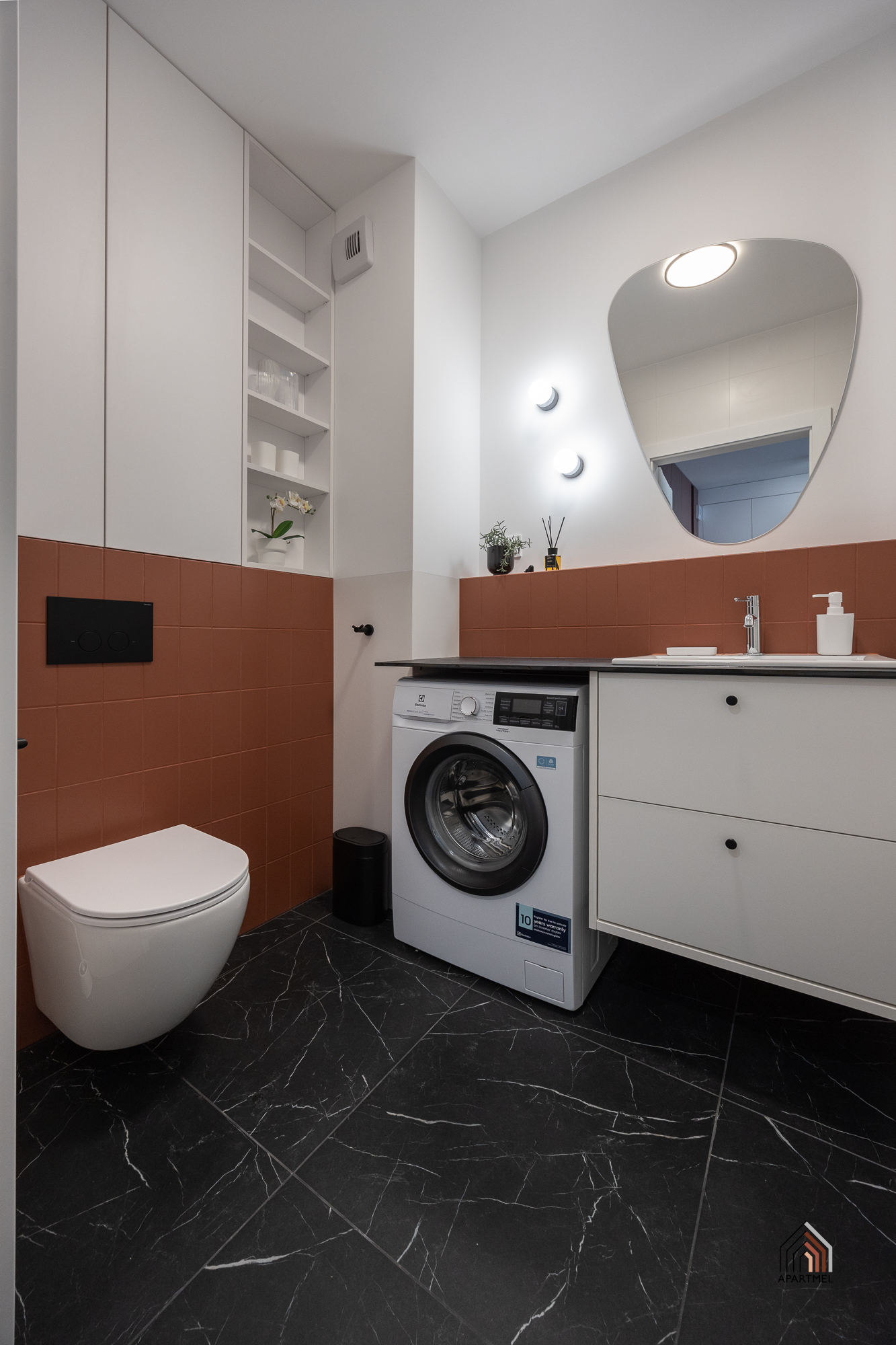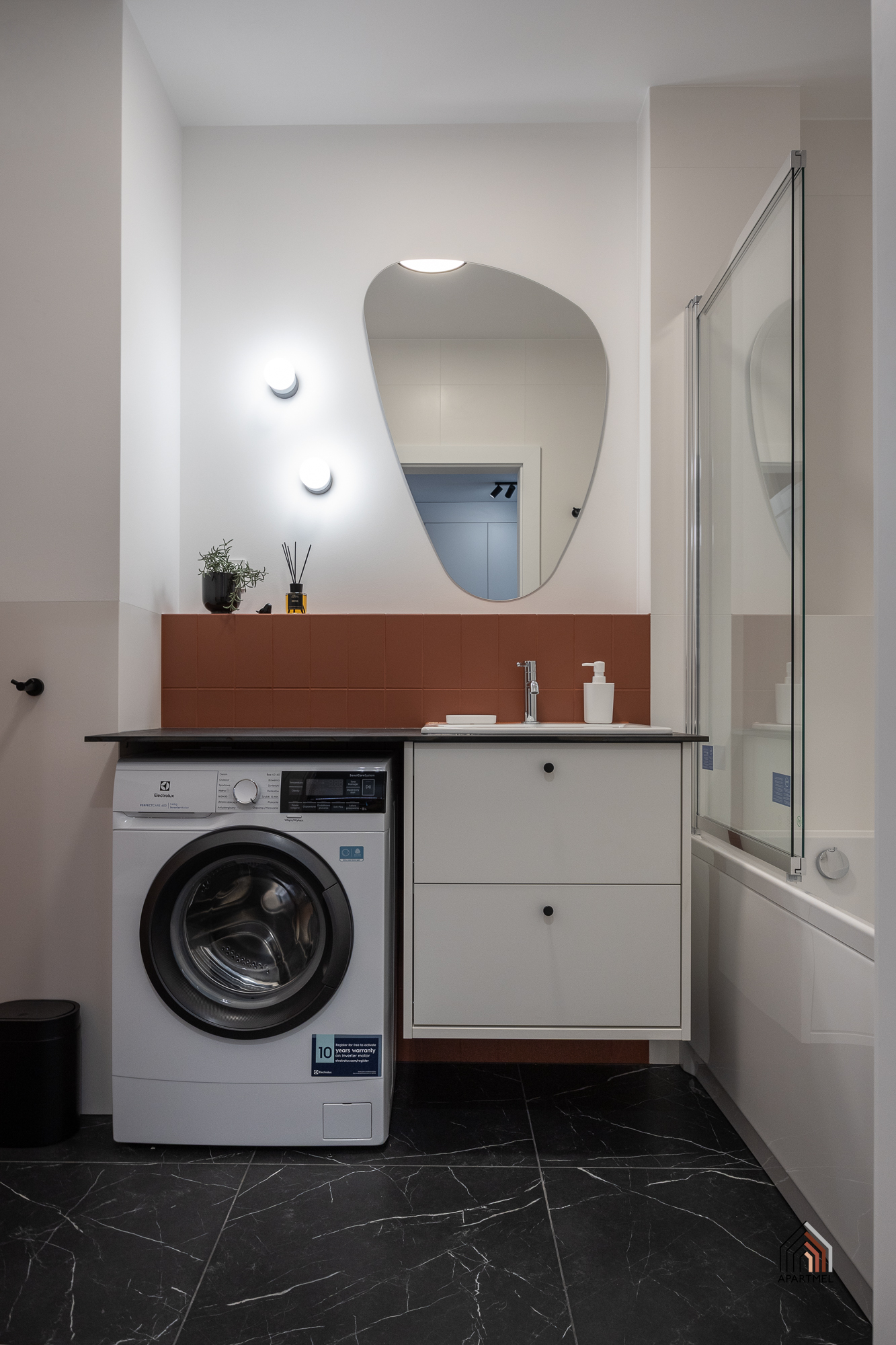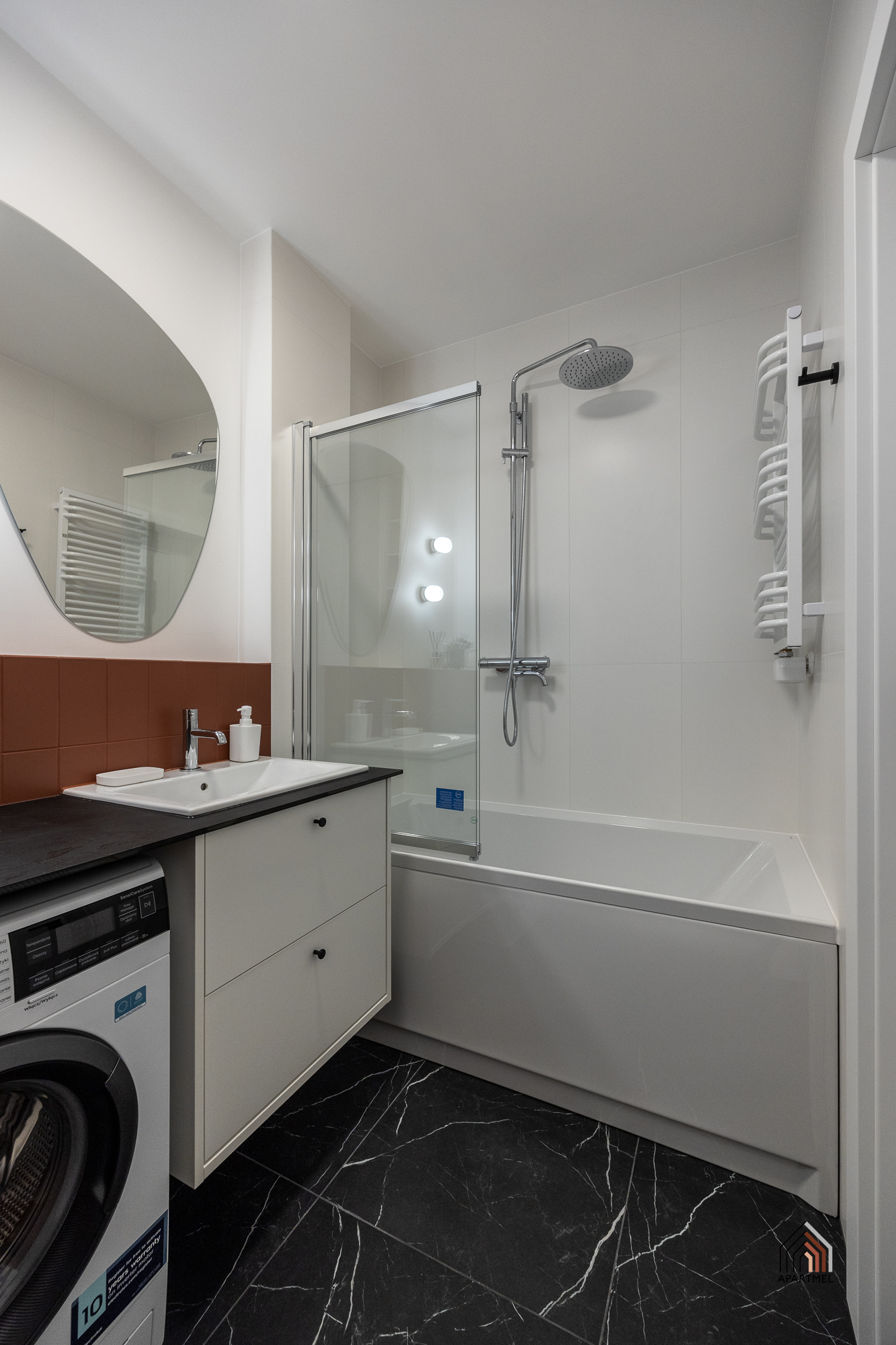 Łazienka – wanna z prysznicem typu deszczownica, wc, szafka z umywalką, pralka, zabudowa szafkowa.