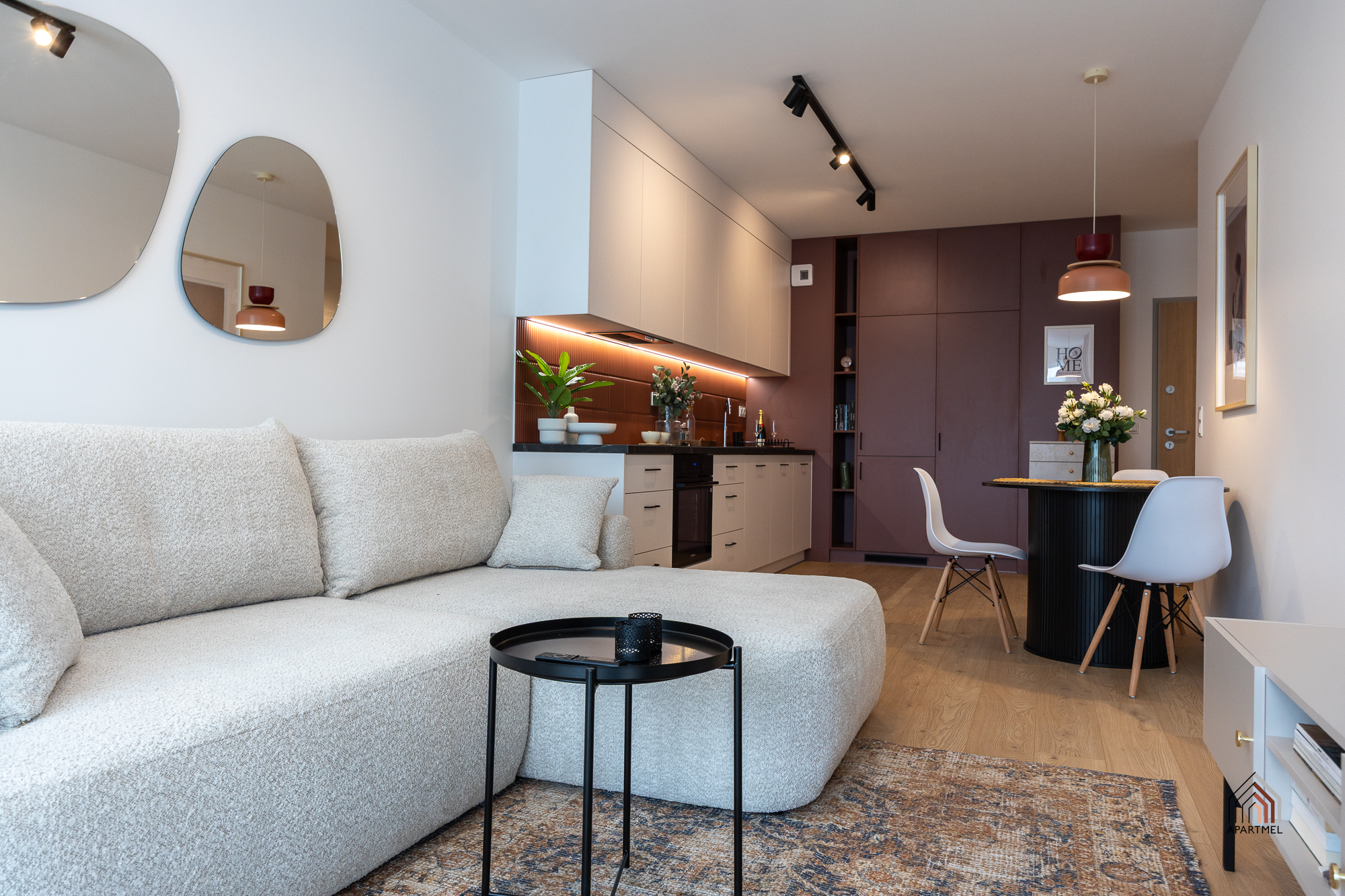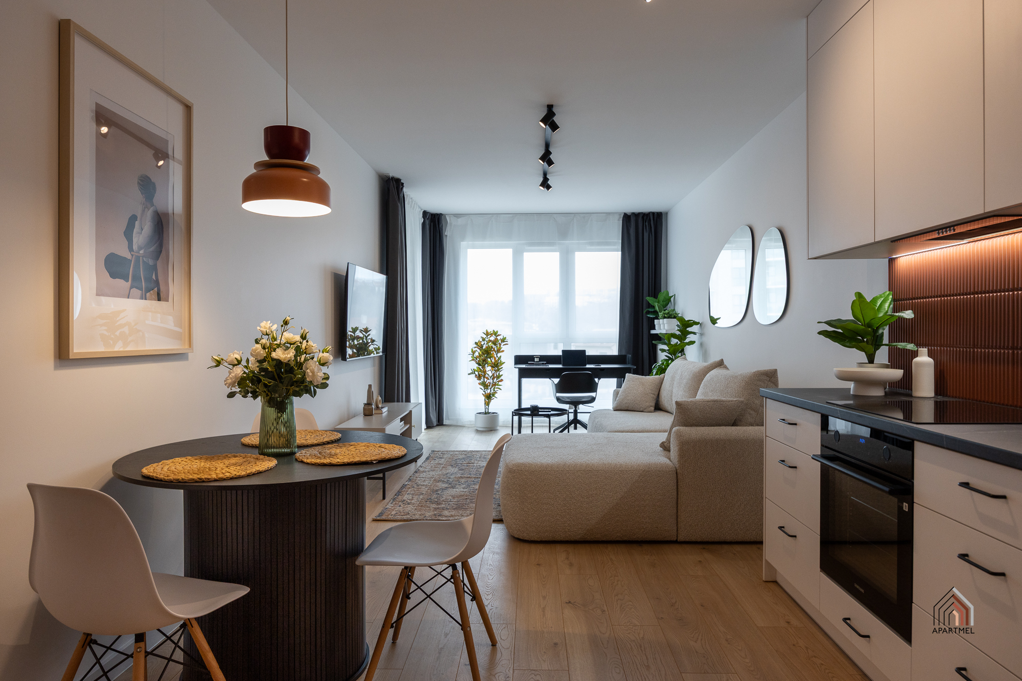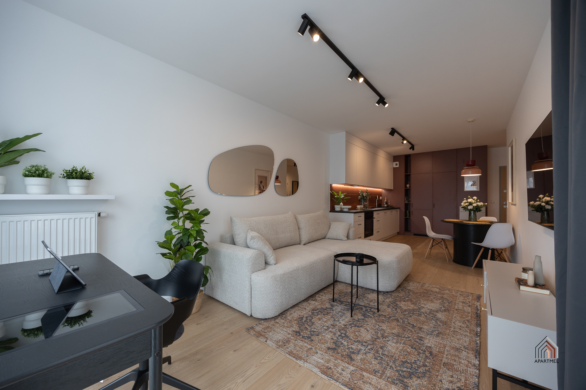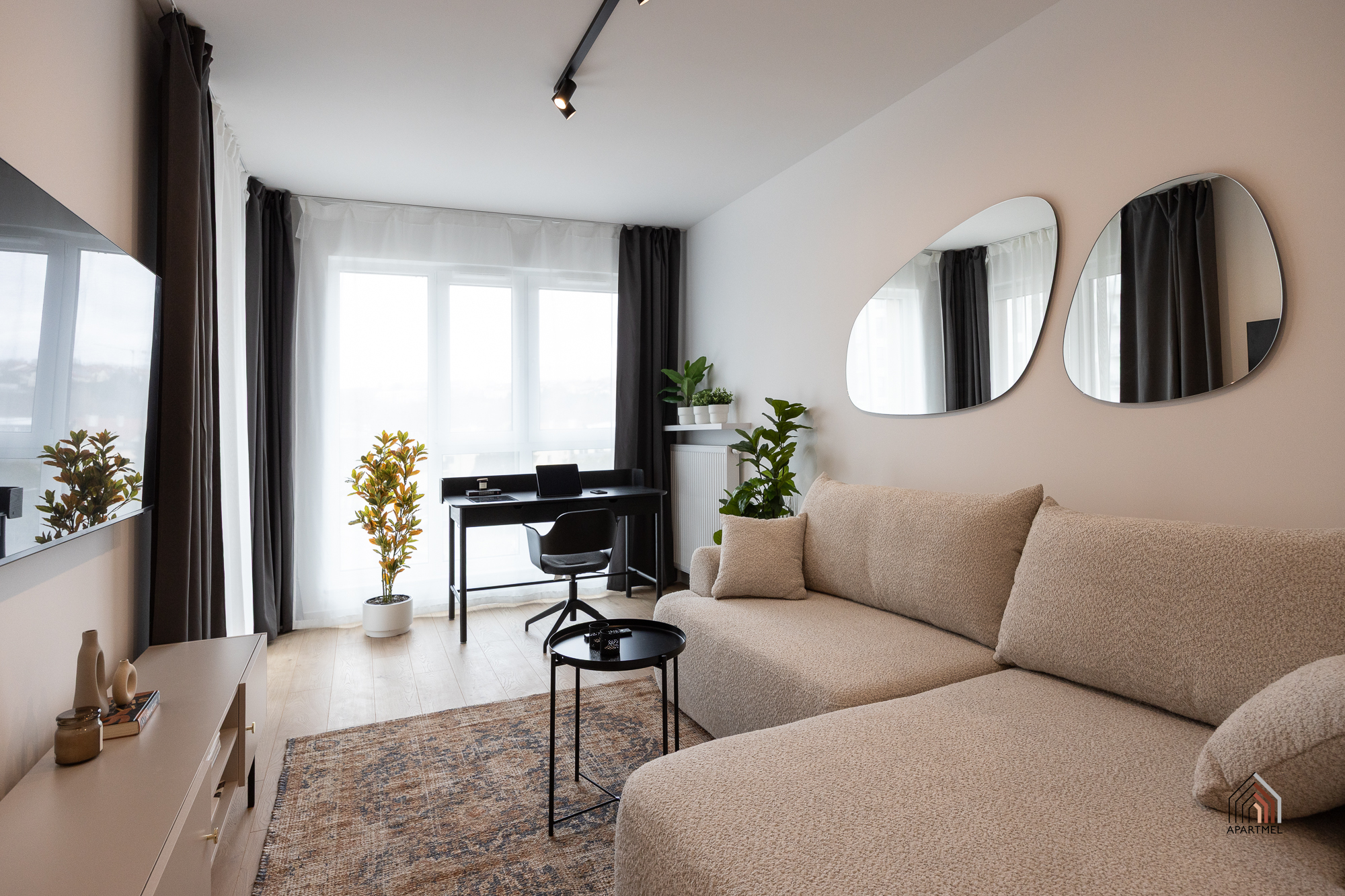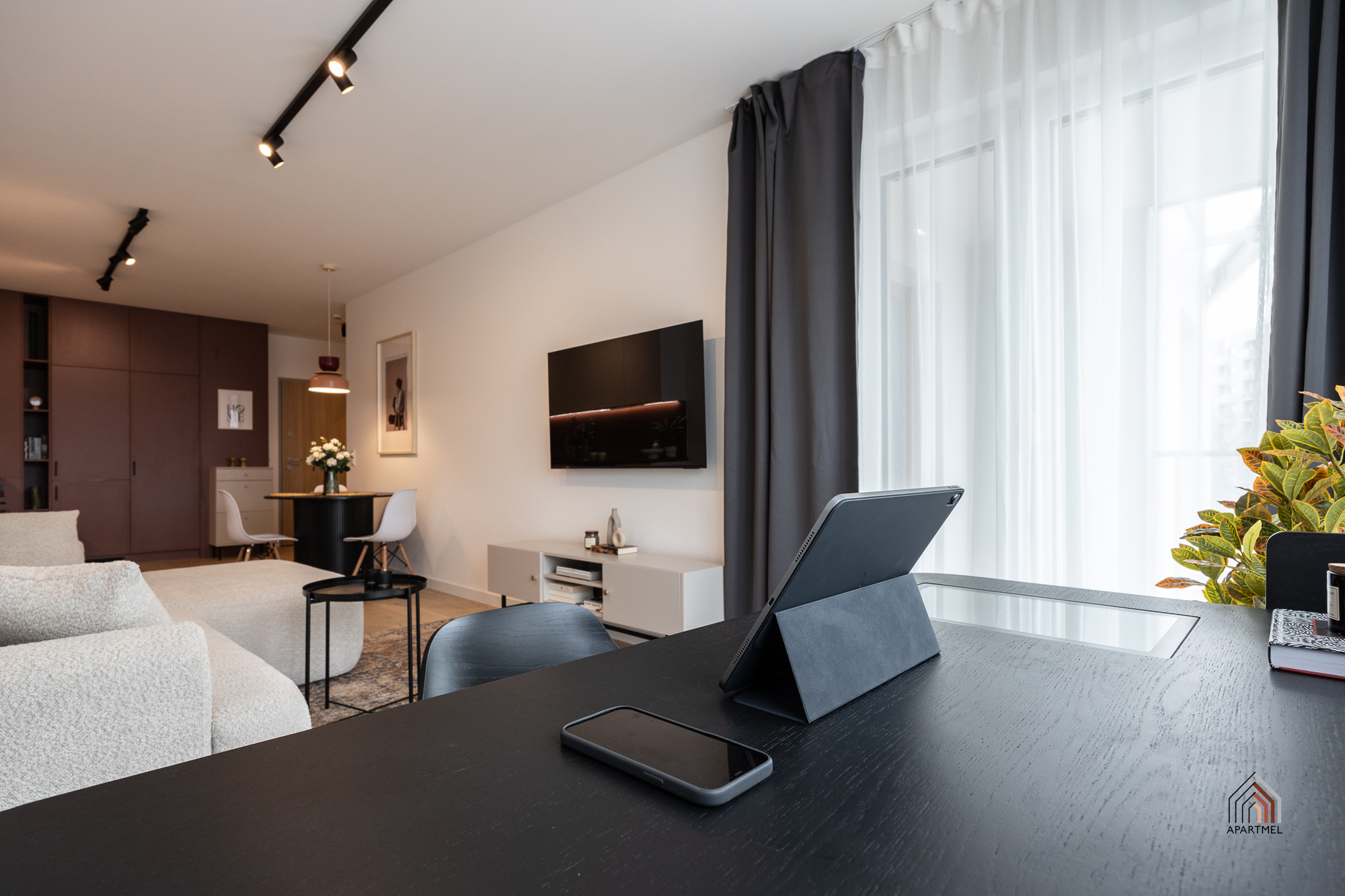 W salonie znajduje się rozkładana kanapa narożna, stolik kawowy, fotel, szafka RTV i podwieszany telewizor 55" Samsung 4K Smart TV, stół i 3 krzesła. W dużych oknach delikatne firanki i lekkie zasłony. Pod oknem duże, wygodne biurko do pracy, z wygodnym fotelem.