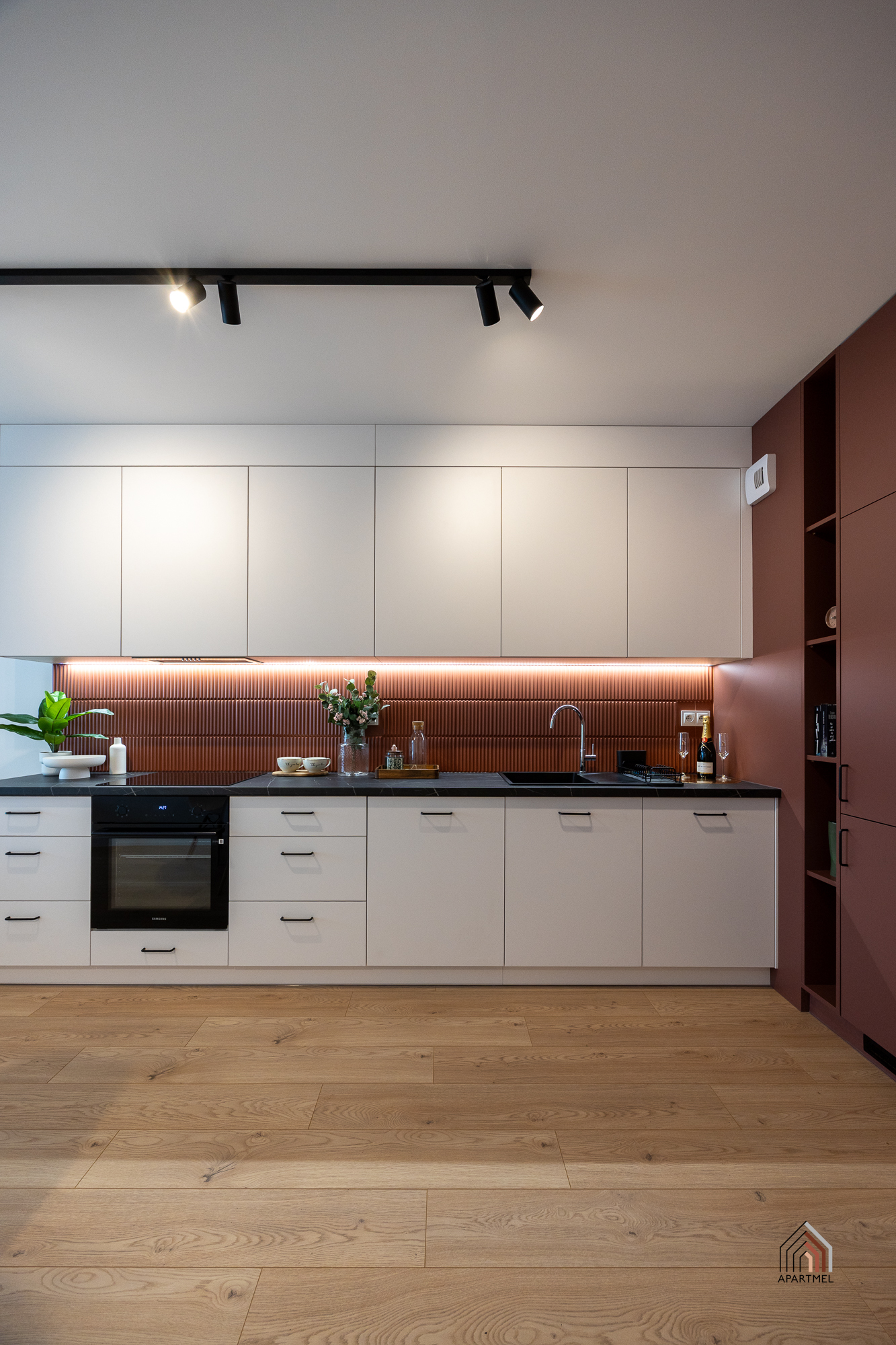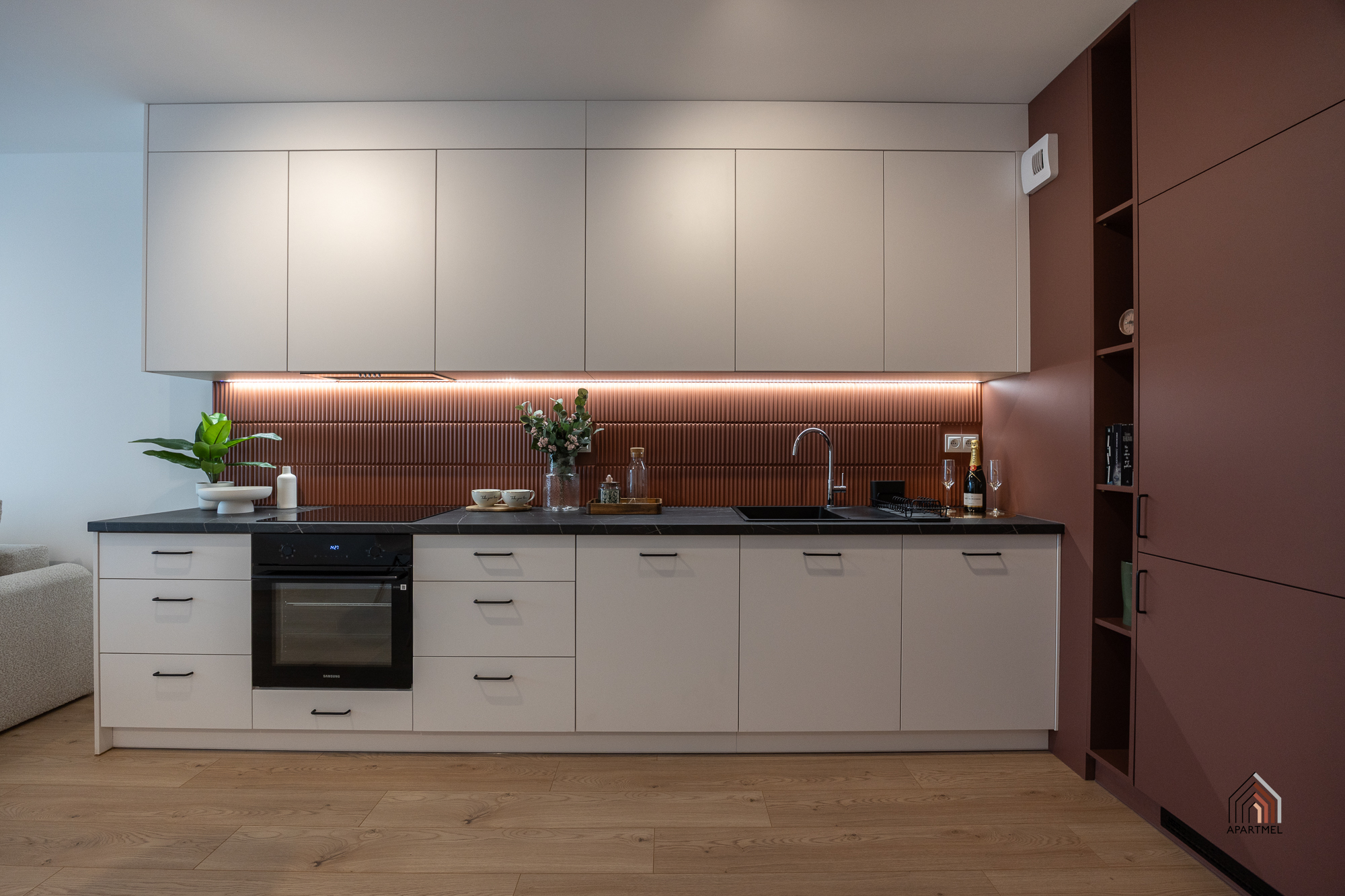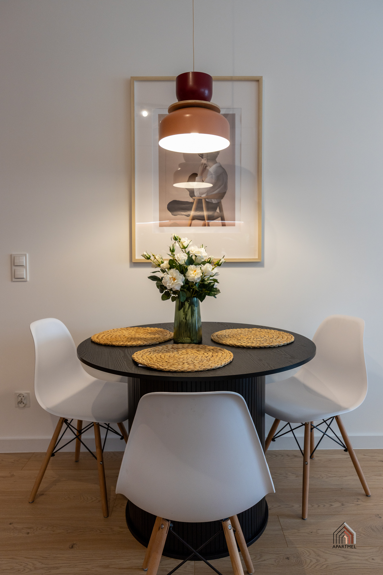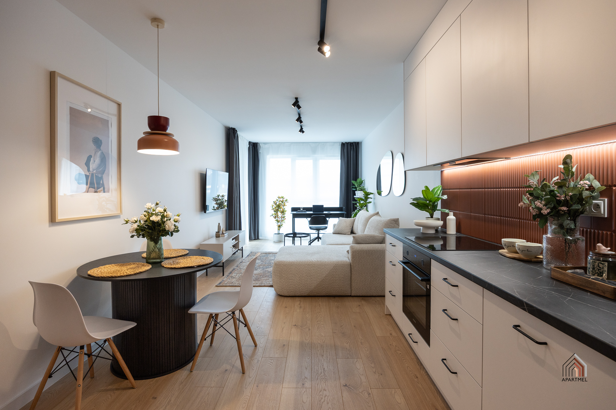 W kuchni ergonomiczna zabudowa meblowa, lodówka z zamrażarką, piekarnik, płyta indukcyjna, okap i zmywarka. Wszystkie sprzęty renomowanych marek, na gwarancji.