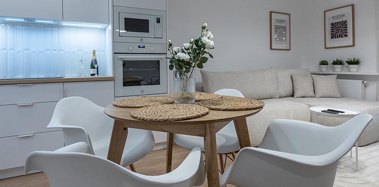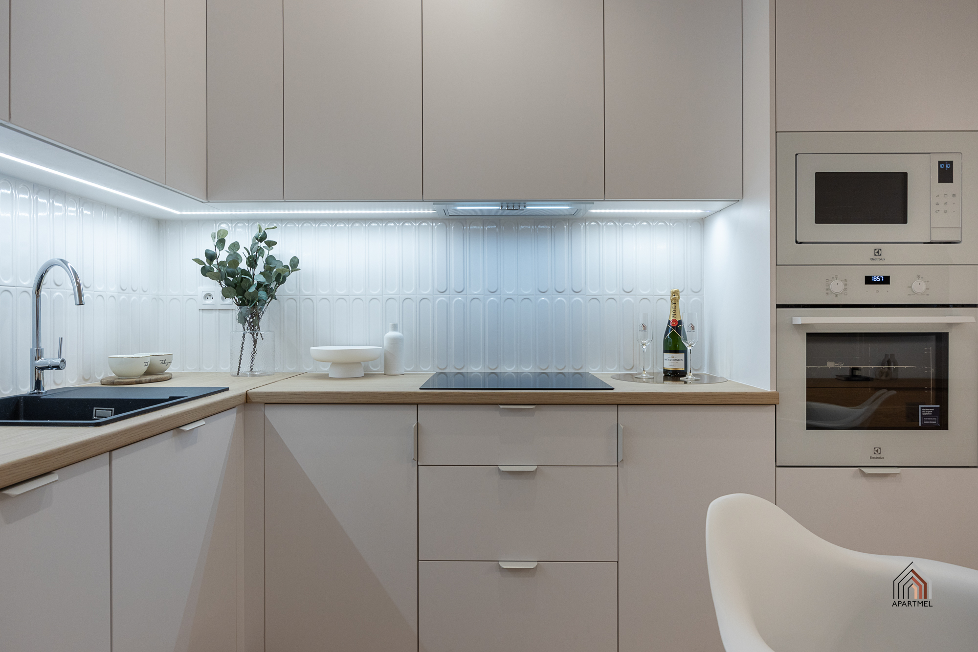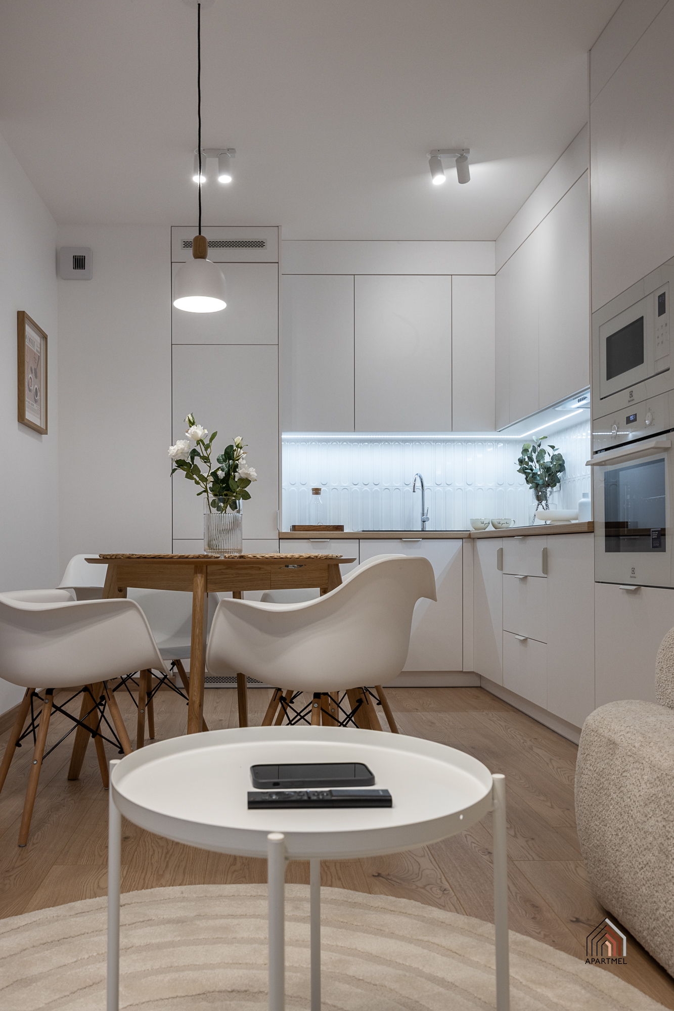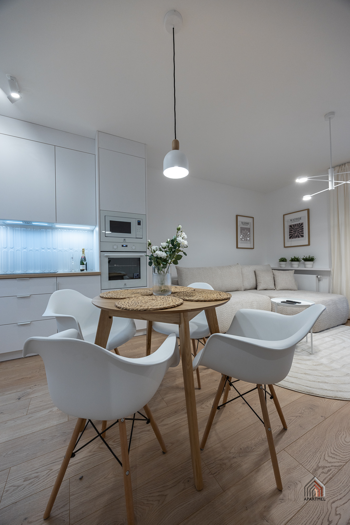 W kuchni ergonomiczna zabudowa meblowa, lodówka z zamrażarką, piekarnik, płyta indukcyjna, okap i zmywarka. Dodatkowo podkładki, sztućce, talerze, miski, szklanki, filiżanki do herbaty, deski do krojenia, zestaw noży kuchennych, komplet garnków, komplet patelni, przybory do gotowania. Wszystkie sprzęty renomowanych marek, na gwarancji.