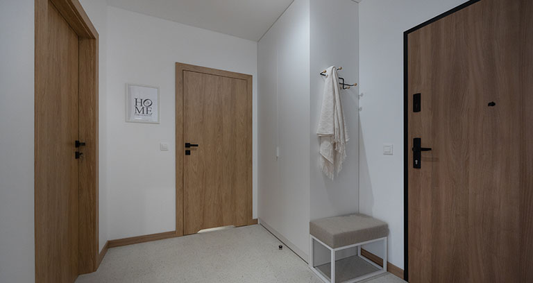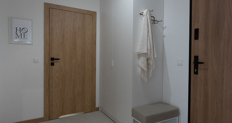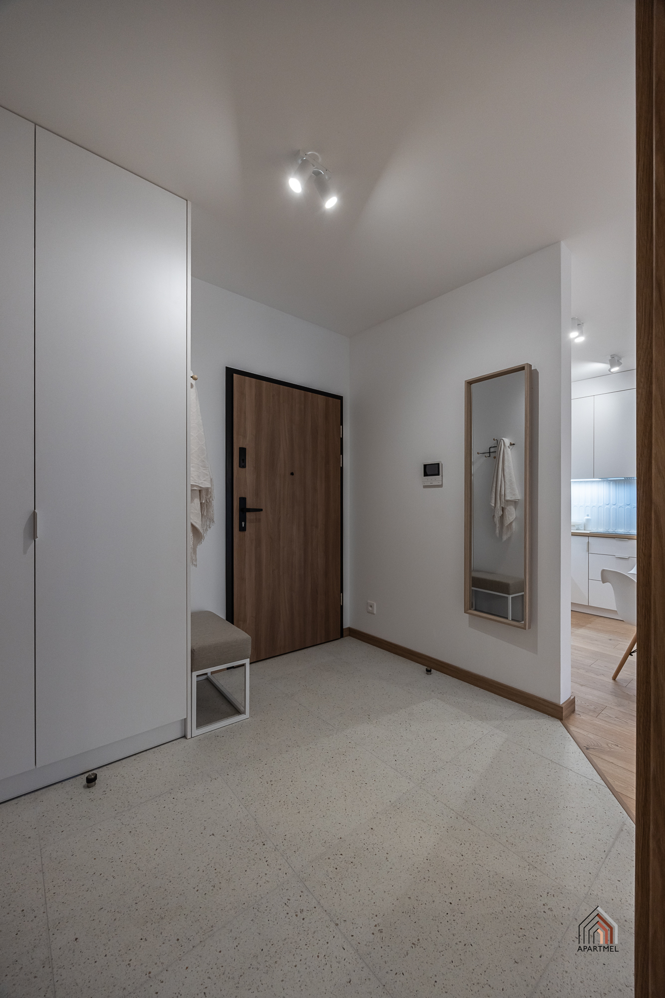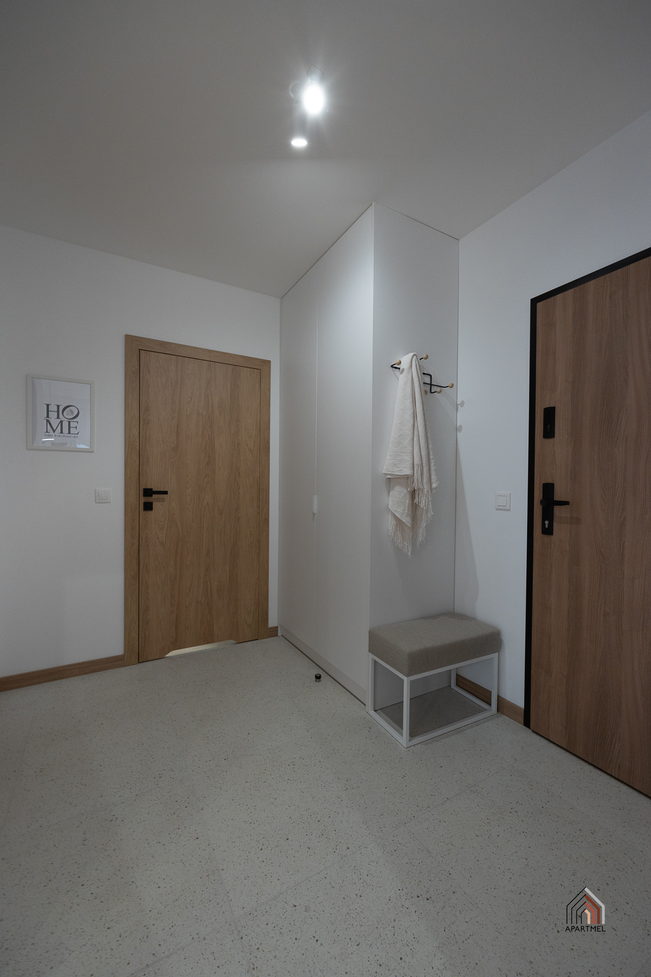 Elegancka strefa wejściowa posiada dużą, zabudowaną szafą ubraniową z wieszakami oraz szafkę gospodarczą z odkurzaczem, rozkładaną suszarką, deską do prasowania, żelazkiem oraz mopem. Dodatkowo ławeczka, podręczny wieszak na ubrania oraz duże lustro.
