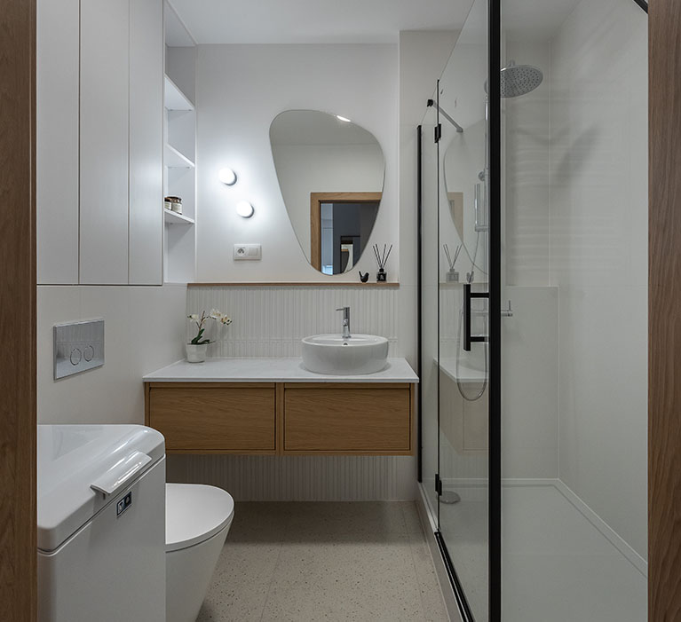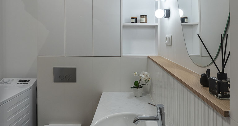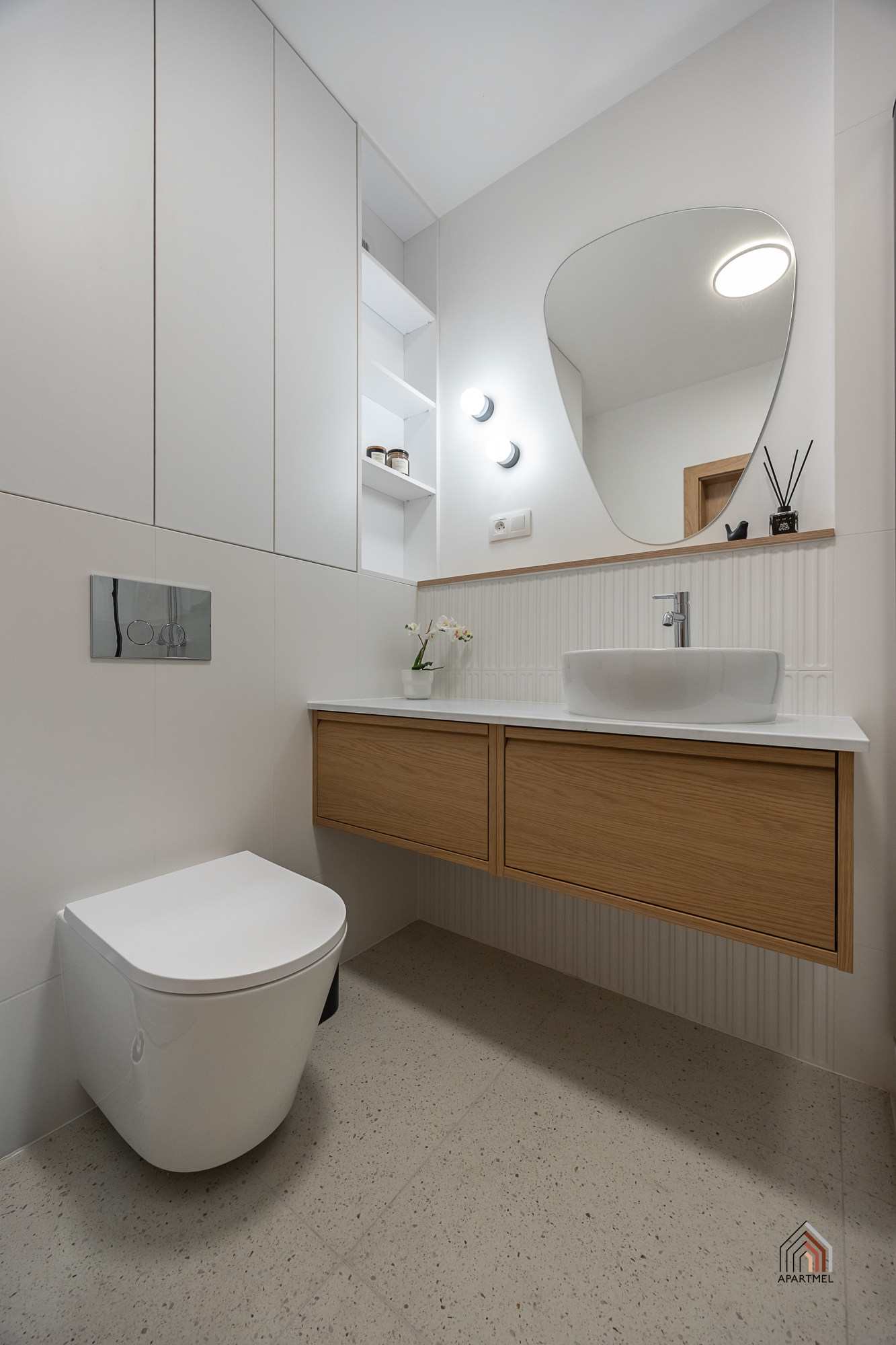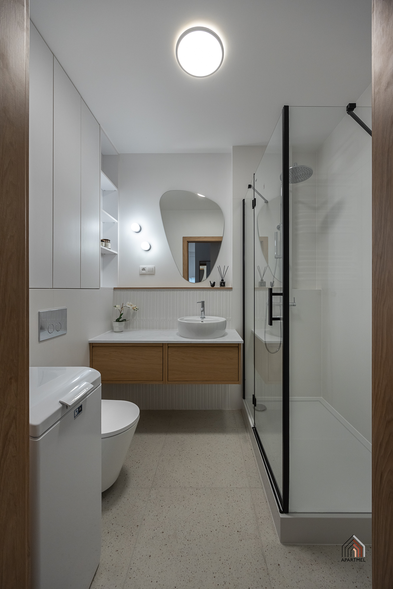 Jasna łazienka wykończona jest w stylu nowoczesnym z czarnymi dodatkami, które nadają charakteru całemu pomieszczeniu. Na wyposażeniu jest prysznic z deszczownicą oraz półką na kosmetyki, umywalka na szafce z dwiema szufladami, pralkę Electrolux, miskę ustępową wiszącą z baterią bidetową w jej sąsiedztwie, bardzo duże lustro oraz kinkiety, a także wieszaki na ręczniki, uchwyt na papier toaletowy, szczotkę do wc i kosz na śmieci.