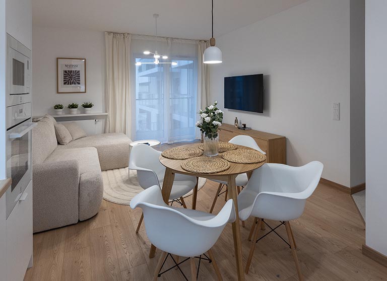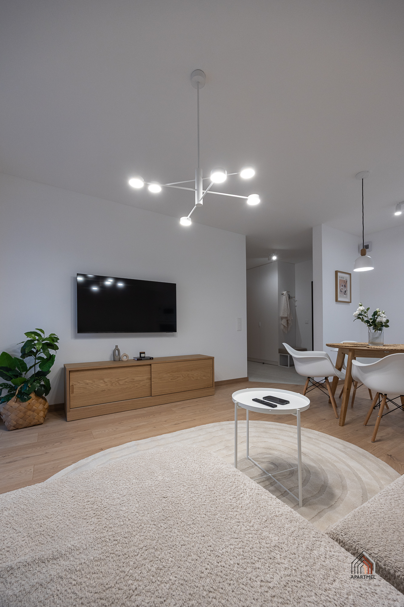 W salonie znajduje się rozkładana sofa narożna, stolik kawowy, szafka RTV i podwieszany telewizor 55" Samsung 4K Smart TV, stół i 4 krzesła. W dużych oknach balkonowych delikatne firanki i lekkie zasłony.