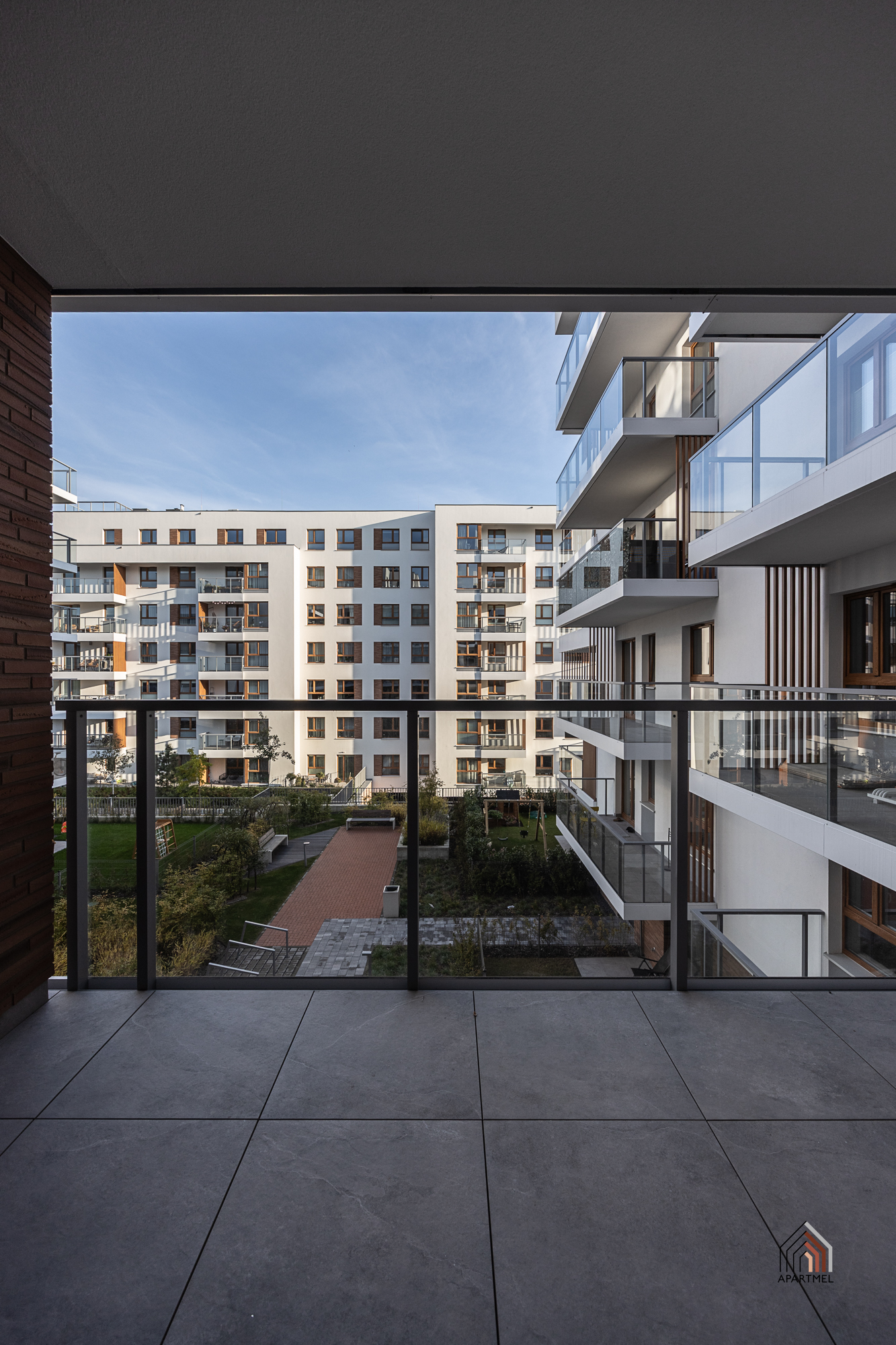 Na balkonie płytka gresowa, na ścianach tynk strukturalny, balustrada i szklana barierka.