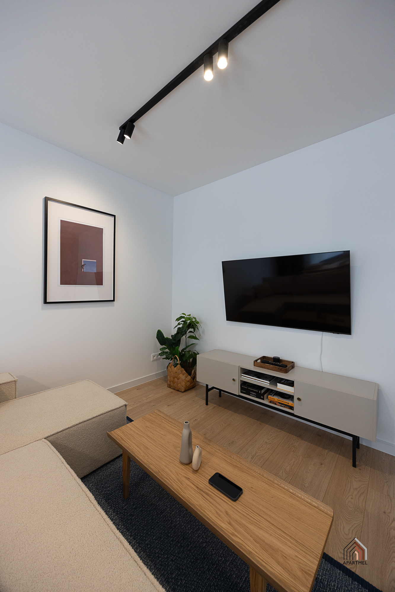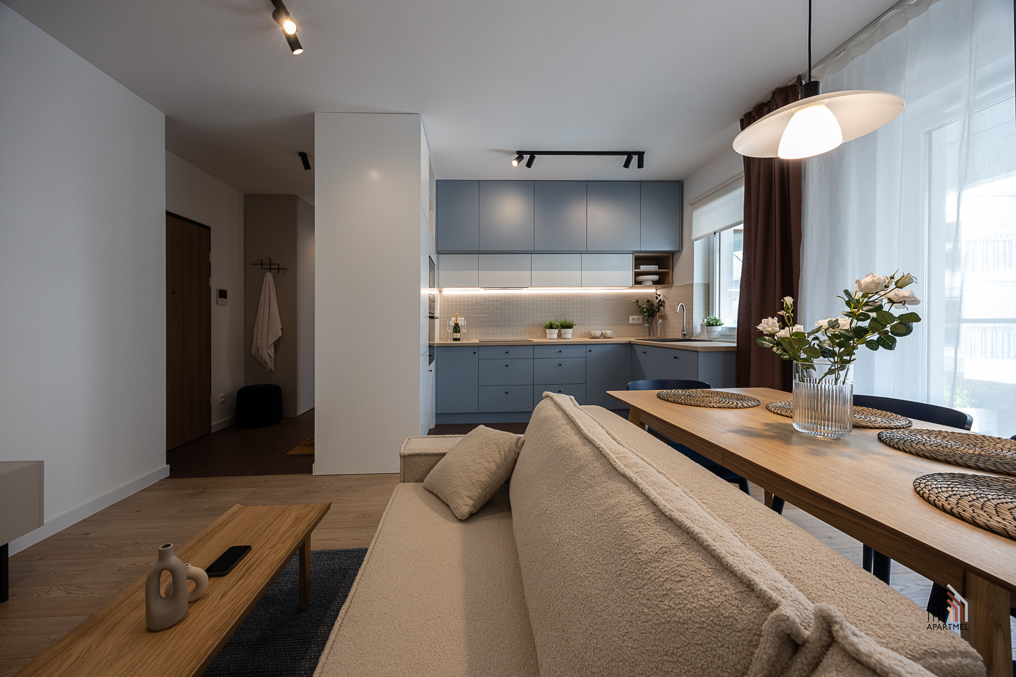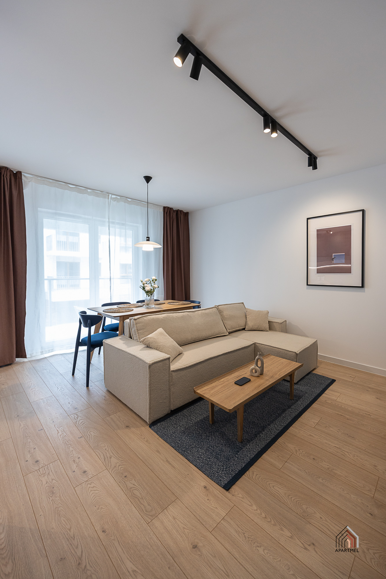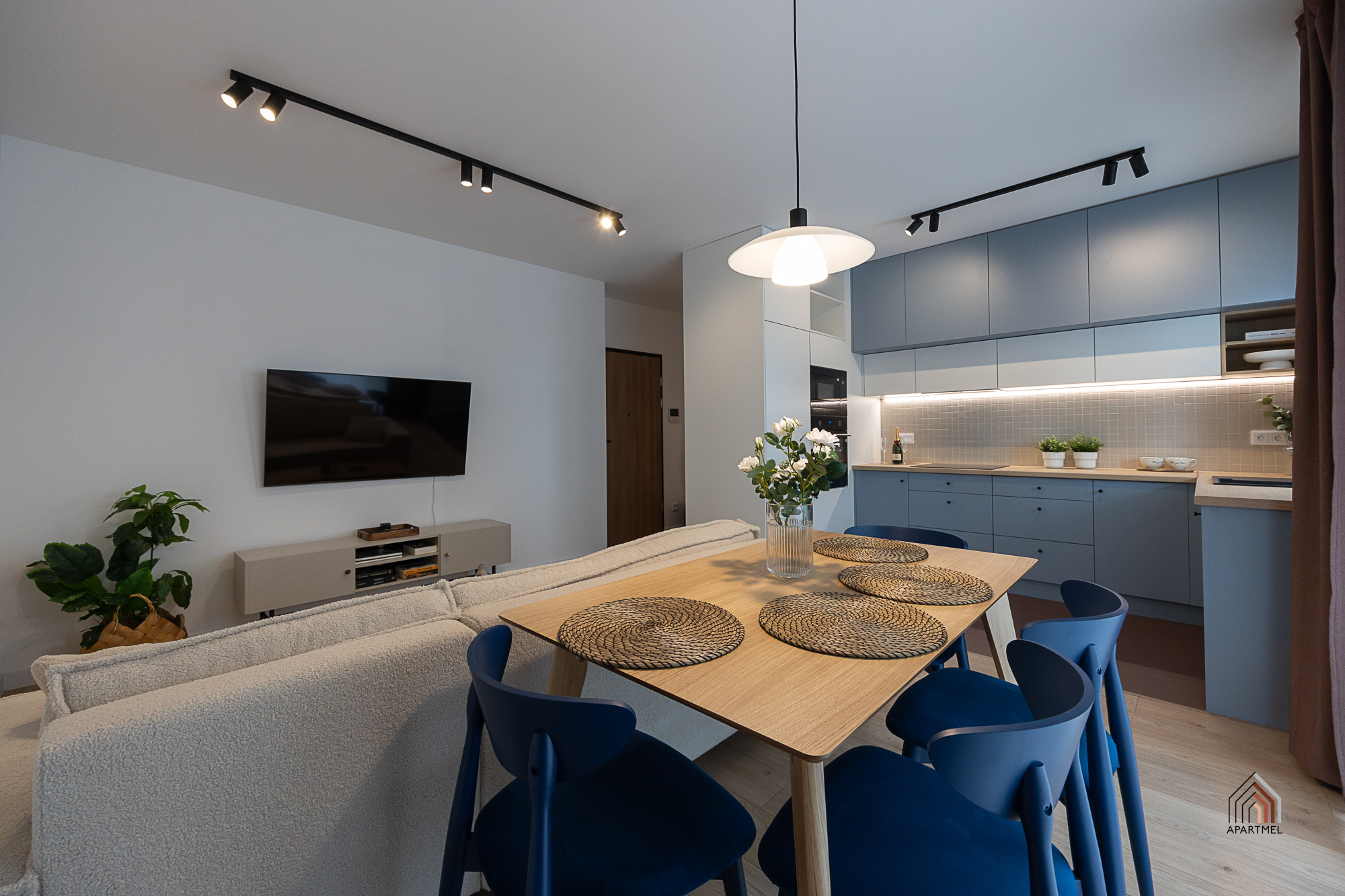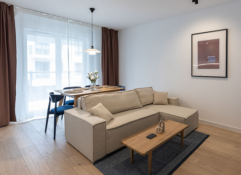 Wygodna i stylowa przestrzeń pokoju dziennego zachwyca ascetyczną gamą barw. To wnętrze dla osób świadomych swojego gustu i upodobań. Kolory biały i grafitowy są tu przewodnim motywem aranżacji. Jasna, otwarta przestrzeń pozwala na dobrą komunikację w trakcie różnych, codziennych czynności. W pokoju znajduje się wygodna, rozkładana do spania kanapa, szafka RTV, telewizor 55" Samsung 4K Smart TV, stolik kawowy, dywan, zasłony i żaluzje, prostokątny stół oraz 4 krzesła.