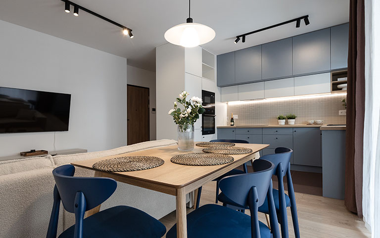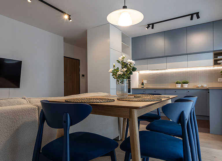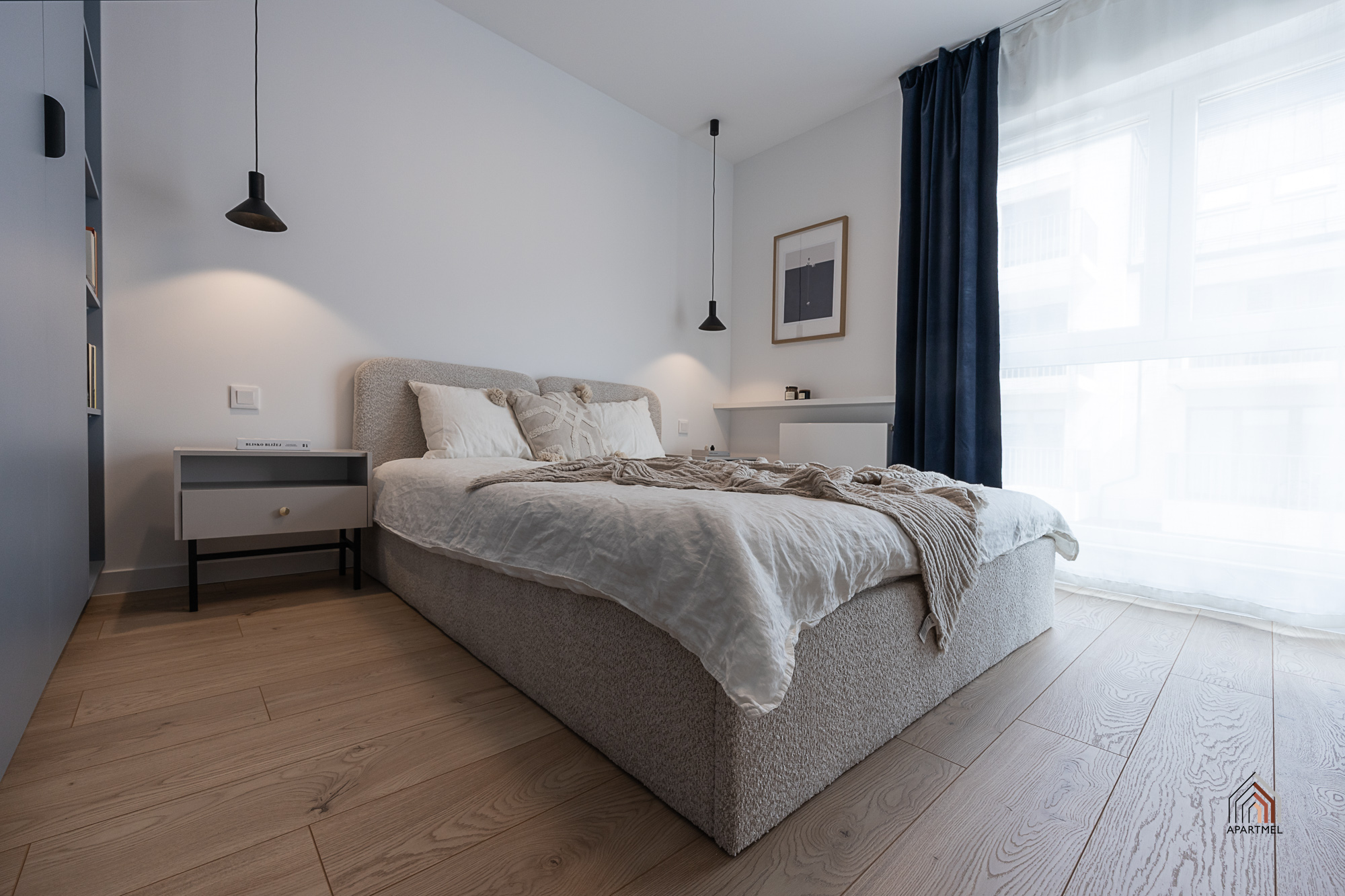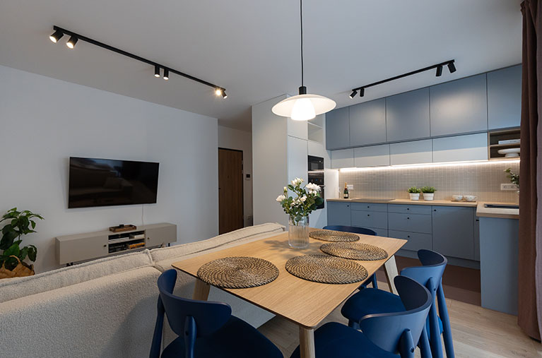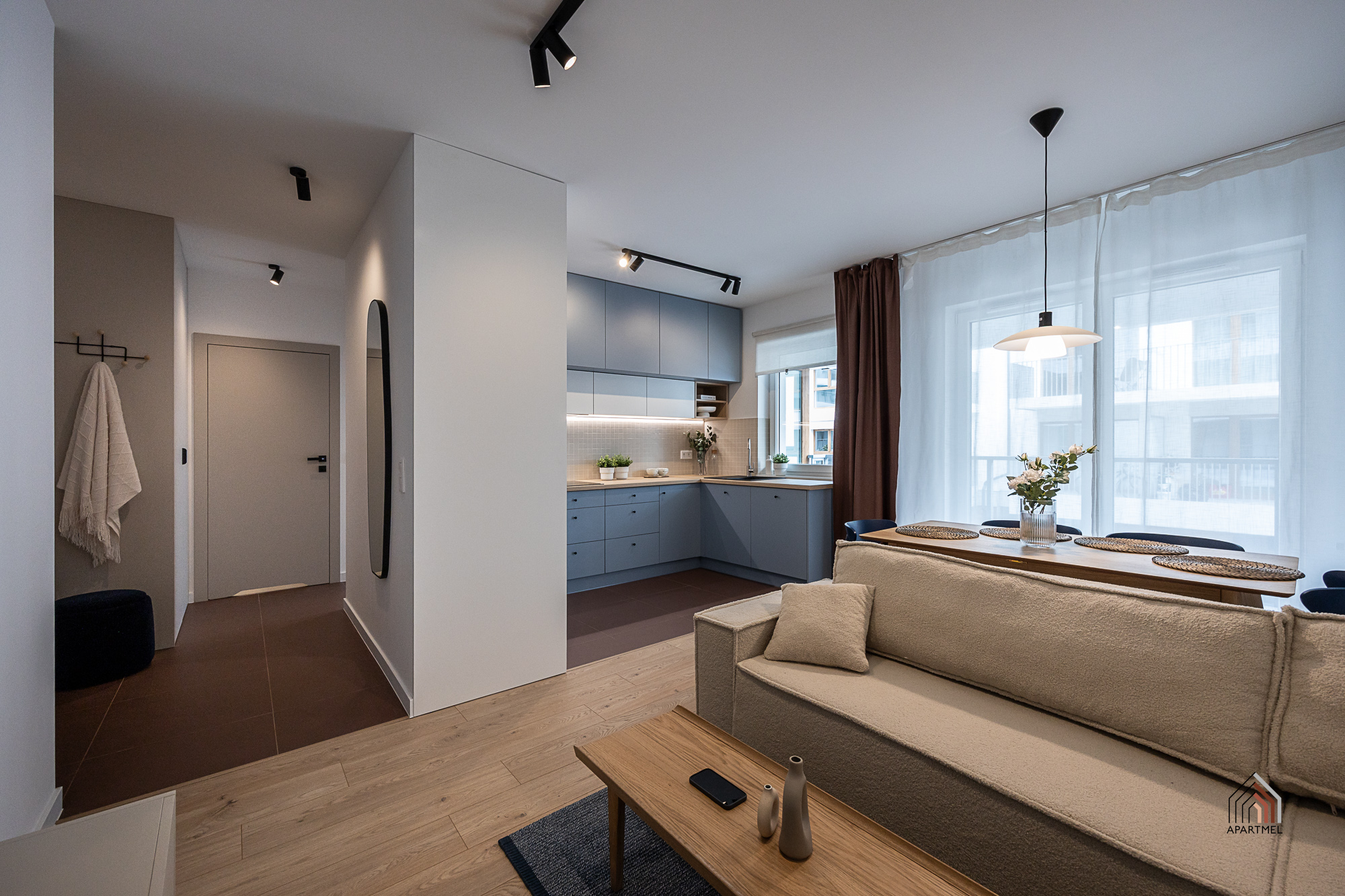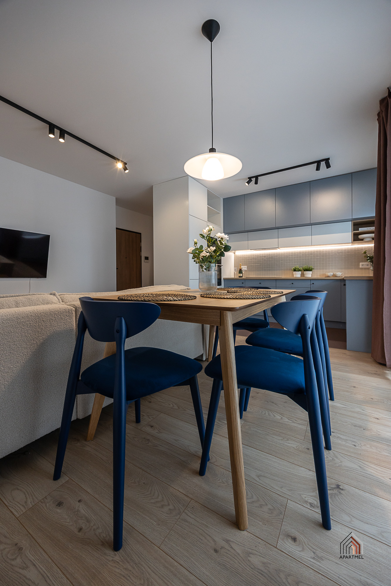 Wygodna i stylowa przestrzeń pokoju dziennego zachwyca ascetyczną gamą barw. To wnętrze dla osób świadomych swojego gustu i upodobań. Kolory biały i grafitowy są tu przewodnim motywem aranżacji. Jasna, otwarta przestrzeń pozwala na dobrą komunikację w trakcie różnych, codziennych czynności. W pokoju znajduje się wygodna, rozkładana do spania kanapa, szafka RTV, telewizor 55" Samsung 4K Smart TV, stolik kawowy, dywan, zasłony i żaluzje, prostokątny stół oraz 4 krzesła.