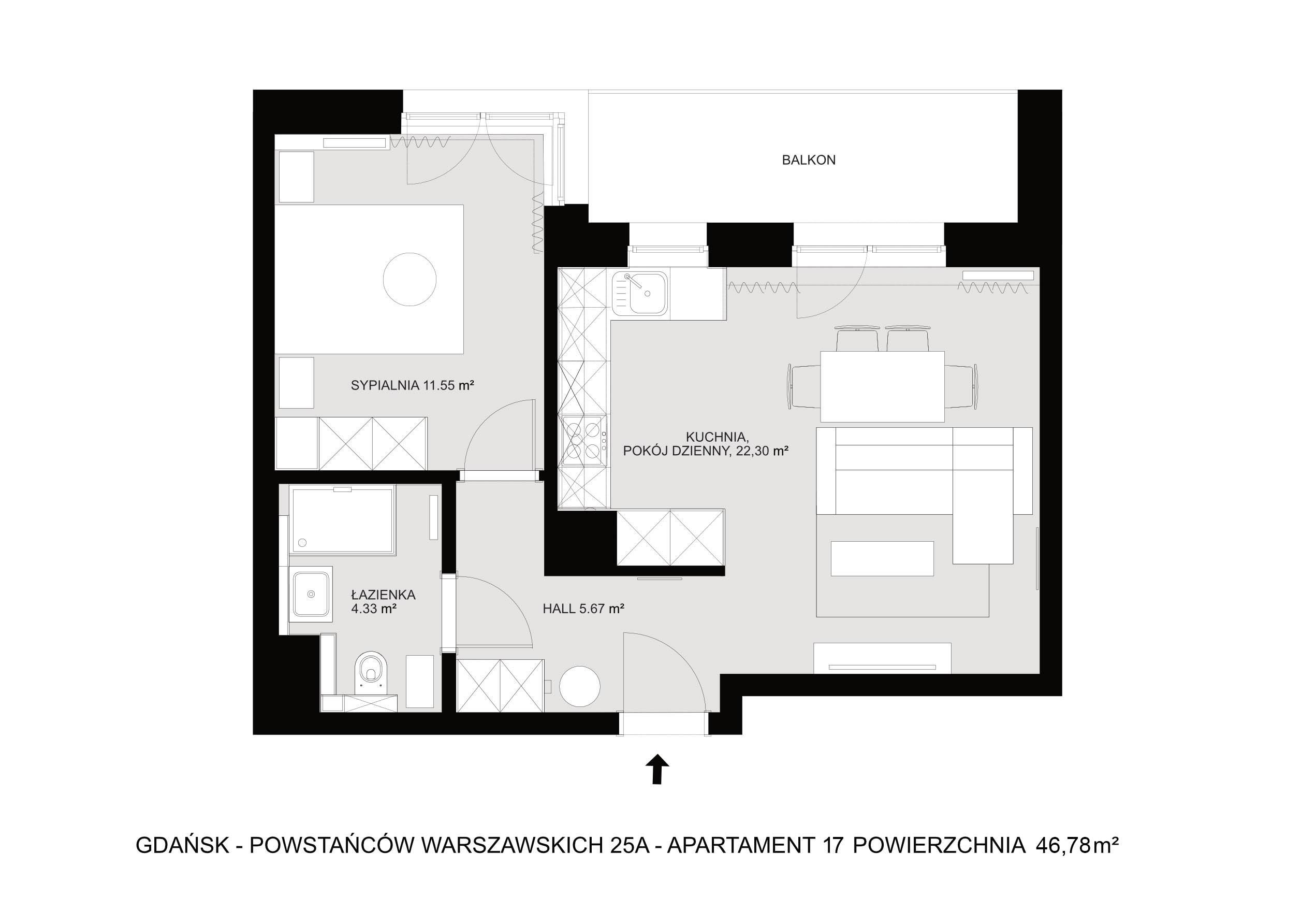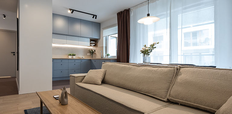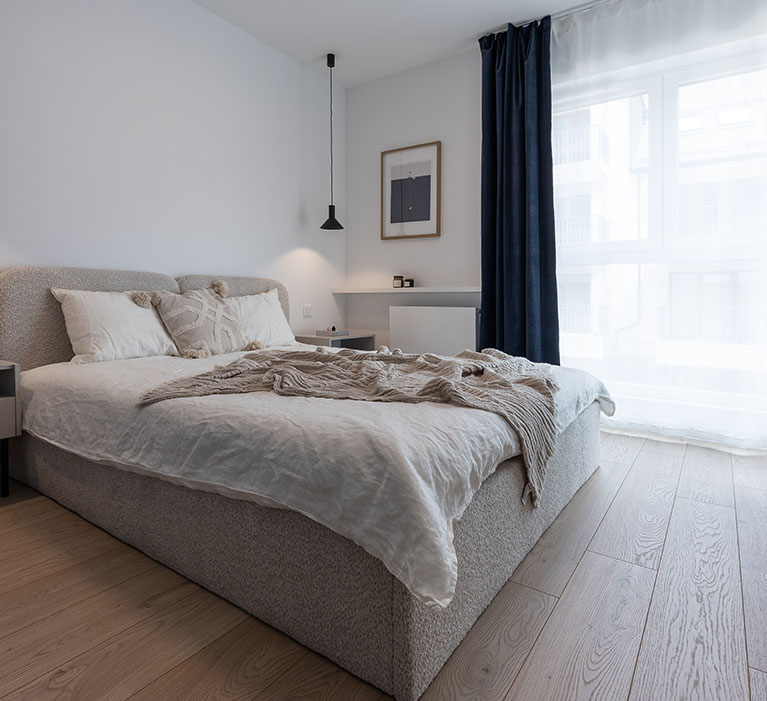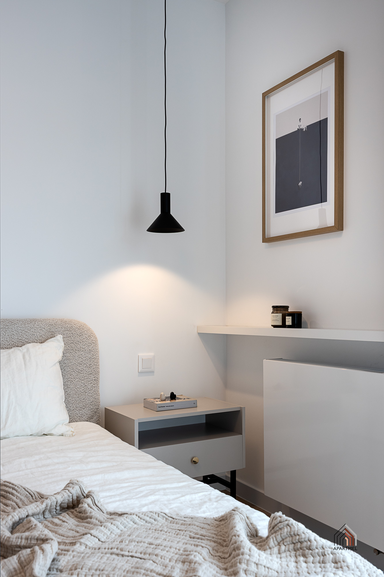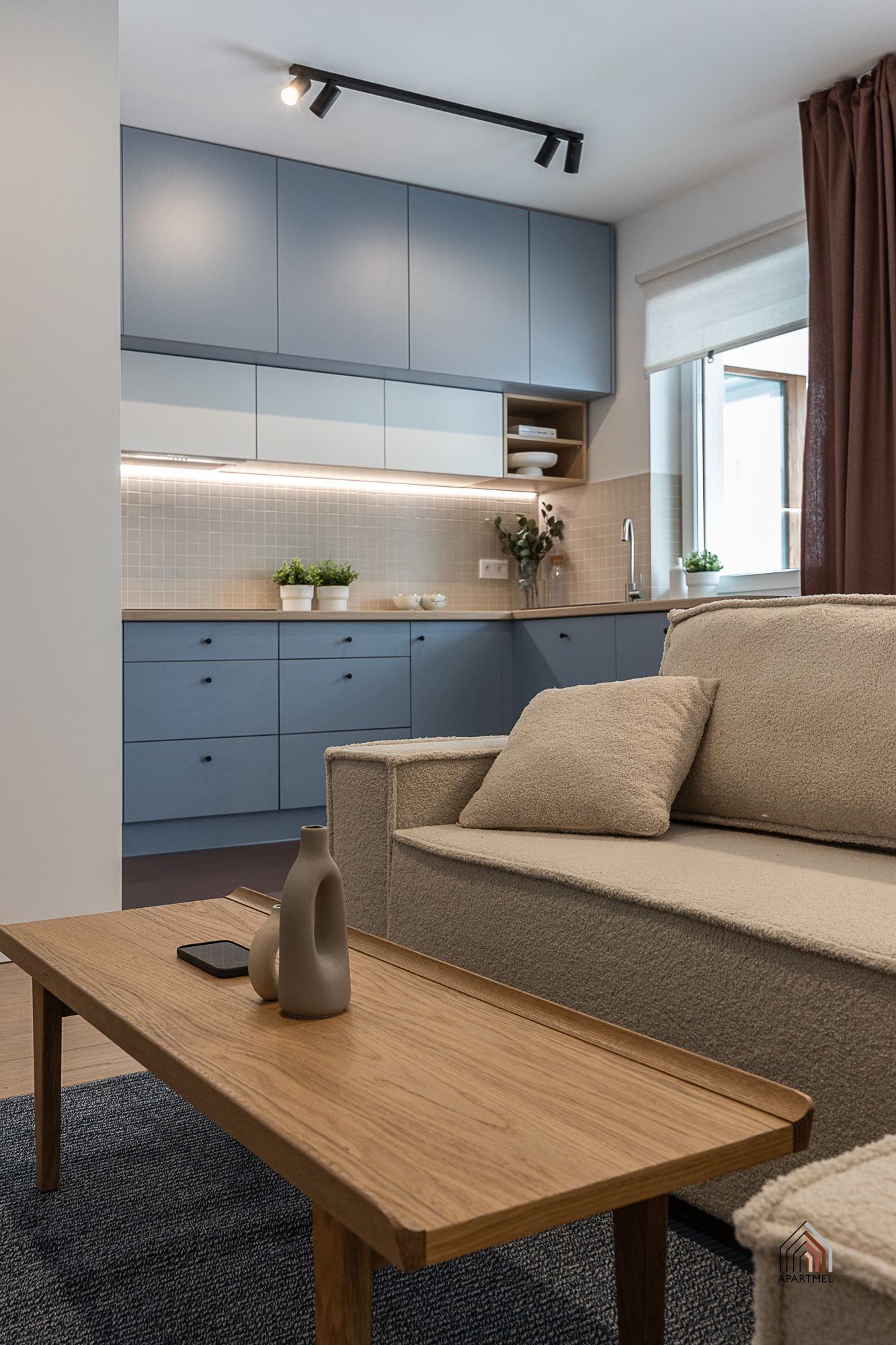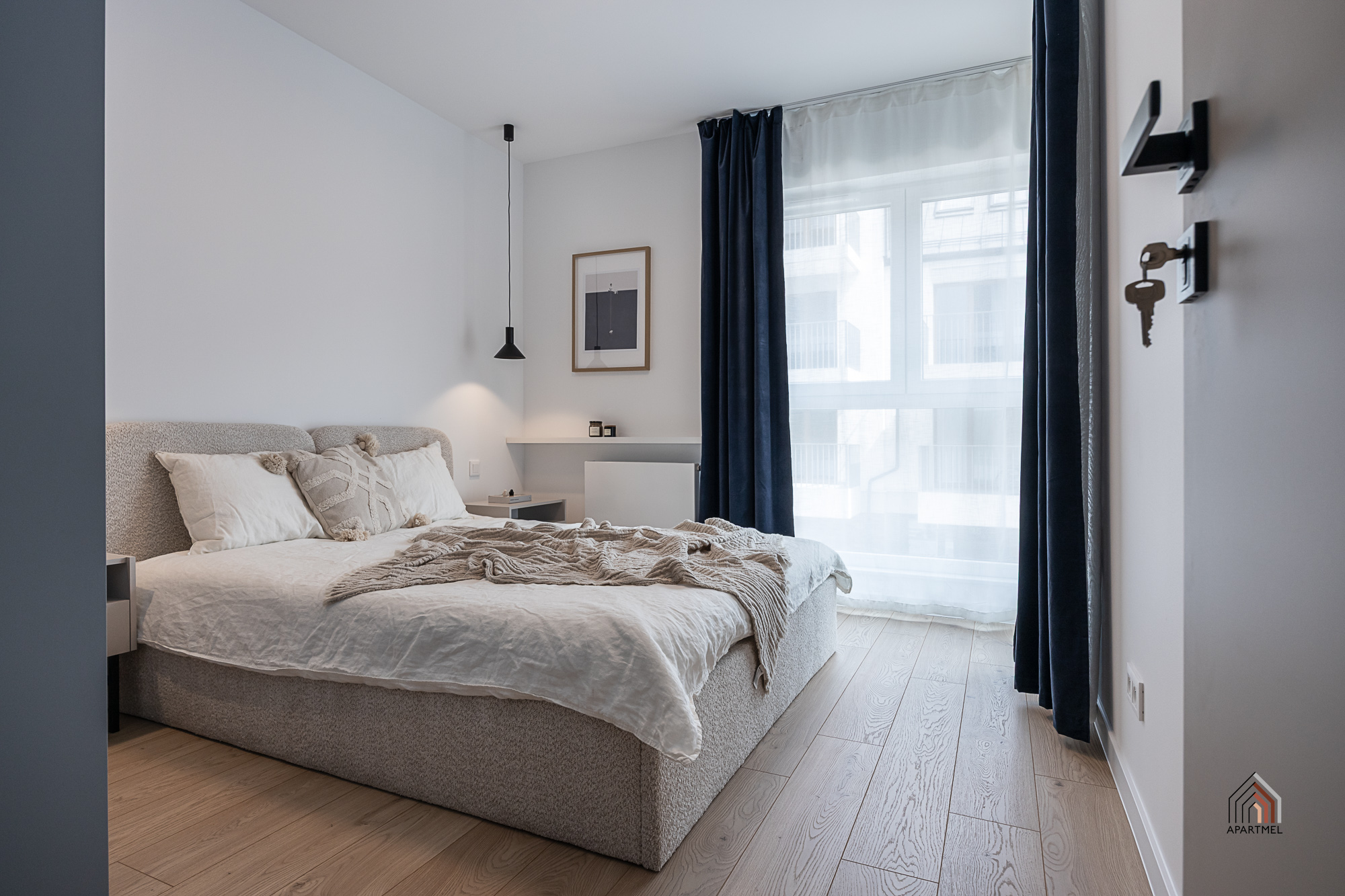 Wygodna i stylowa przestrzeń pokoju dziennego zachwyca ascetyczną gamą barw. To wnętrze dla osób świadomych swojego gustu i upodobań. Kolory biały i grafitowy są tu przewodnim motywem aranżacji. Jasna, otwarta przestrzeń pozwala na dobrą komunikację w trakcie różnych, codziennych czynności. W pokoju znajduje się wygodna, rozkładana do spania kanapa, szafka RTV, telewizor 55" Samsung 4K Smart TV, stolik kawowy, dywan, zasłony i żaluzje, prostokątny stół oraz 4 krzesła.