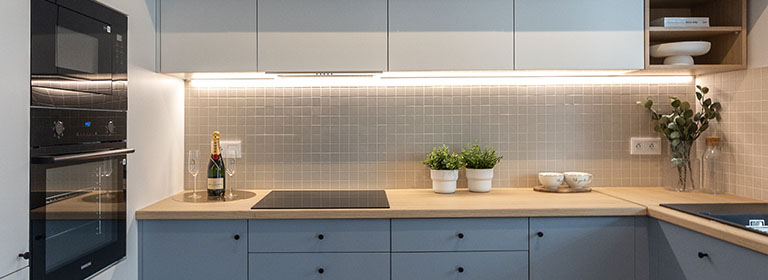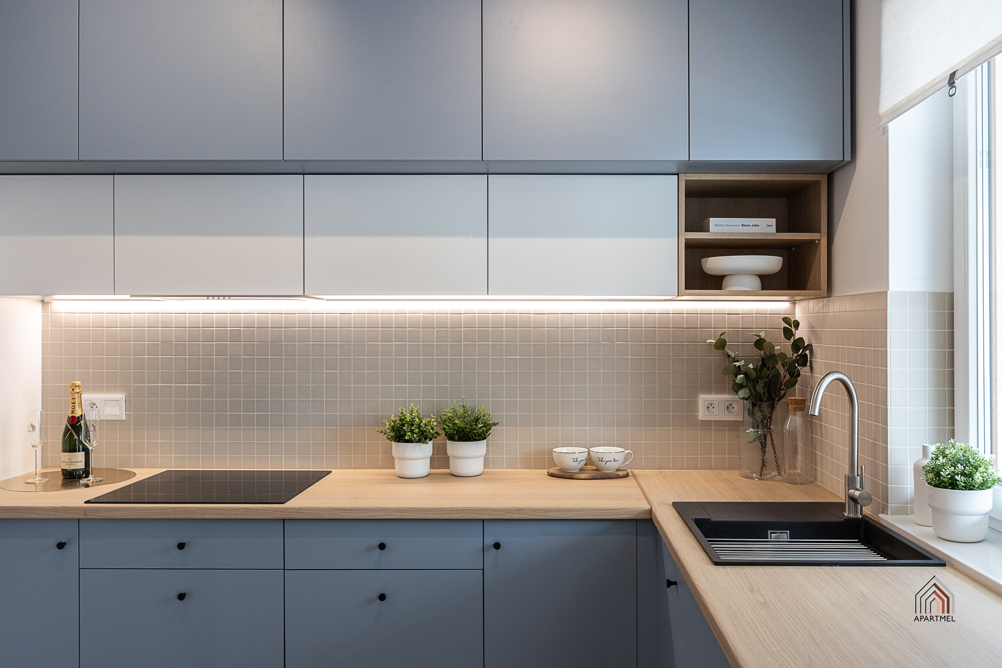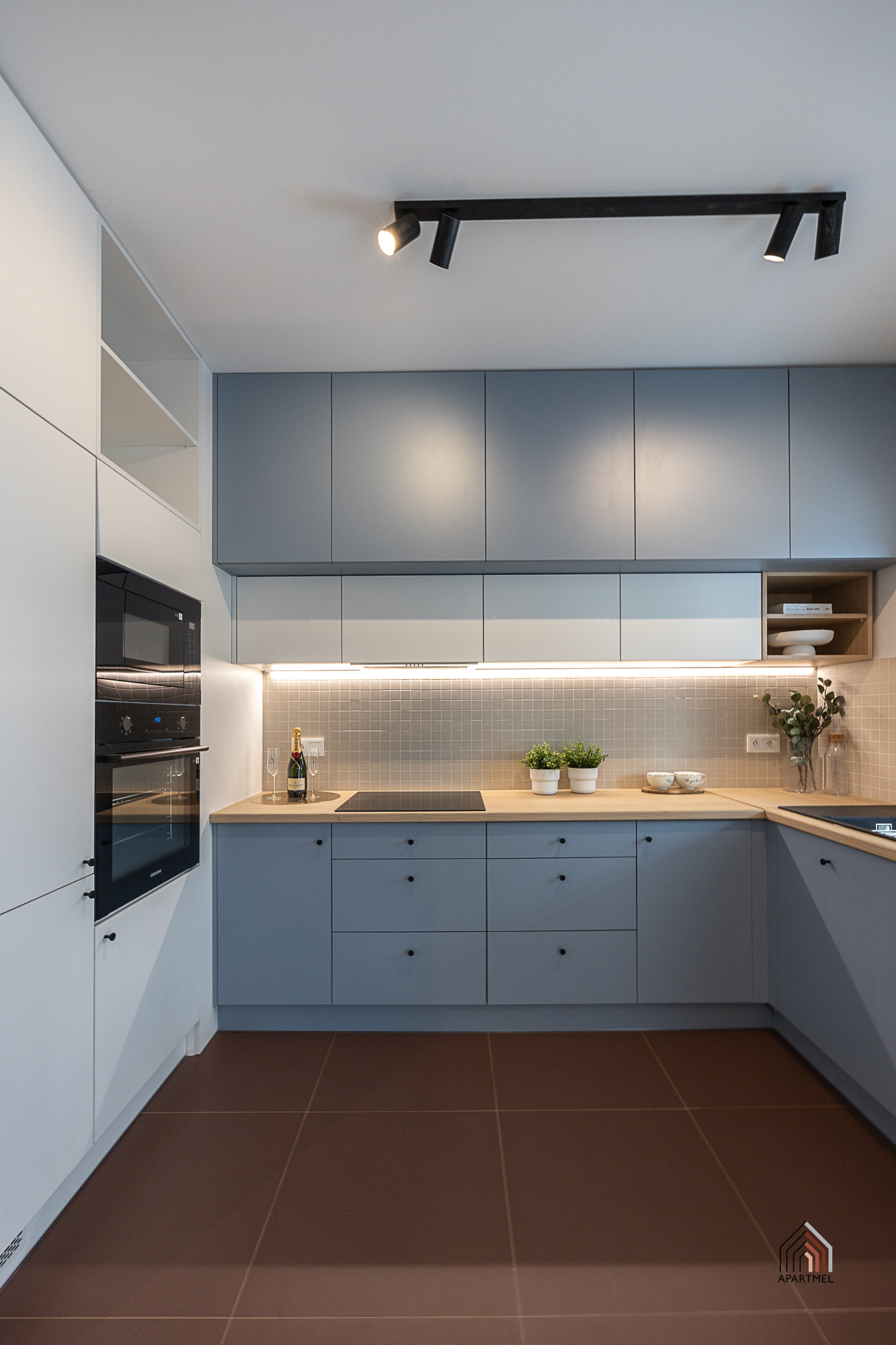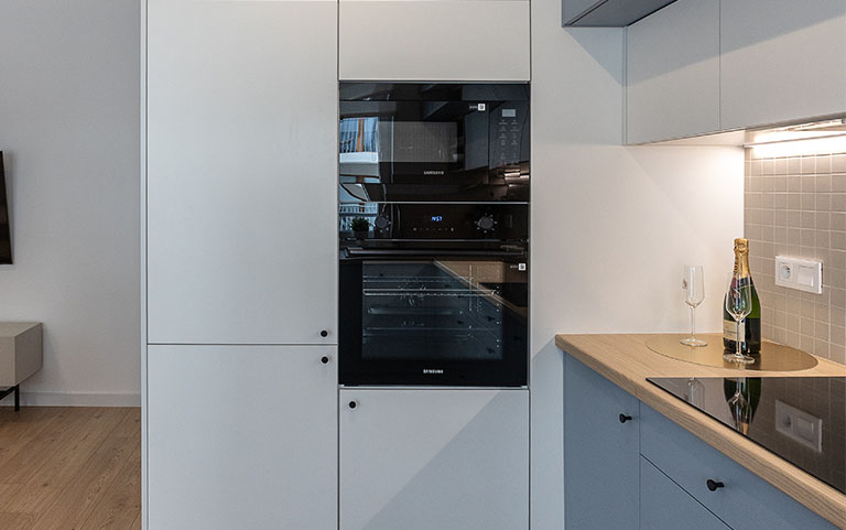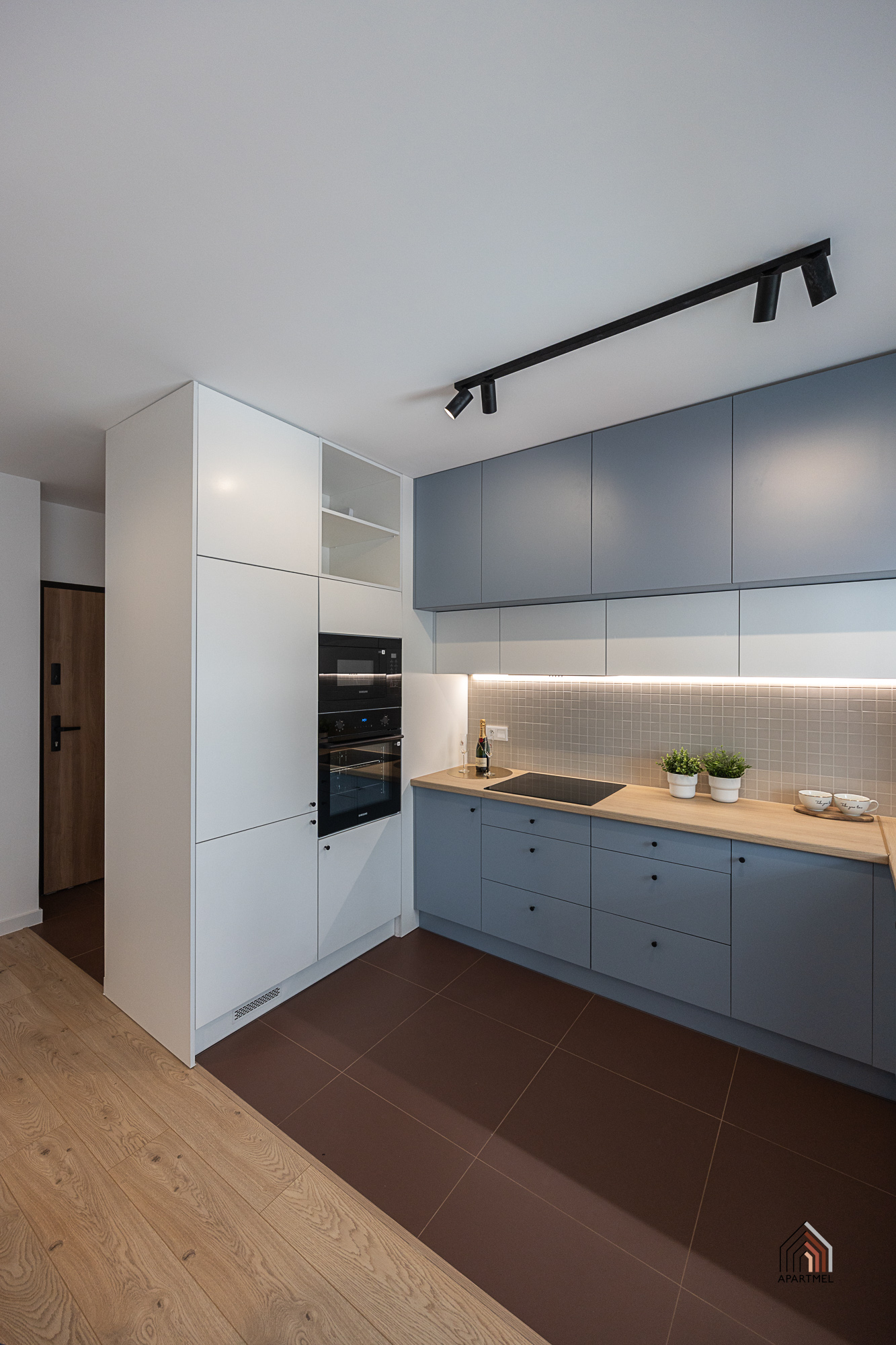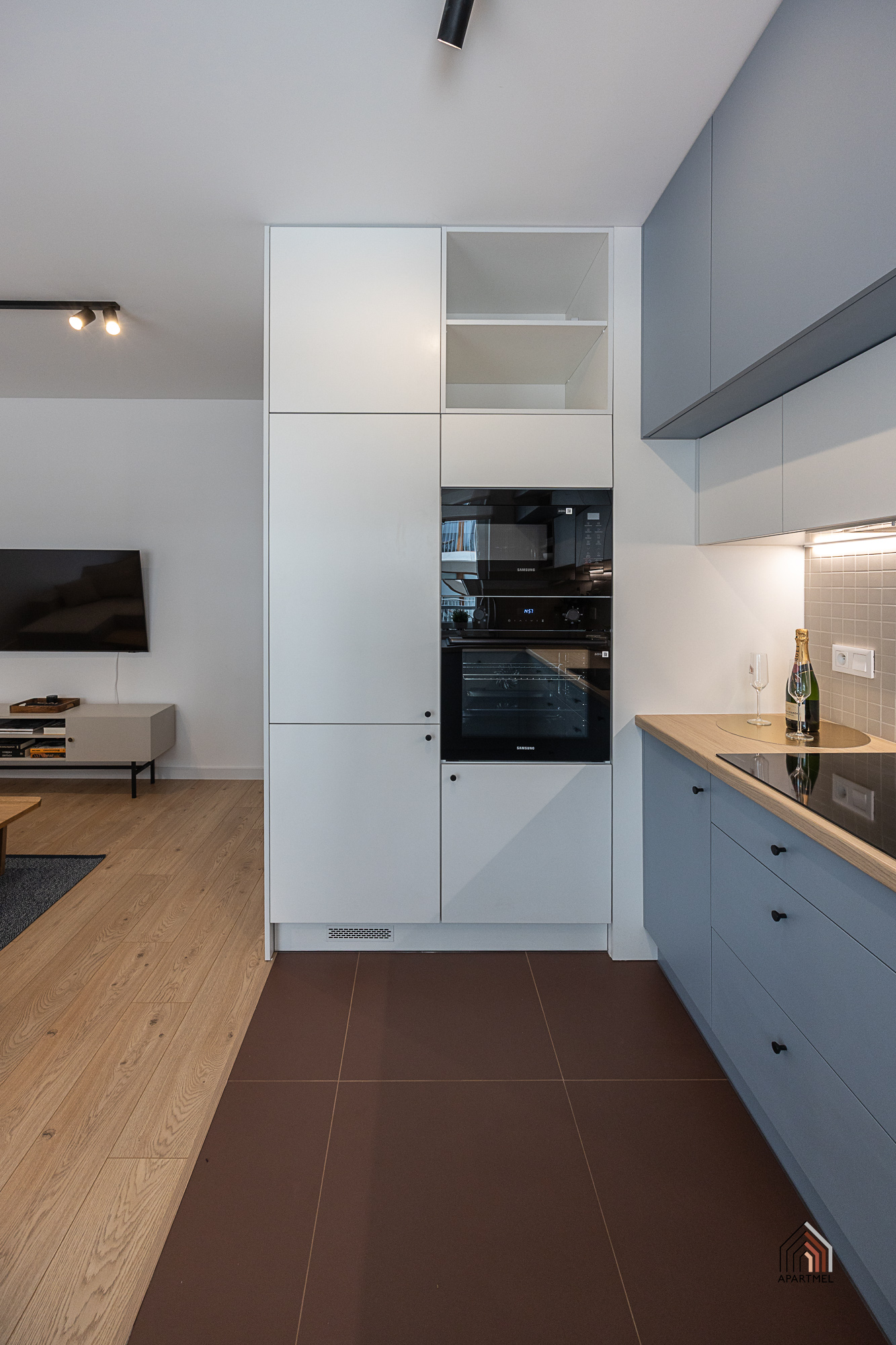 W kuchni ergonomiczna zabudowa meblowa, lodówka z zamrażarką, piekarnik, płyta indukcyjna, okap i zmywarka. Dodatkowo podkładki, sztućce, talerze, miski, szklanki, filiżanki do herbaty, deski do krojenia, zestaw noży kuchennych, komplet garnków, komplet patelni, przybory do gotowania. Wszystkie sprzęty renomowanych marek, na gwarancji.