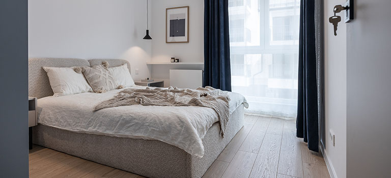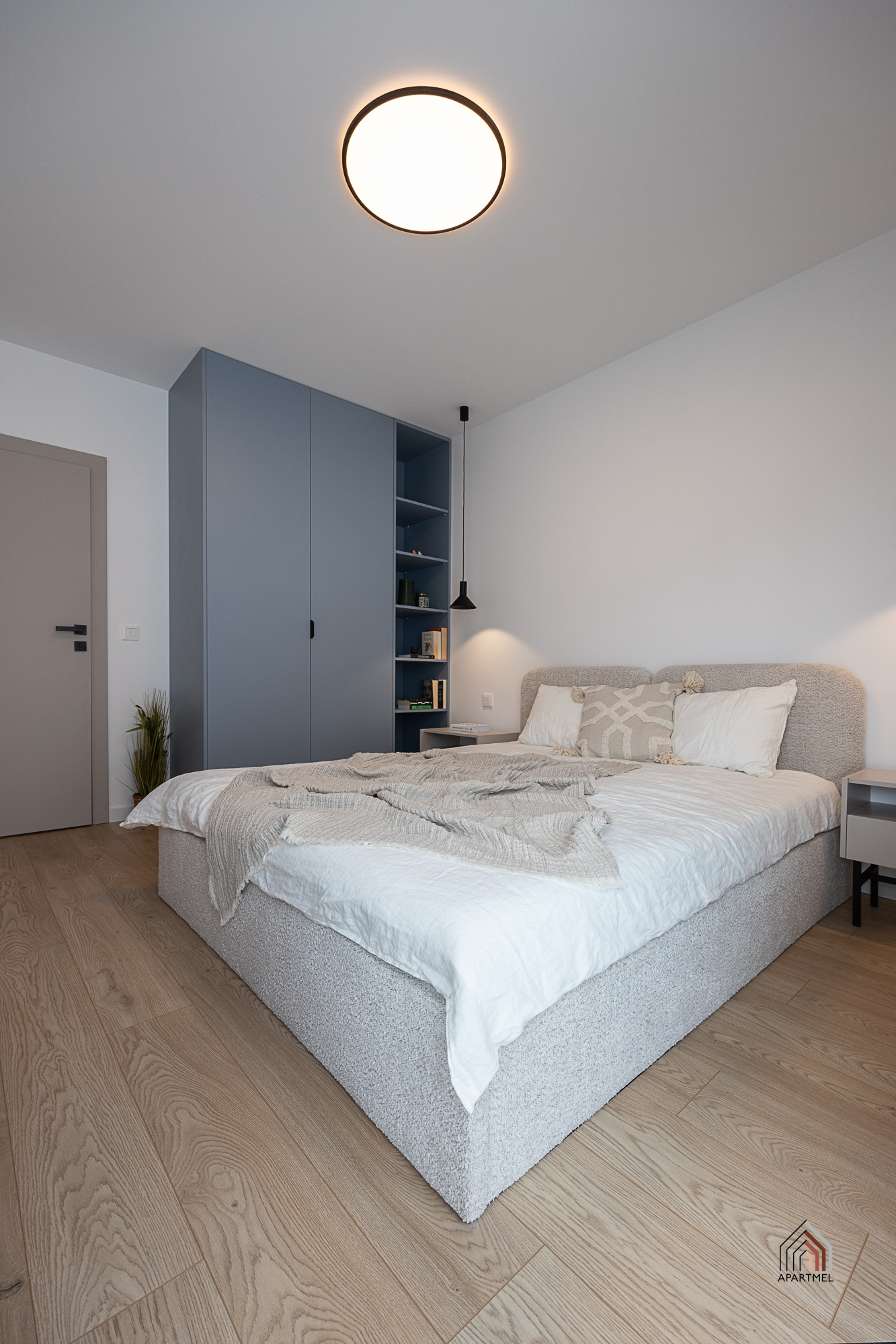 Sypialnia w stylu boho posiada wygodne łóżko kontynentalne z zagłówkiem i dużą skrzynią na pościel, a także wsad pościelowy tj. kołdra i dwie poduszki, bardzo pojemną szafę z regałem, biurko z krzesłem. Obok łóżka szafki nocne, lampki oraz gniazdka, w oknach firanki i zasłony.